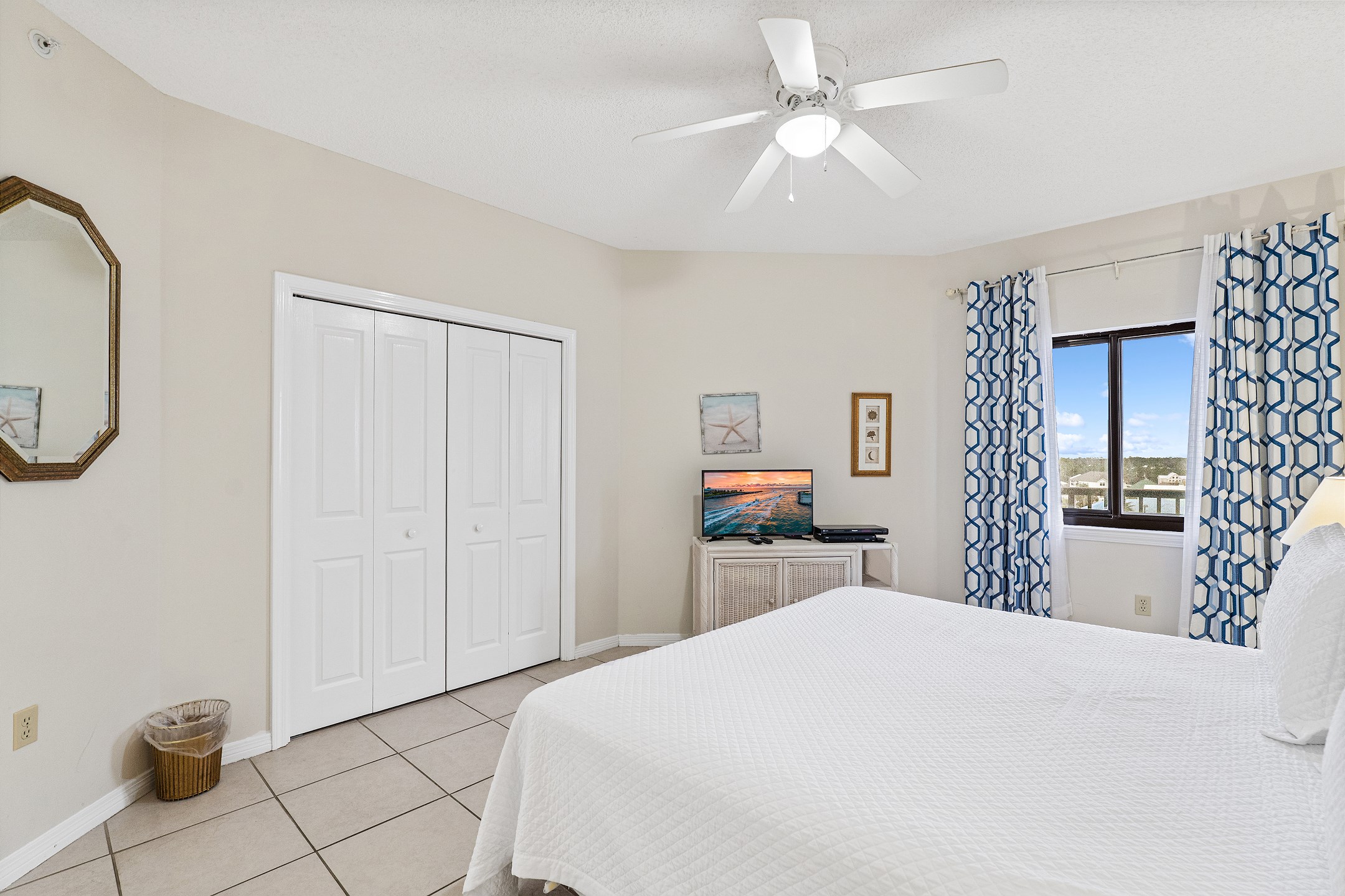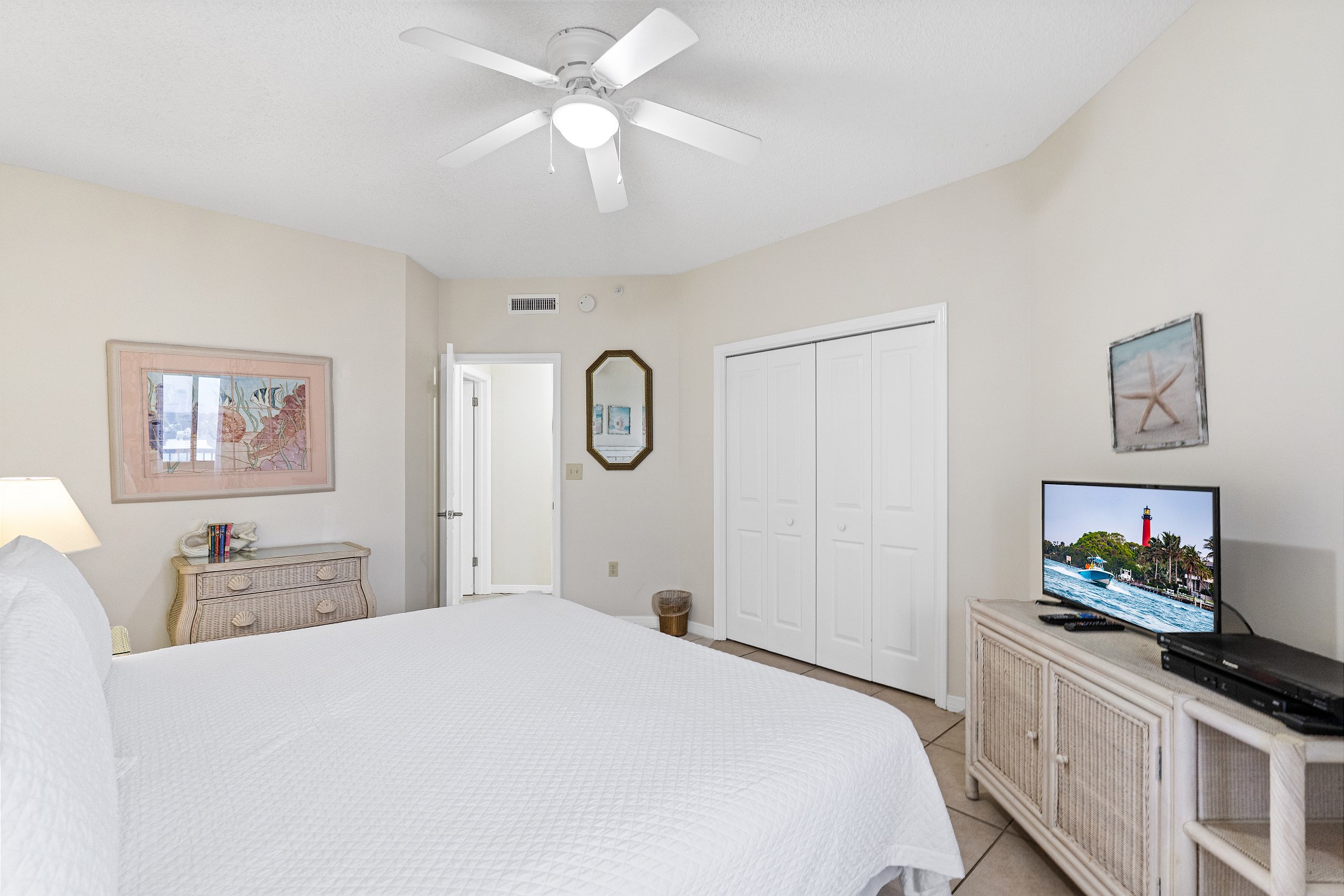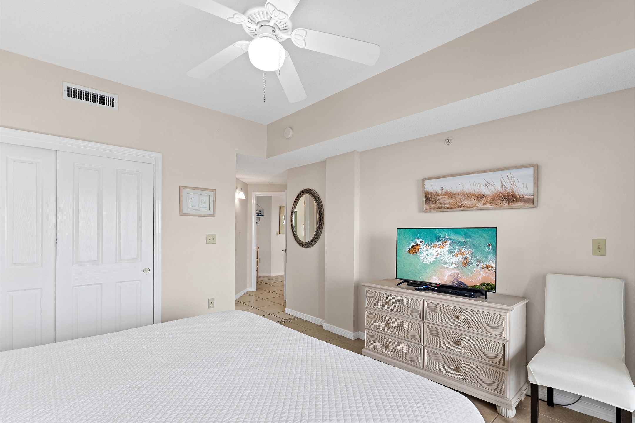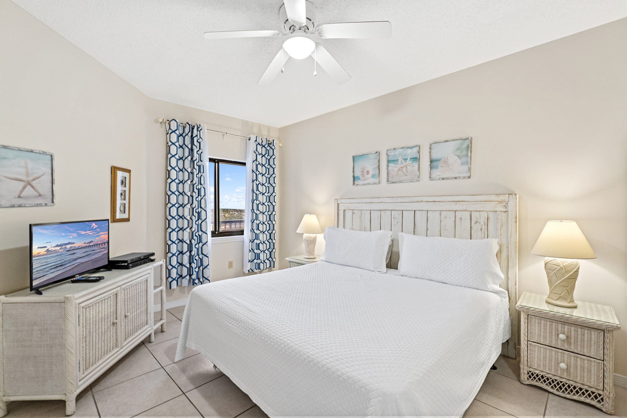 The Primary suite is an inviting retreat, complete with a plush King bed, a flat-screen TV, and an ensuite bath, promising restful nights and peaceful mornings. The second bedroom is equally comfortable, offering a King bed and a flat-screen TV, ideal for guests or family.