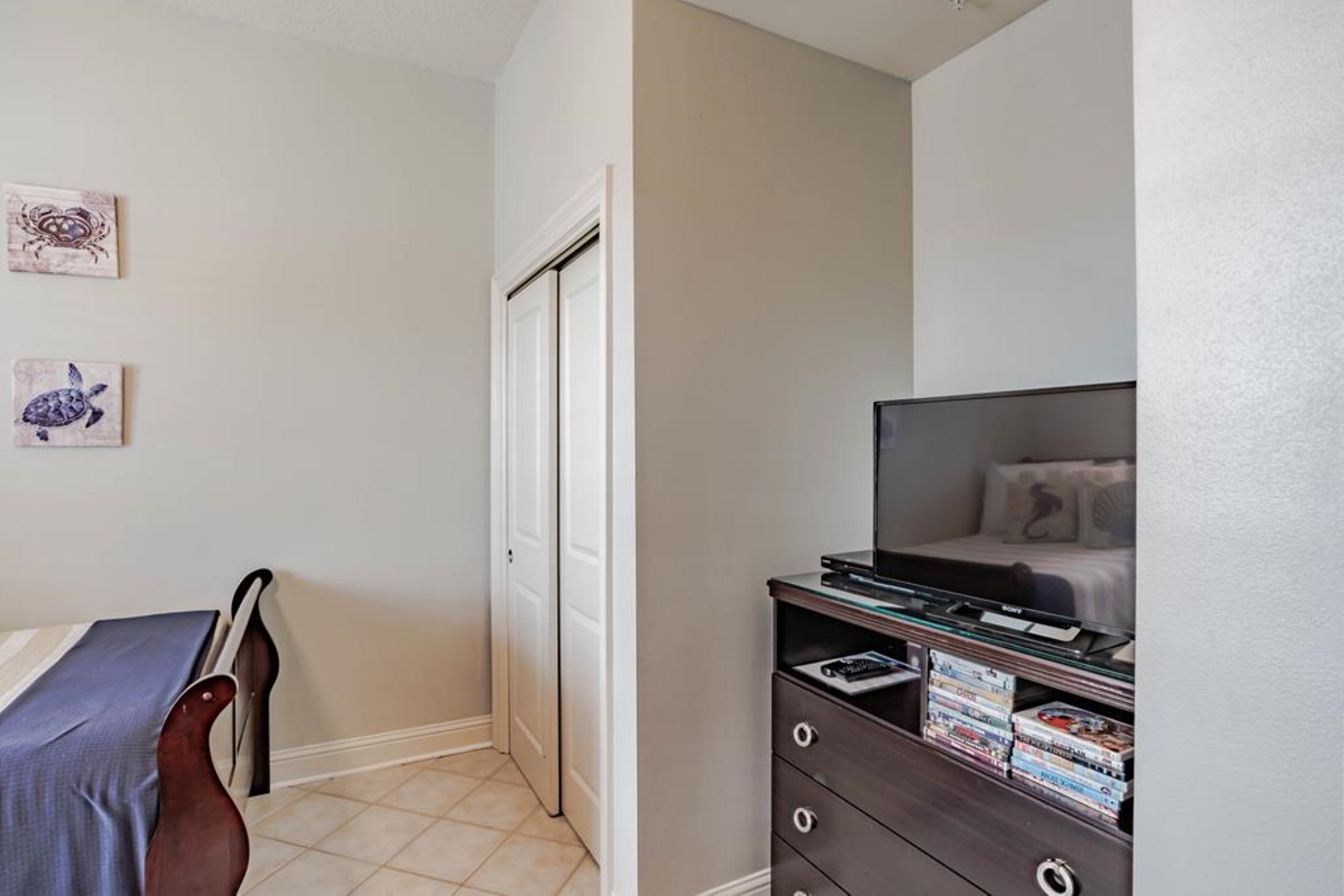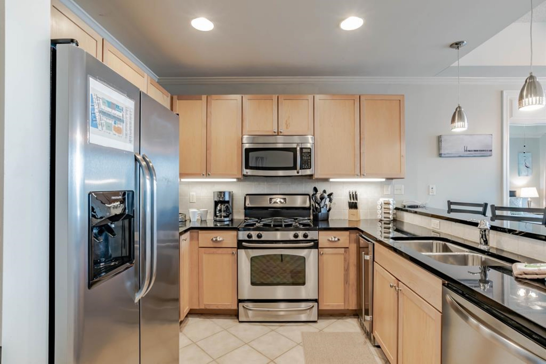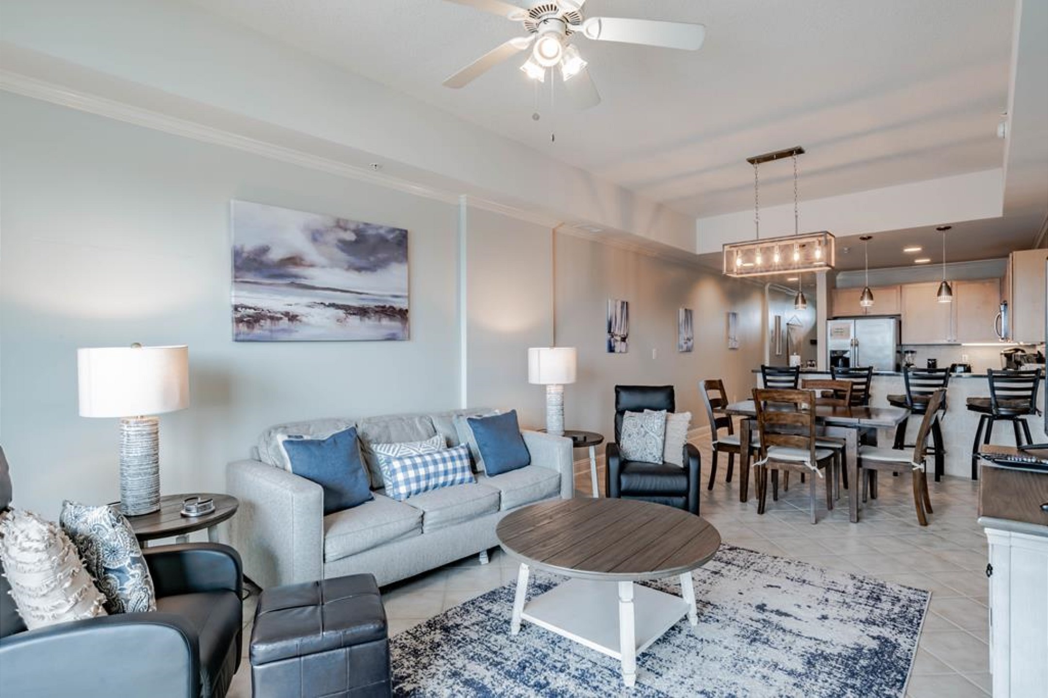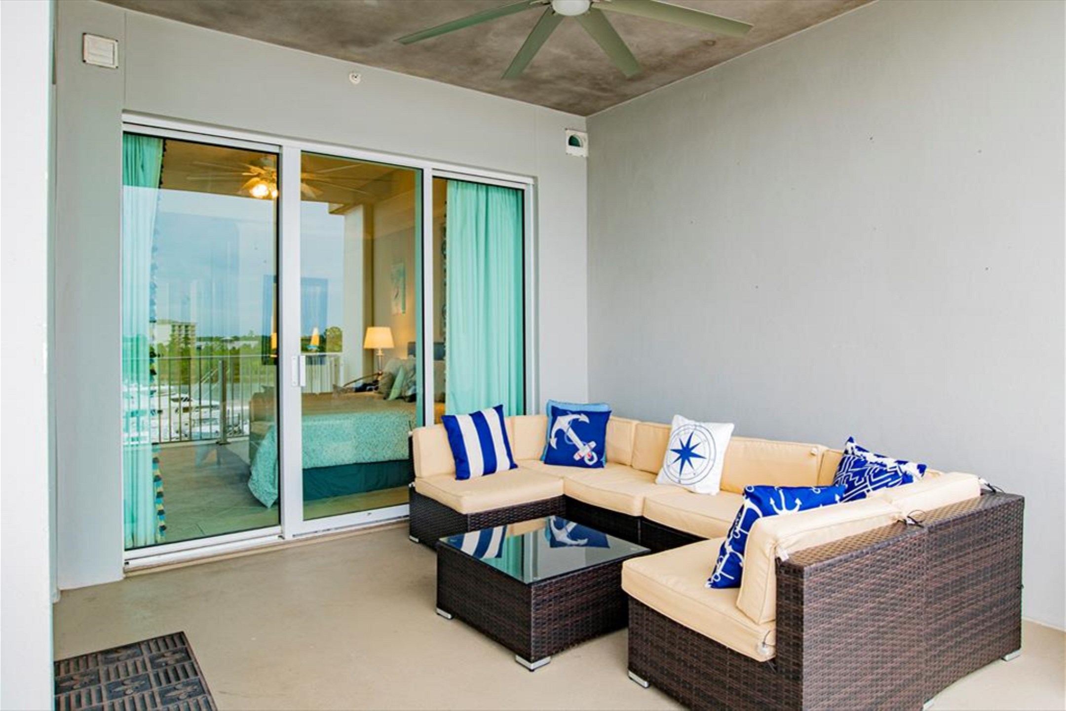 The living room features plenty of comfortable seating, a flat screen TV, and a sofa sleeper, with easy access to the spacious private balcony overlooking the bay. It is the perfect place to unwind after a day of exploring or enjoying the water.