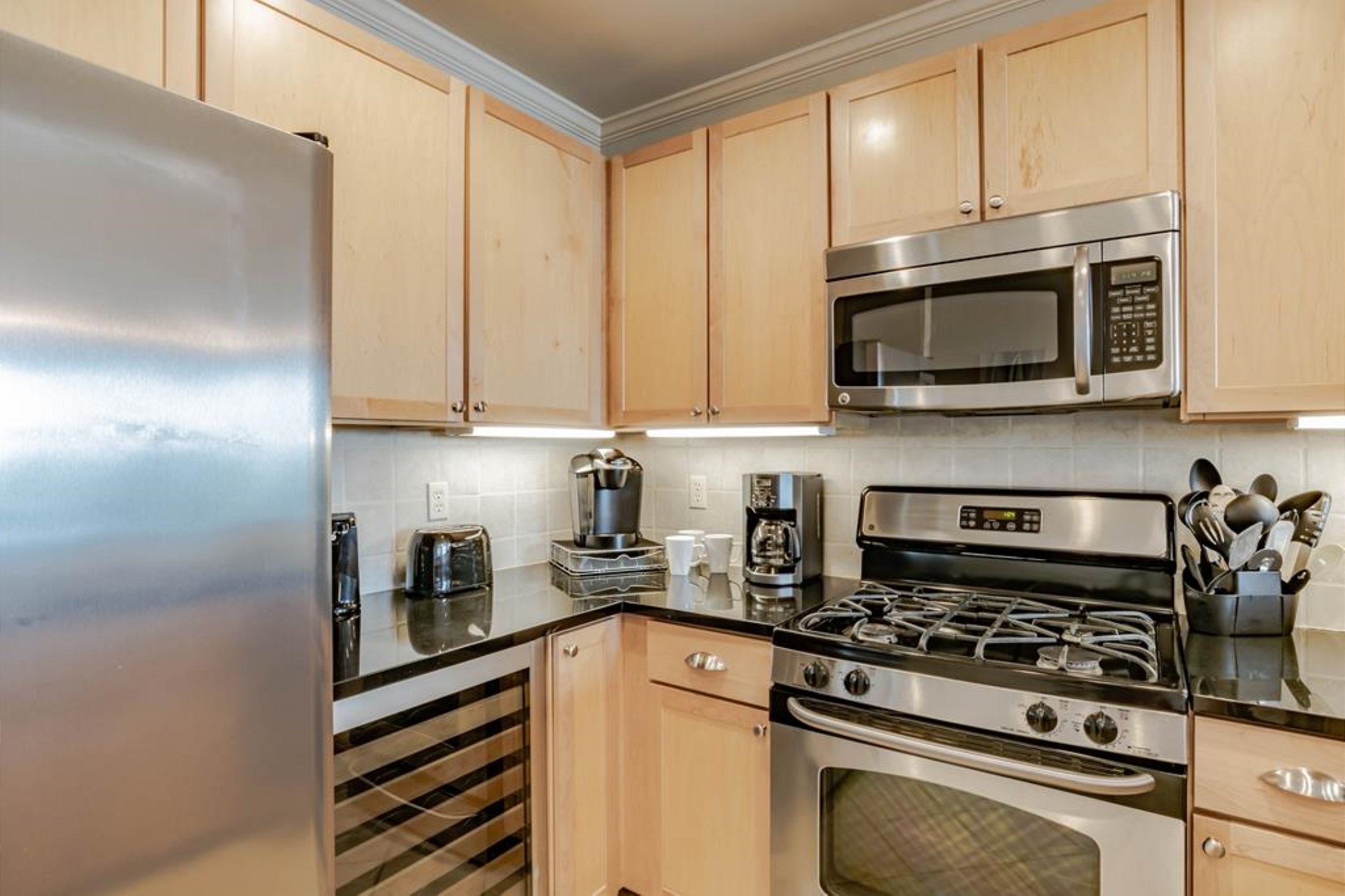The fully equipped kitchen includes stainless steel appliances, granite countertops, and a large dining table, making it easy to prepare and enjoy meals together.
