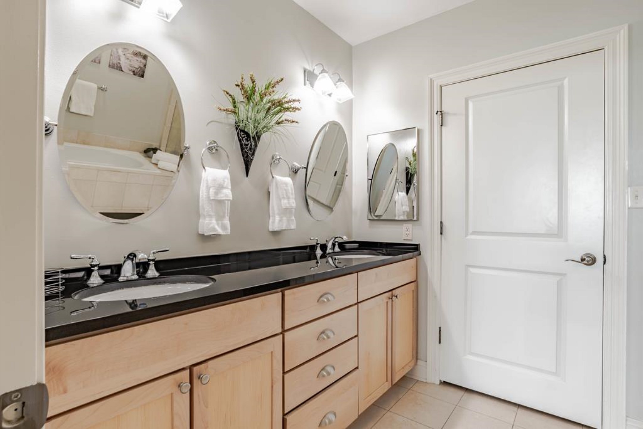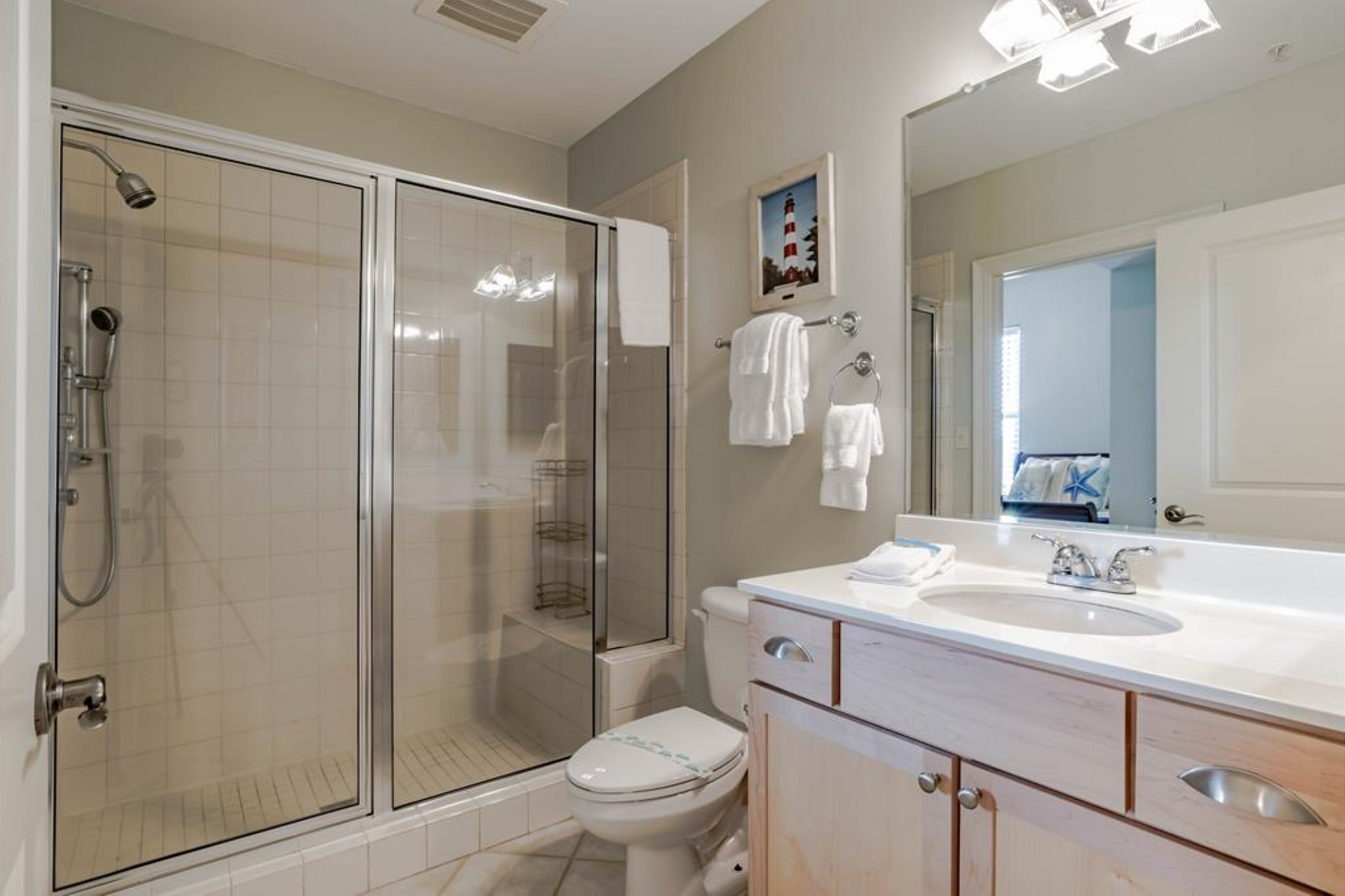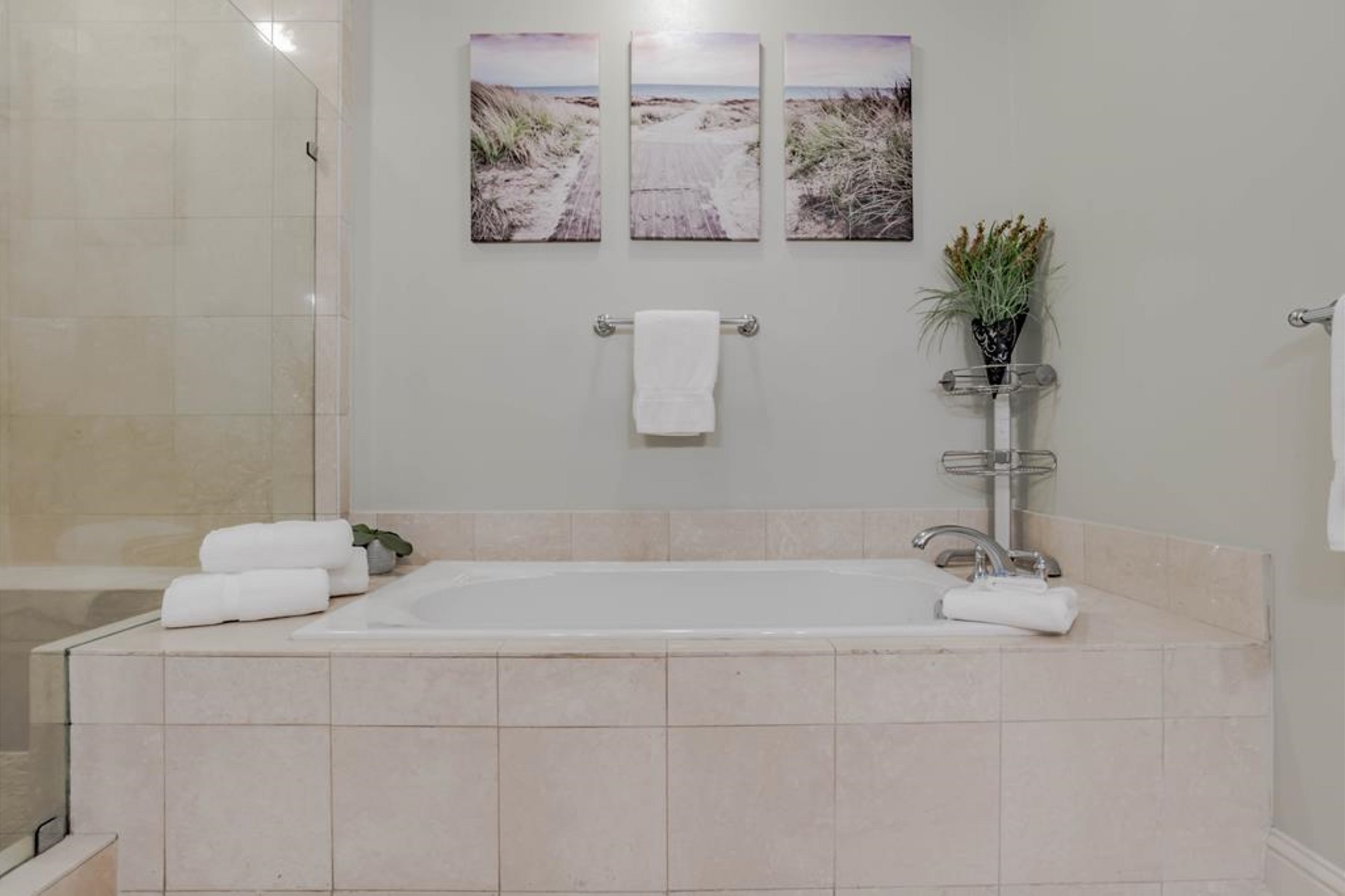 The primary bedroom offers a king bed, flat screen TV, a desk area, and private balcony access. The ensuite bathroom features a dual sink vanity, a tiled walk in shower, and a soaking tub for added comfort. The guest bedroom includes two full size beds and convenient access to the second bathroom, which is shared with the hall and features a large tiled walk in shower. A washer and dryer in the unit provide extra convenience during your stay.