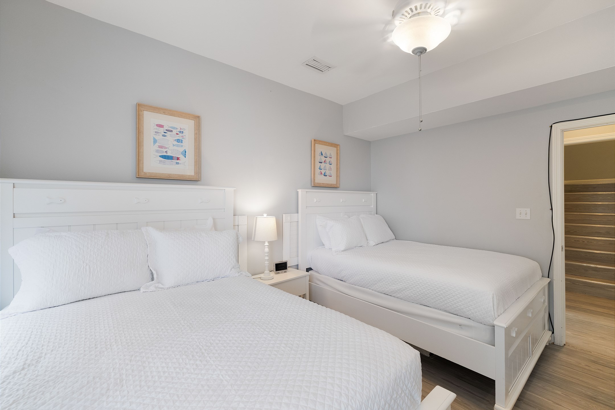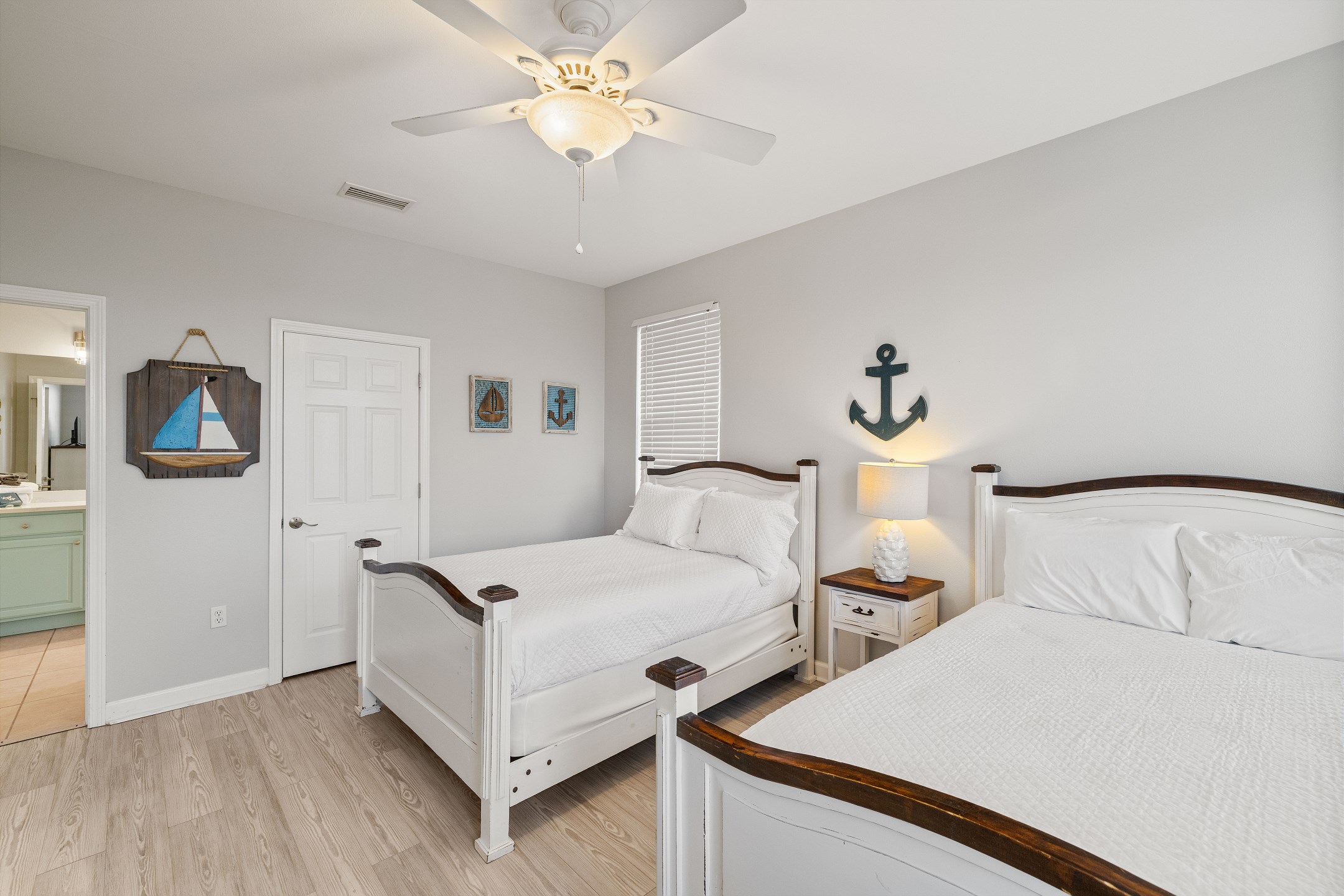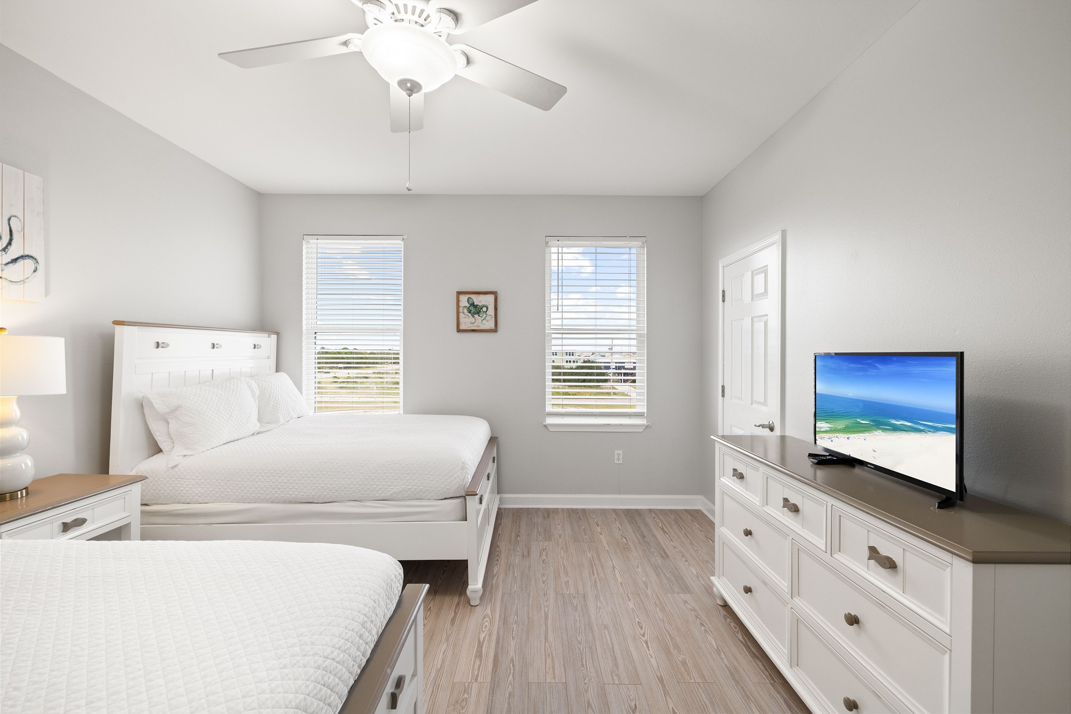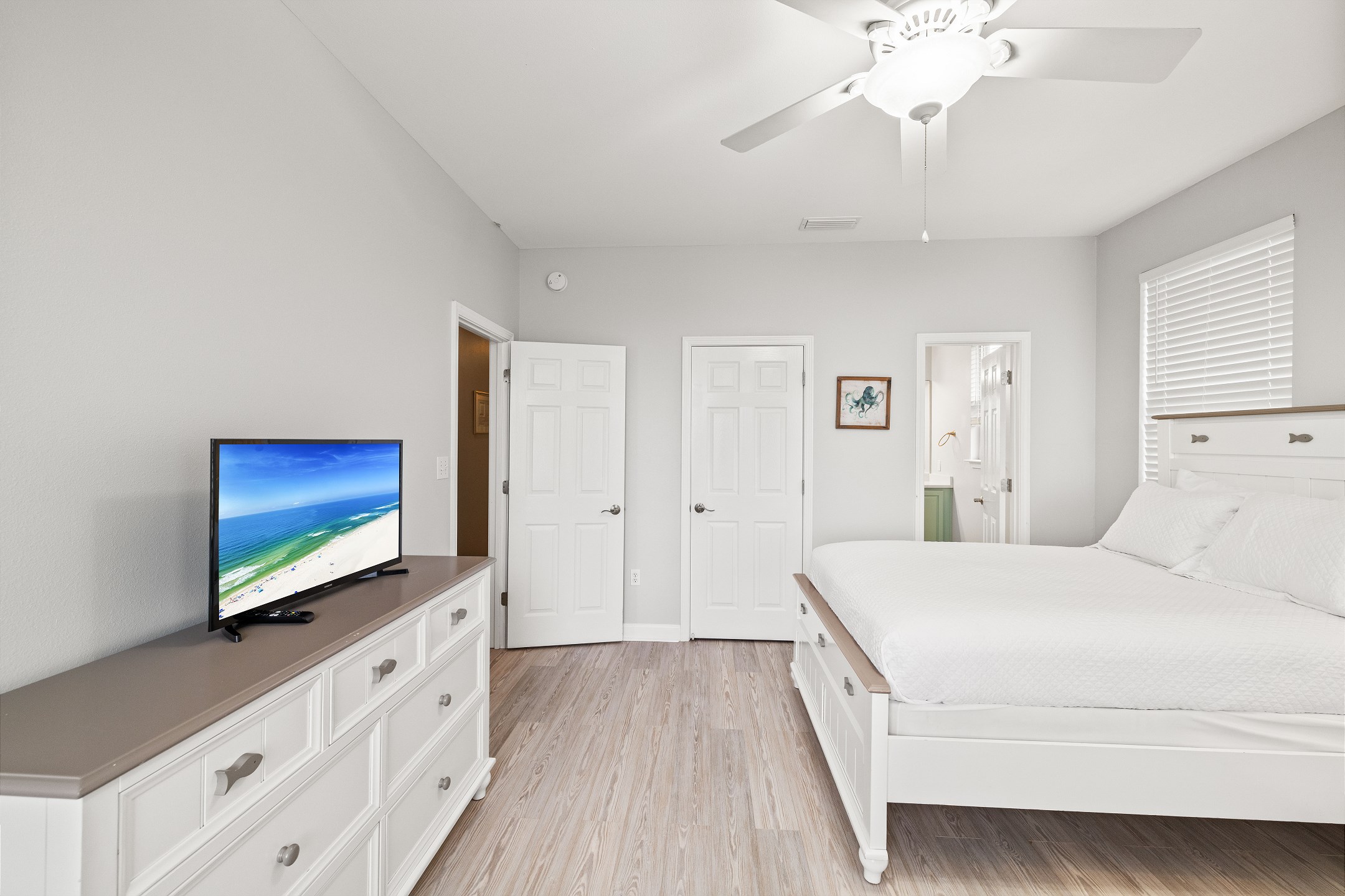 Three bedrooms are located on the main level, each with its own private bathroom and TV. The first bedroom has a king bed and ensuite bath, while the other two bedrooms each feature two full beds and private bathrooms with tub and shower combos. A convenient half bathroom is also located in the hallway.