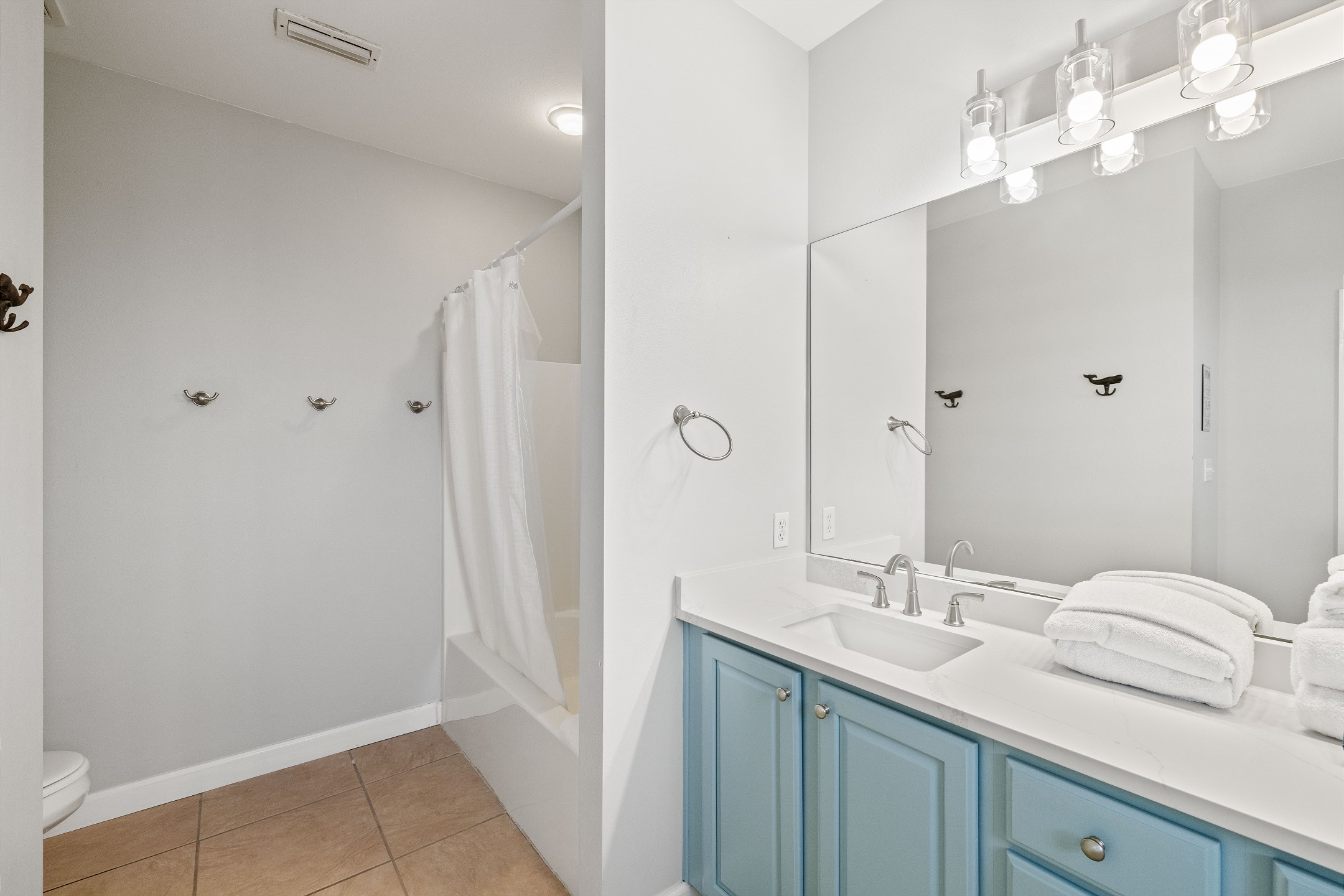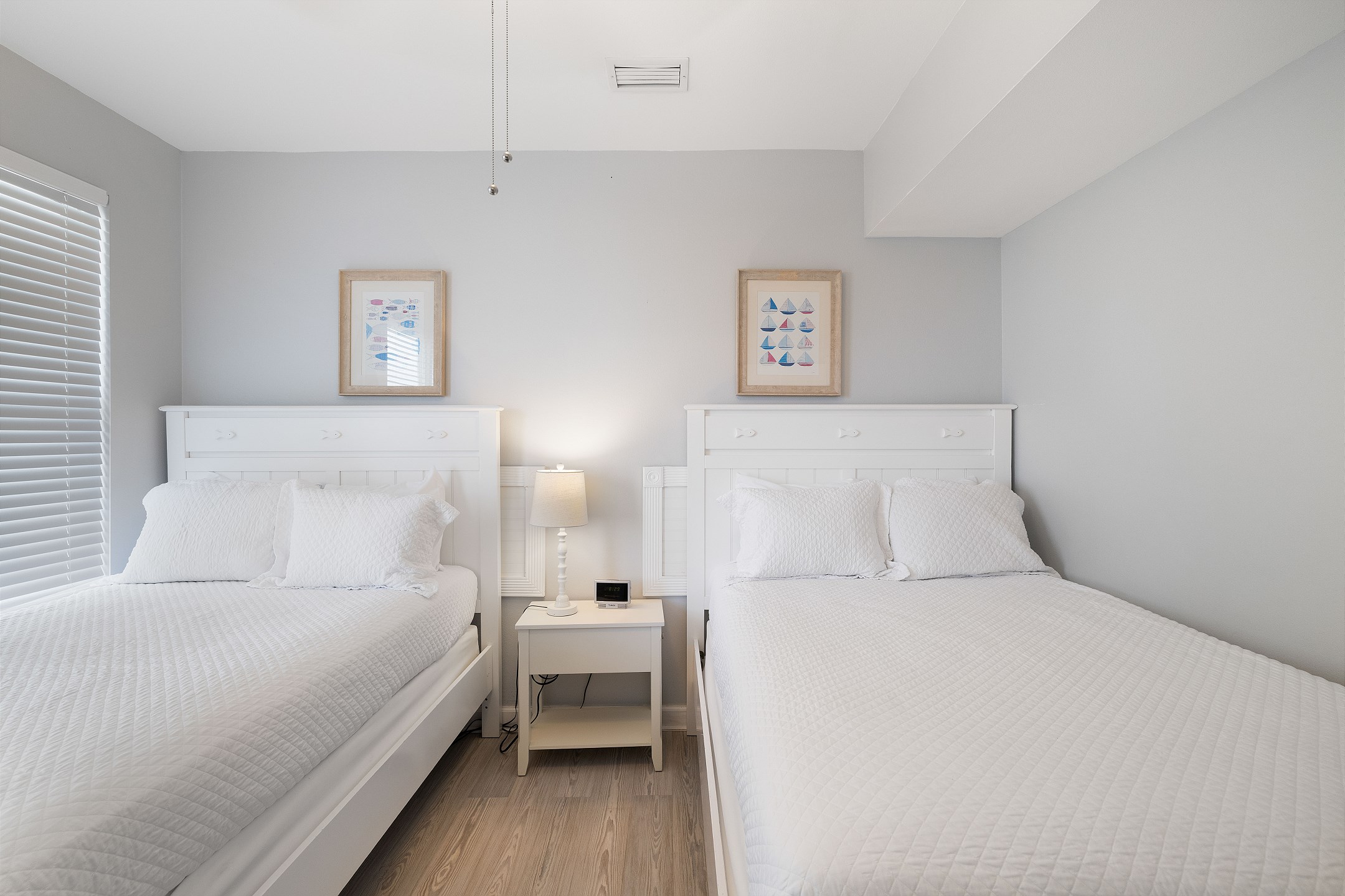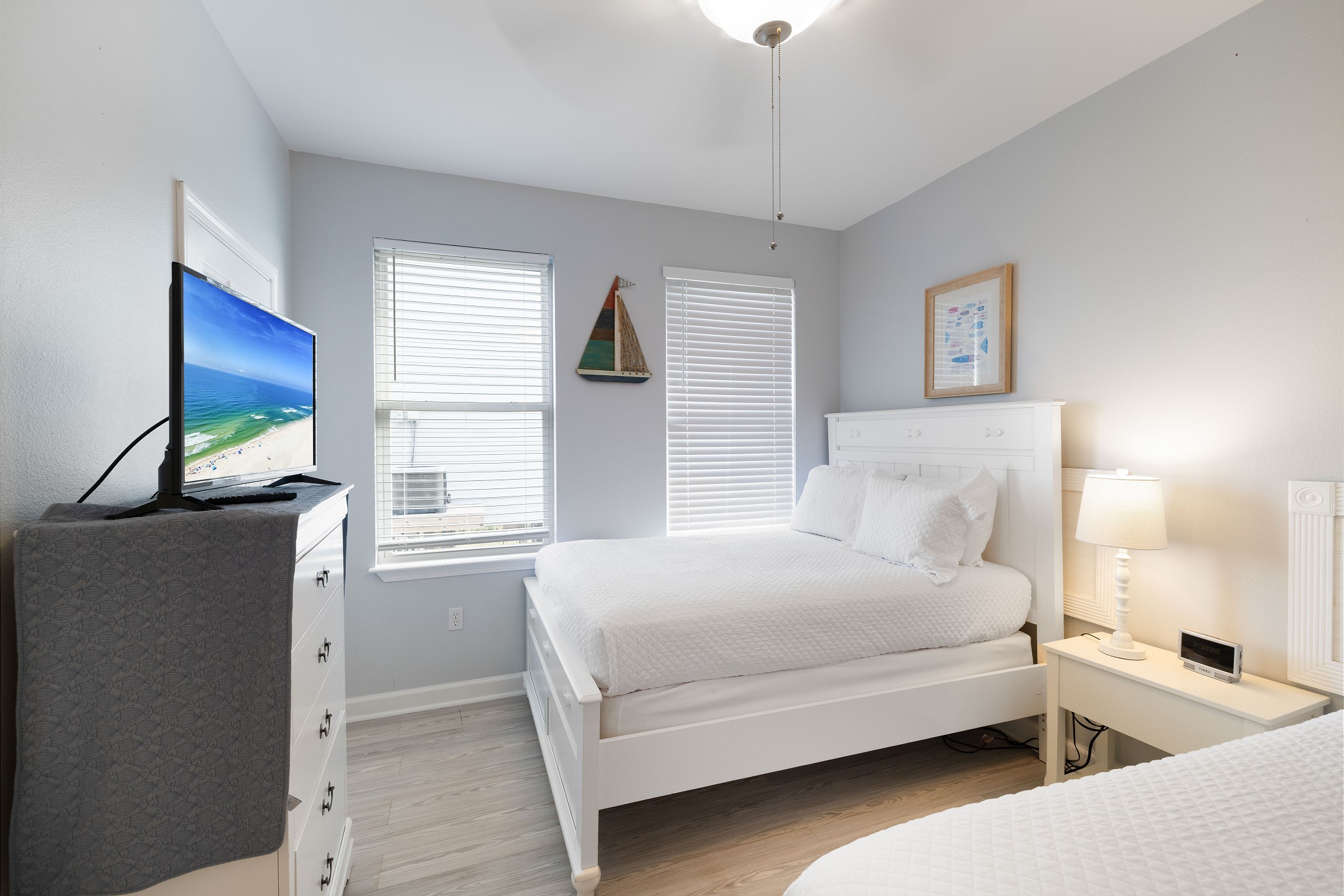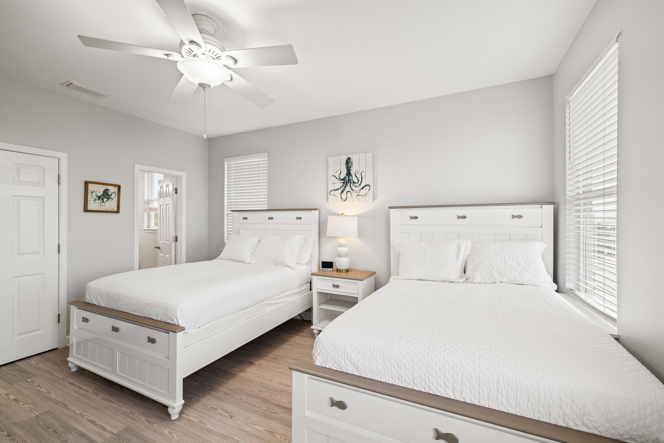 Three bedrooms are located on the main level, each with its own private bathroom and TV. The first bedroom has a king bed and ensuite bath, while the other two bedrooms each feature two full beds and private bathrooms with tub and shower combos. A convenient half bathroom is also located in the hallway.