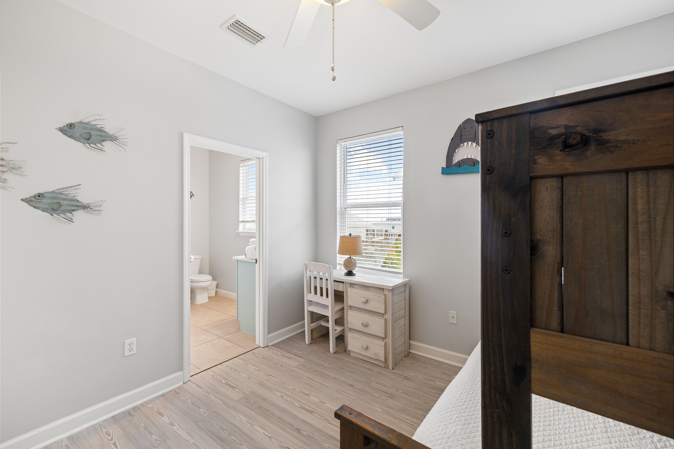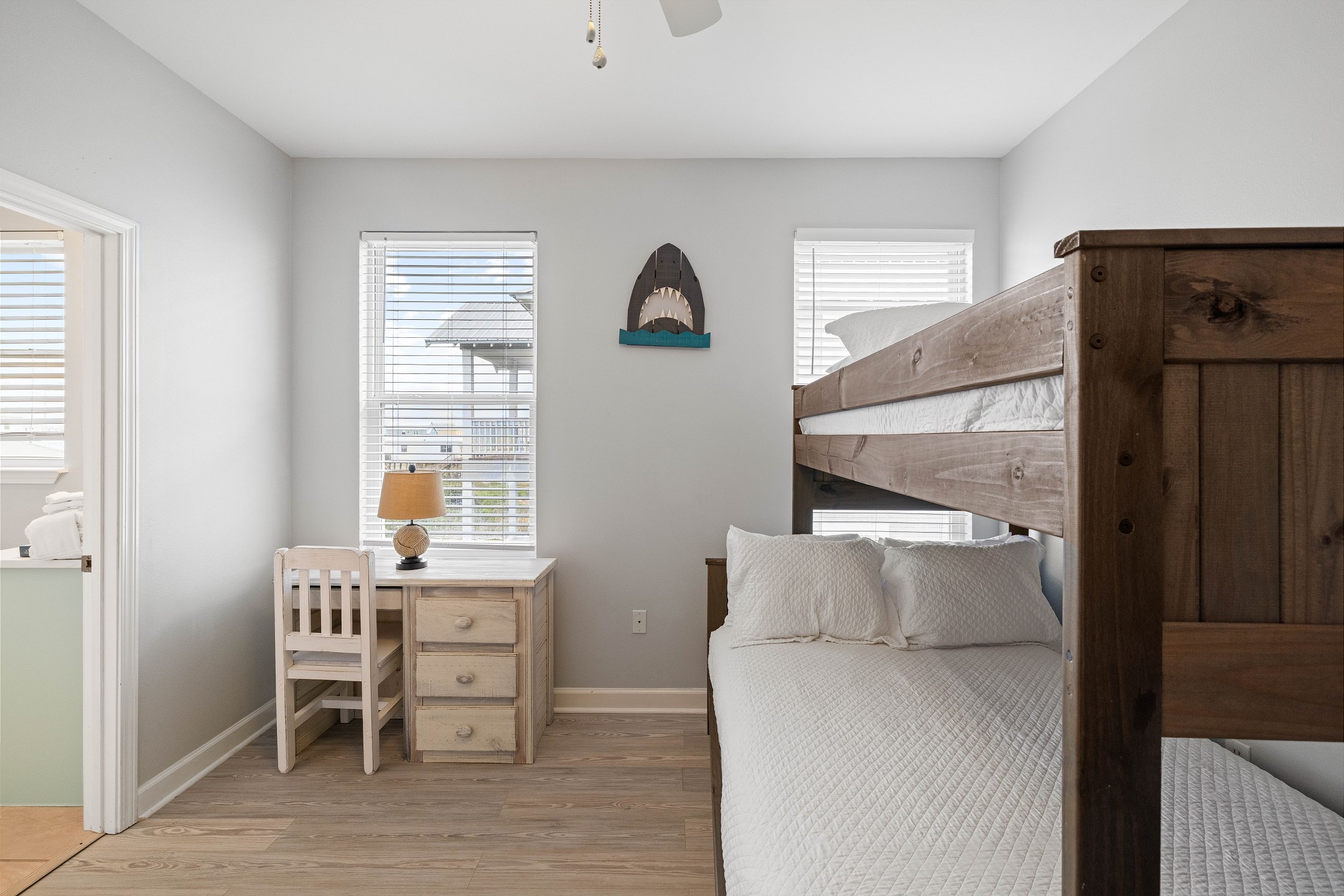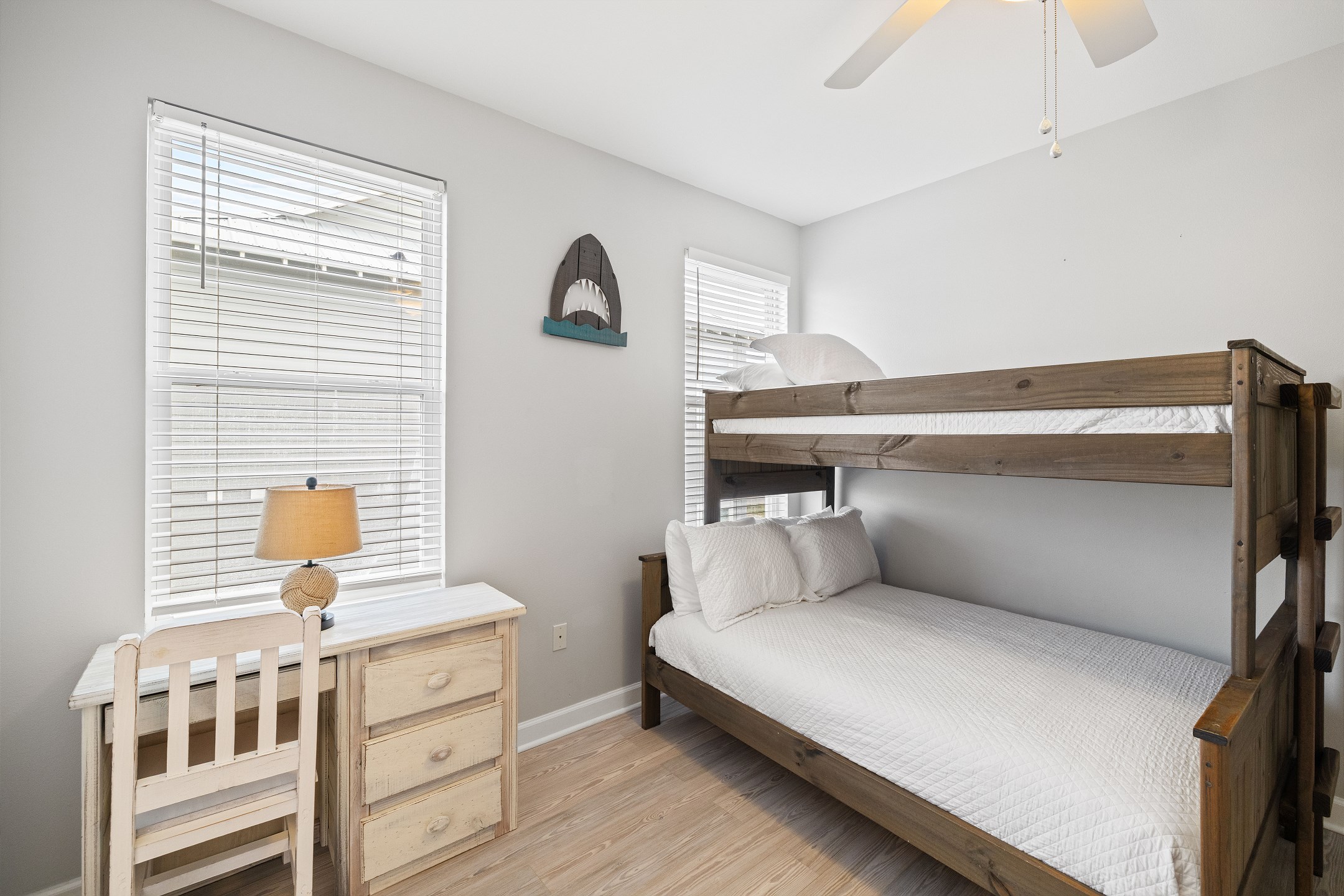 Upstairs, the fourth bedroom includes a twin-over-full bunk bed, a desk for games or activities, and a private bathroom with a walk-in shower. The fifth bedroom has two full beds, a private bathroom with a double vanity, and a tub and shower combo. The sixth bedroom is a spacious retreat with a king bed and a private bathroom featuring a walk-in shower.