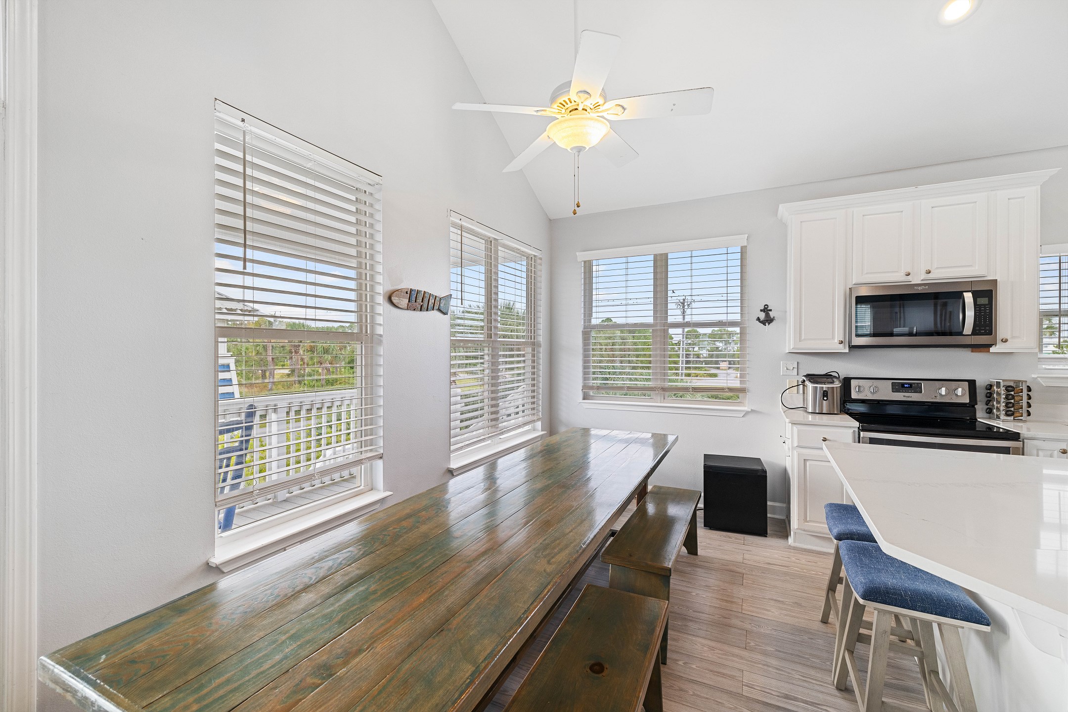 The open-concept main floor offers a welcoming living area with a large sectional, a flat-screen TV, and direct access to the deck, creating the perfect space for indoor and outdoor living. The dining table sits just off the living area with additional seating at the kitchen island. The fully equipped kitchen features granite countertops, brand-new stainless steel appliances, an abundance of cabinet space, and thoughtful touches like an extra prep sink in the island.