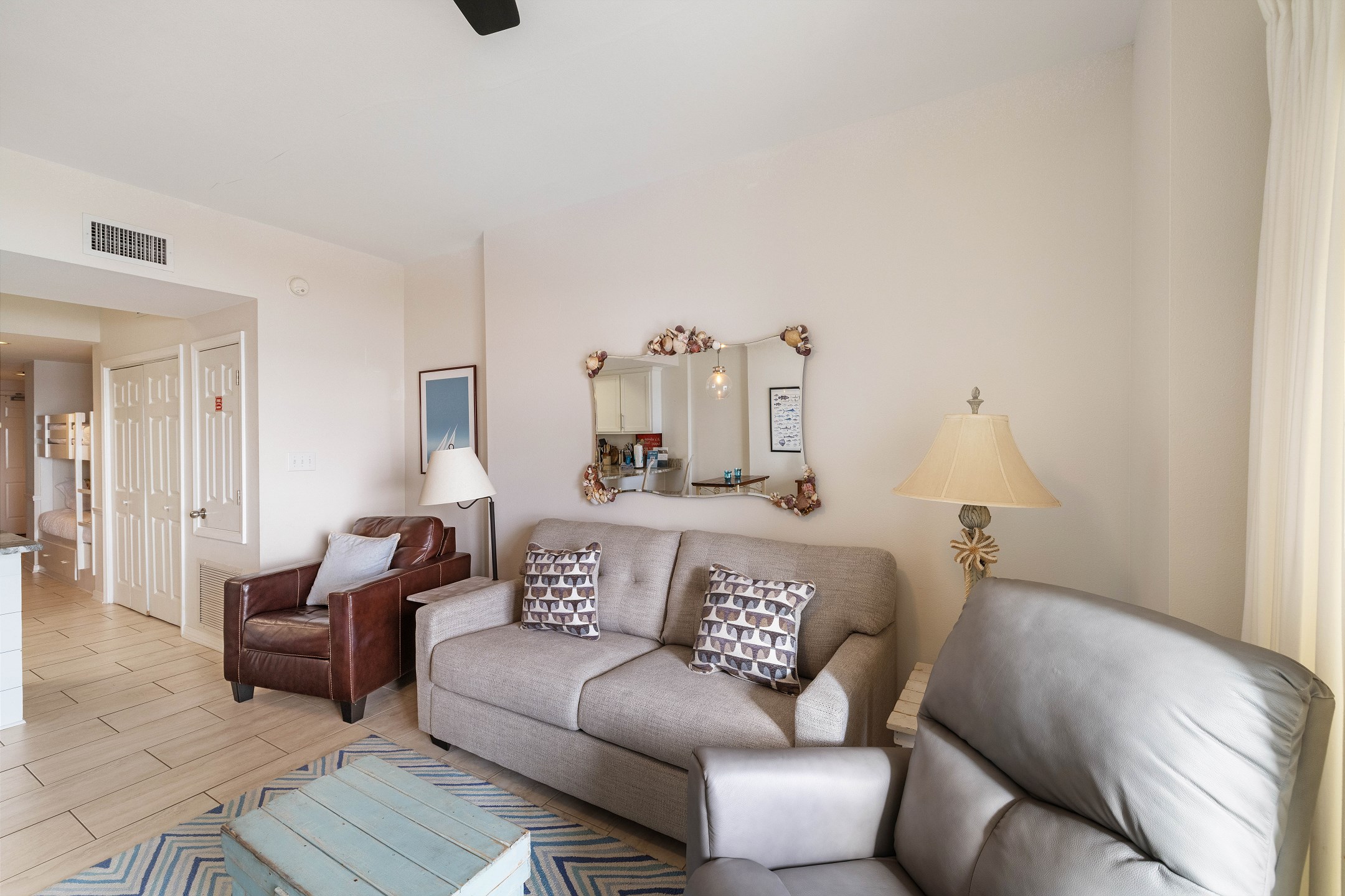 Located on the 4th floor, Tidewater 406 boasts a Primary suite adorned with a luxurious King bed, accompanied by a flat-screen TV for your entertainment. Additional sleeping arrangements are available with Twin bunk beds built into the hallway, and an additional sleeper sofa, perfect for young children.
