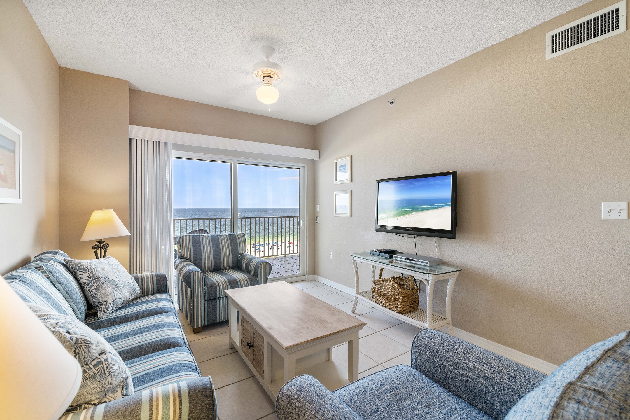 Step inside to discover tile floors throughout the unit, creating a cool and inviting atmosphere. The spacious living room provides access to the balcony, where you can soak in the panoramic views of the coastline. Relax on the comfortable sofa sleeper and catch up on your favorite shows on the flat-screen TV.