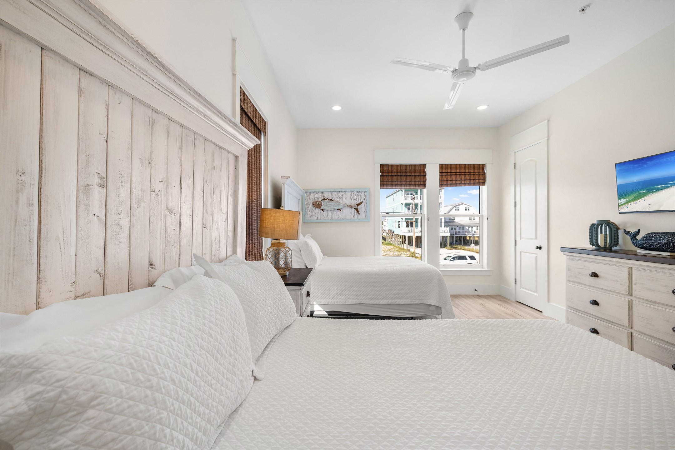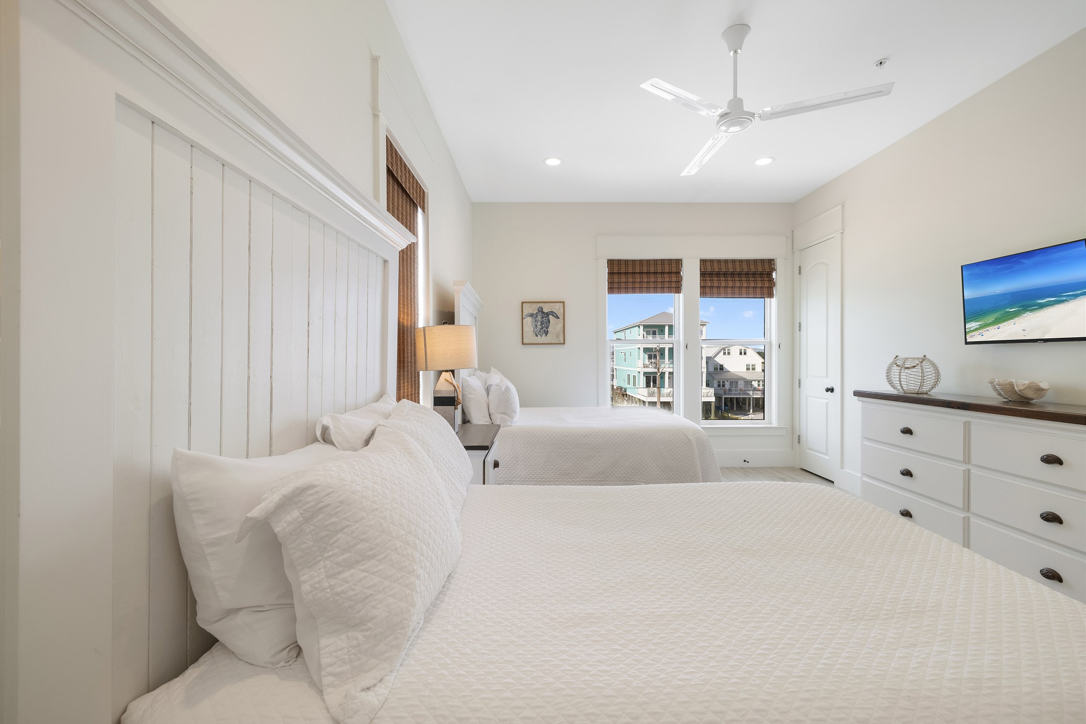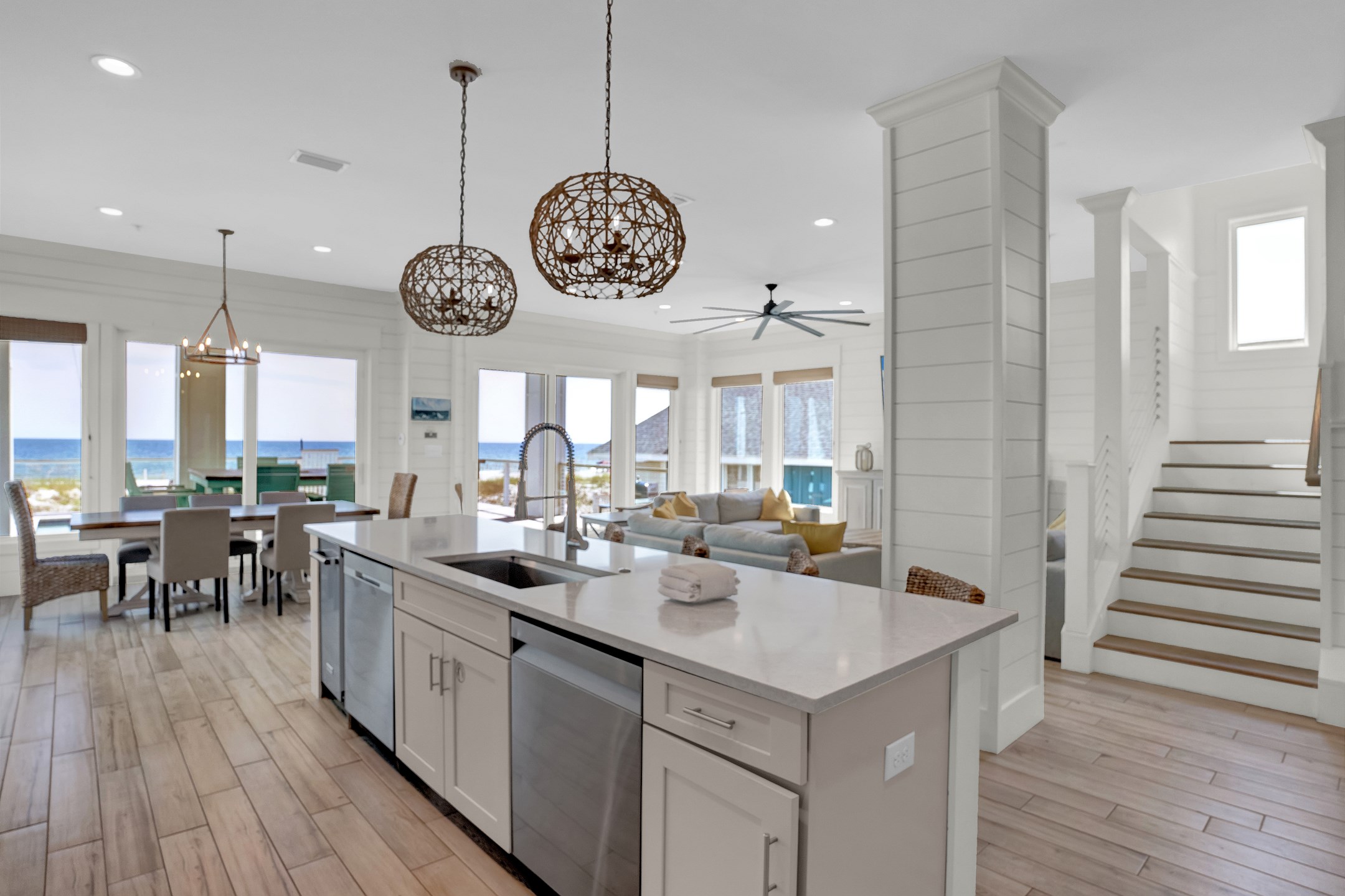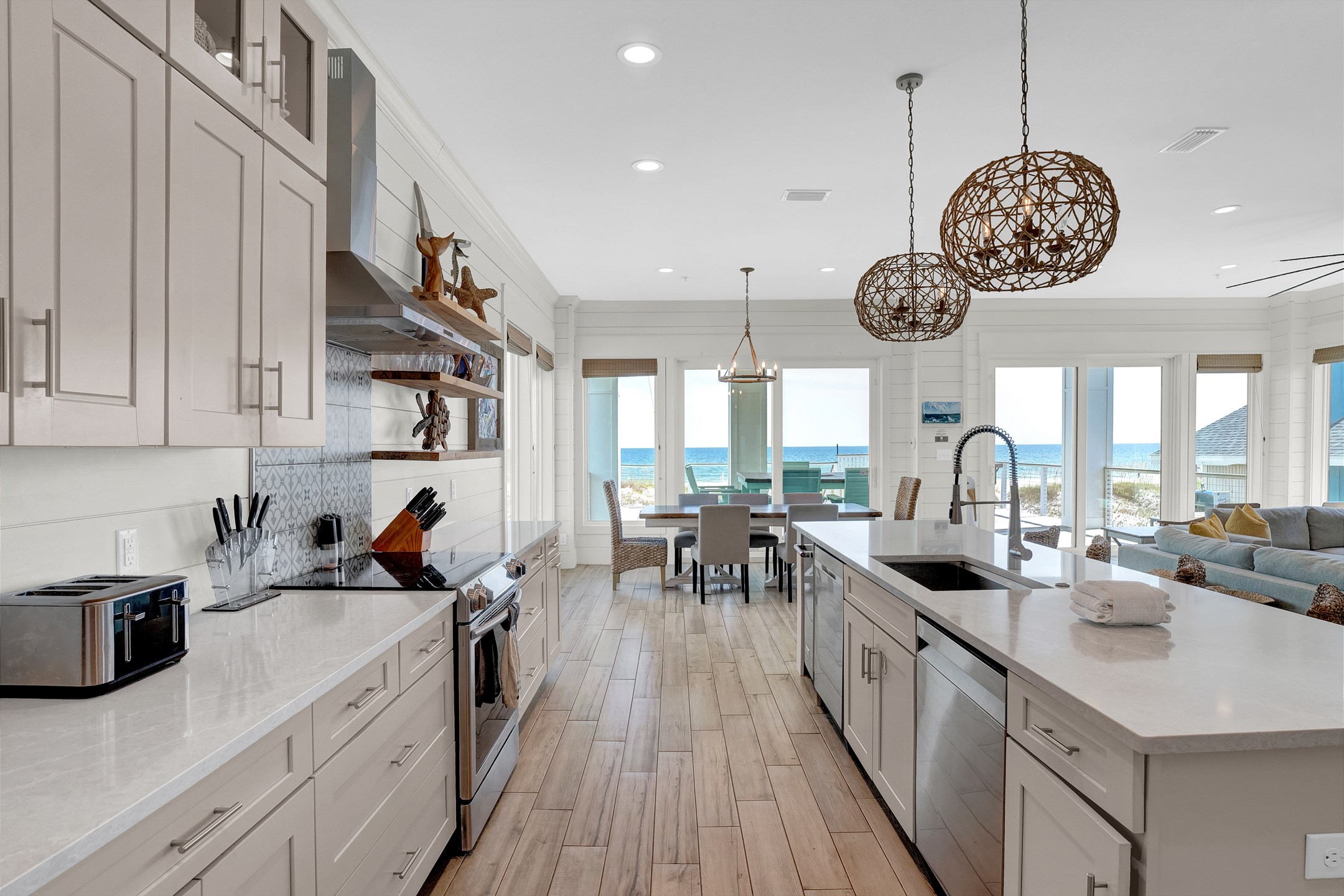 Upon arrival, you can take the stairs or elevator to the main floor, which is surrounded by windows and offers an open concept living, dining, and kitchen area with stunning beach views. The private deck features a dining table and plenty of seating around the built in pool. The fully equipped kitchen includes stainless steel appliances, two refrigerators, and two ovens. A large dining table and additional seating make it ideal for family gatherings. This level also includes a half bathroom, a laundry room, and two bedrooms. One bedroom has two queen beds, an ensuite bathroom, a private balcony, and a closet. The other bedroom has two double beds, an ensuite bathroom with a walk in shower and double vanity, and a closet.