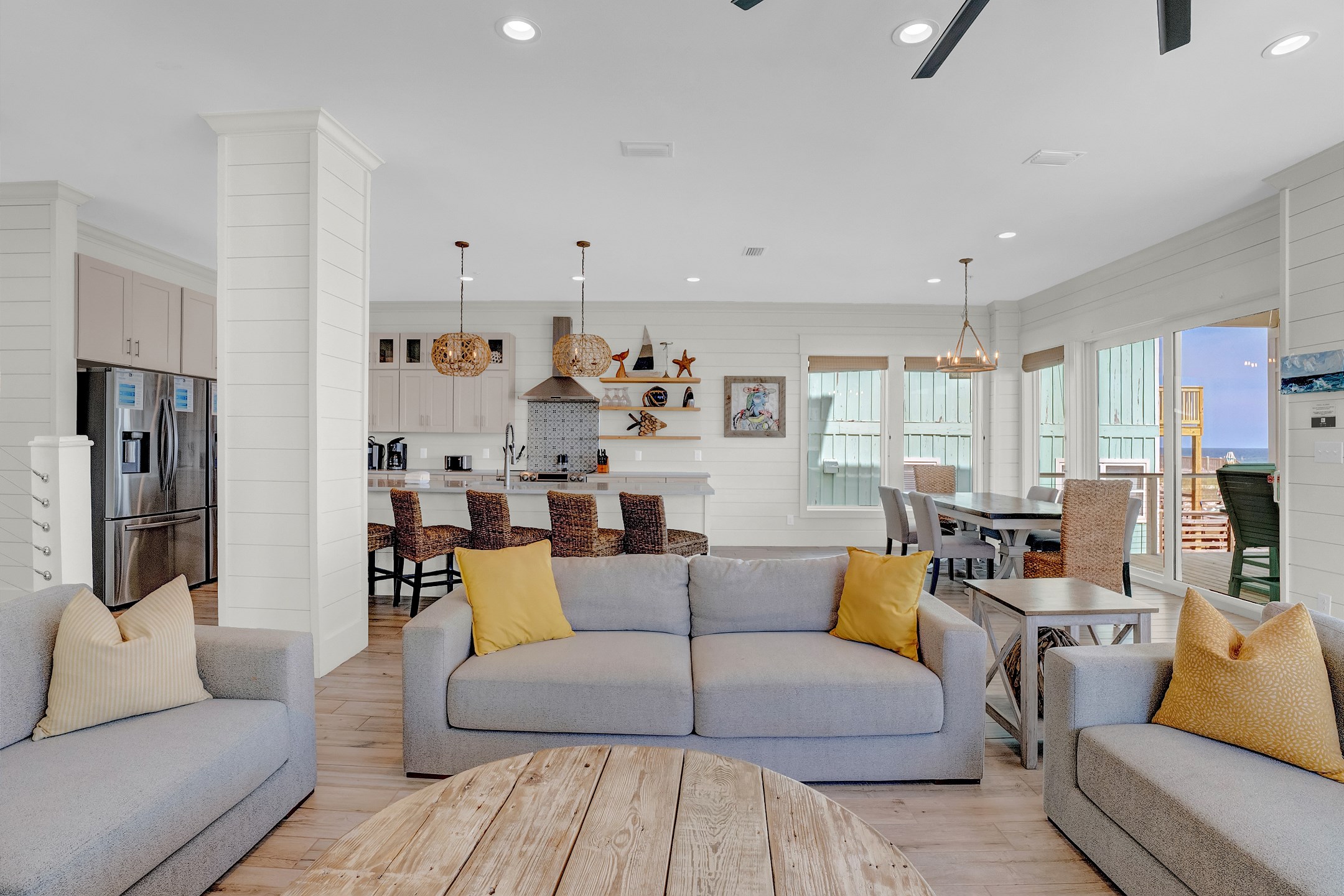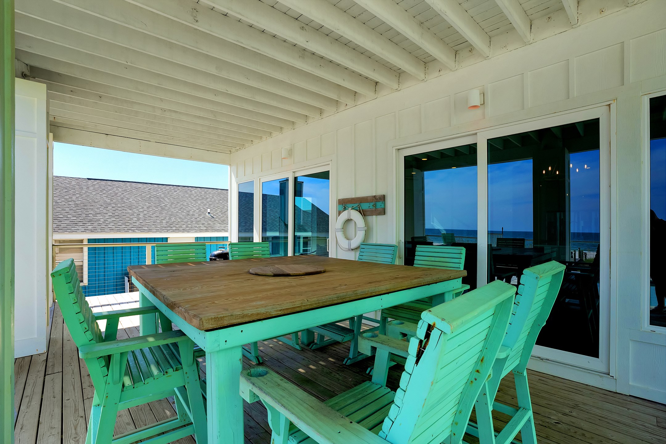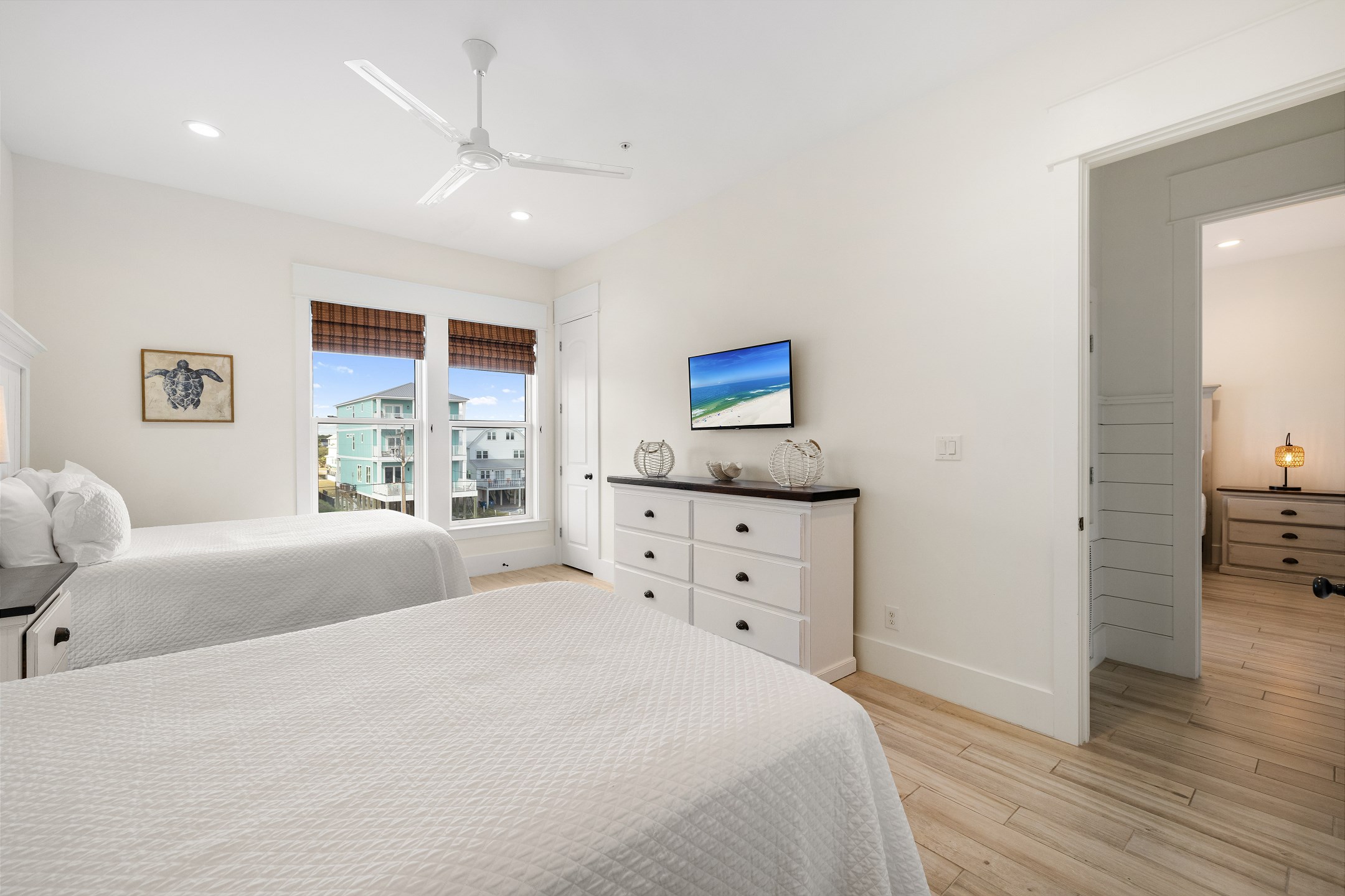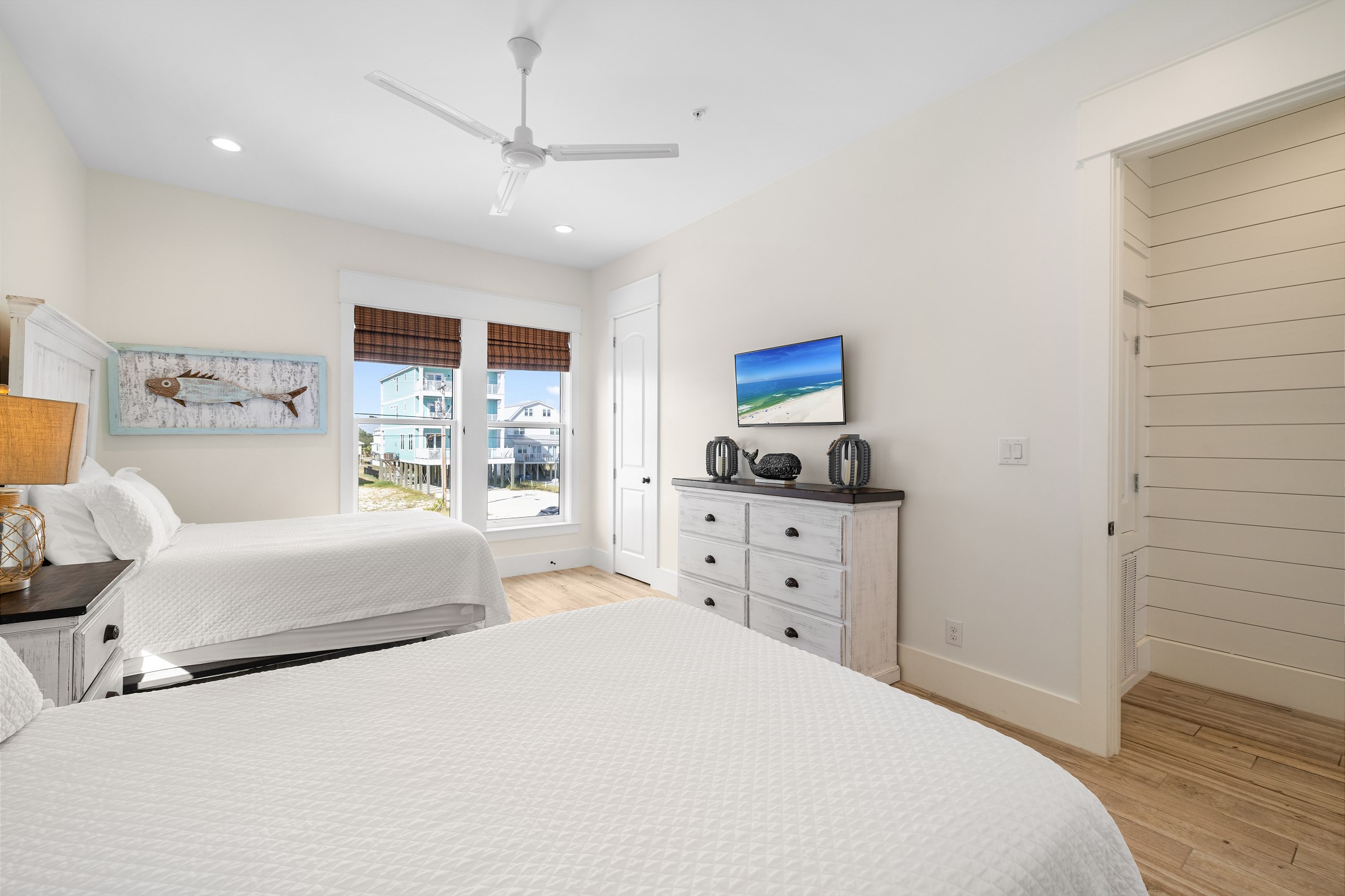 Upon arrival, you can take the stairs or elevator to the main floor, which is surrounded by windows and offers an open concept living, dining, and kitchen area with stunning beach views. The private deck features a dining table and plenty of seating around the built in pool. The fully equipped kitchen includes stainless steel appliances, two refrigerators, and two ovens. A large dining table and additional seating make it ideal for family gatherings. This level also includes a half bathroom, a laundry room, and two bedrooms. One bedroom has two queen beds, an ensuite bathroom, a private balcony, and a closet. The other bedroom has two double beds, an ensuite bathroom with a walk in shower and double vanity, and a closet.