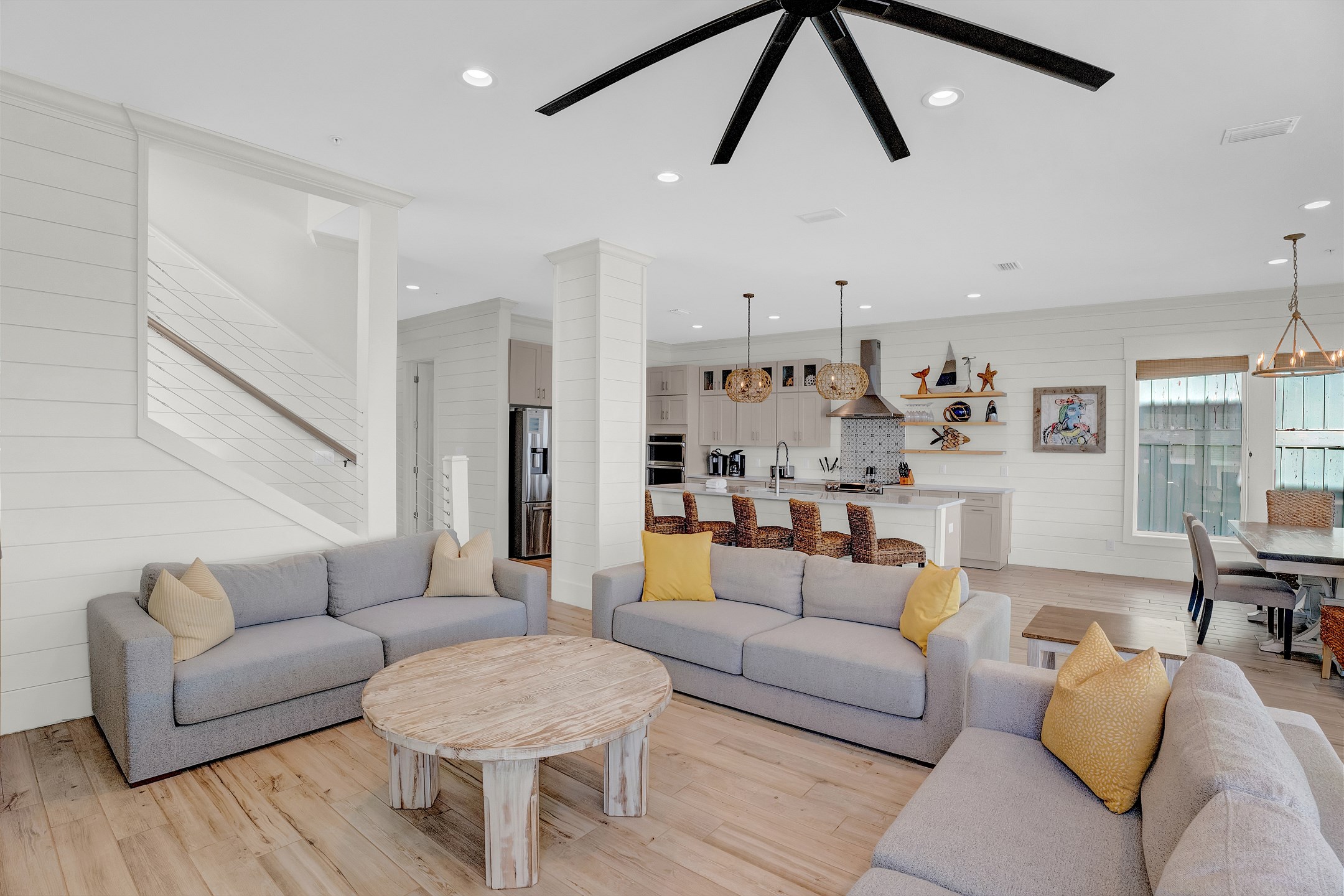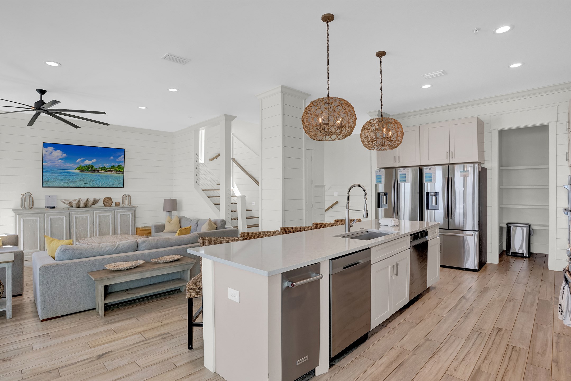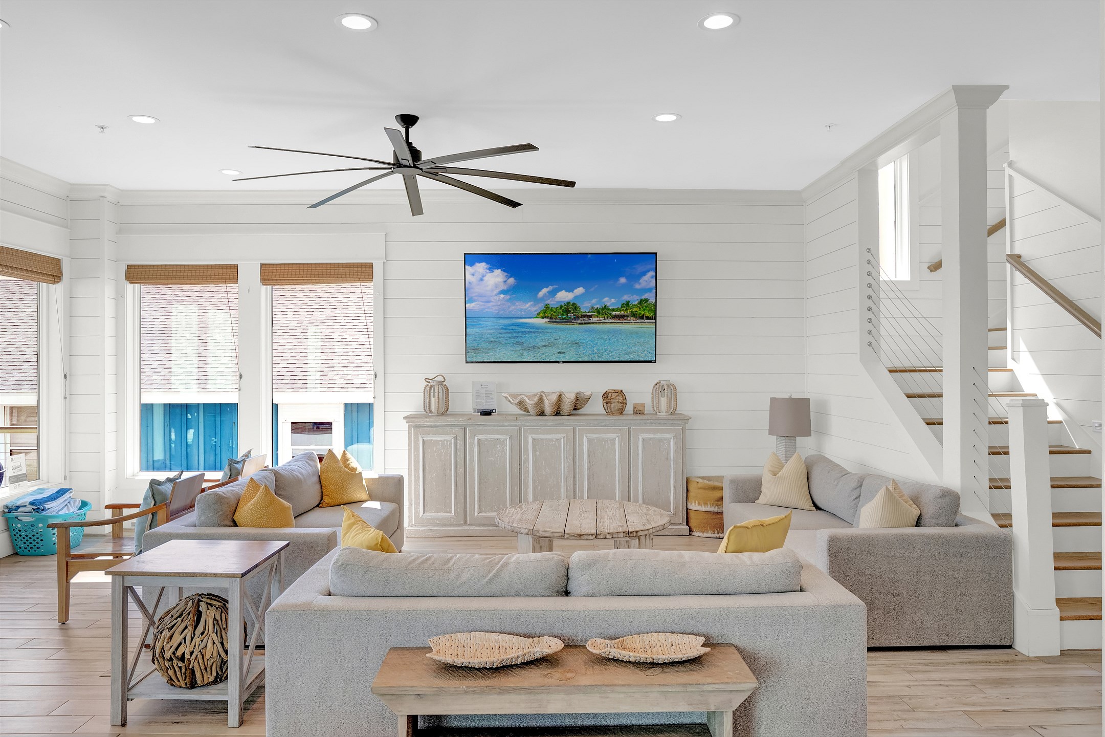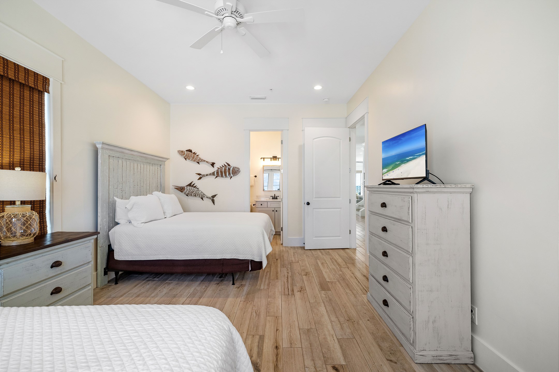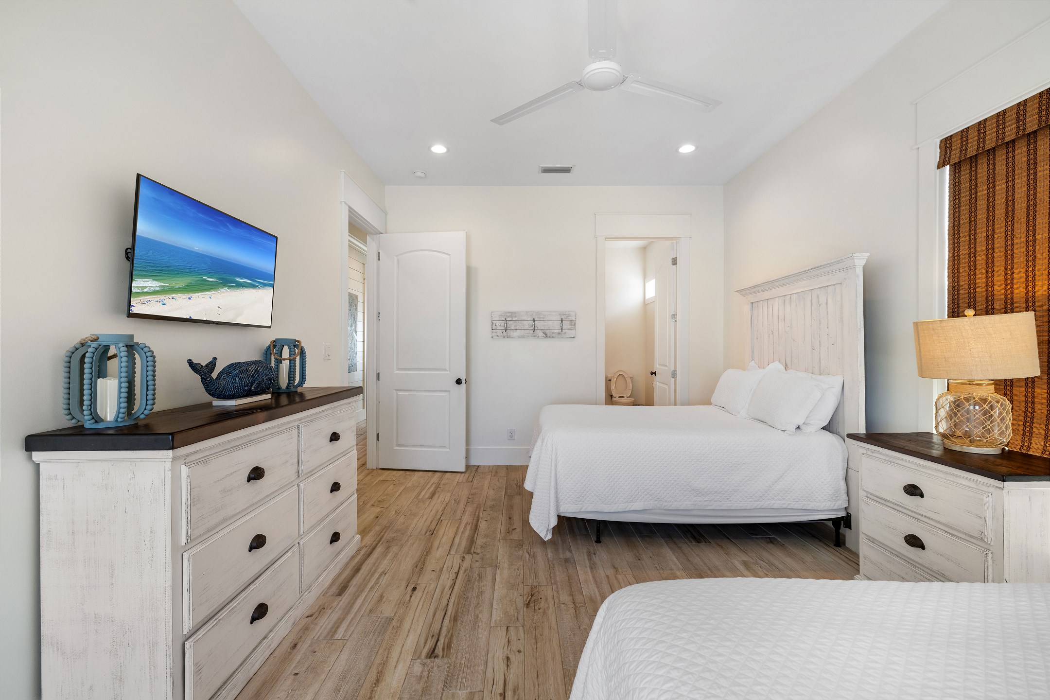 Upon arrival, you can take the stairs or elevator to the main floor, which is surrounded by windows and offers an open concept living, dining, and kitchen area with stunning beach views. The private deck features a dining table and plenty of seating around the built in pool. The fully equipped kitchen includes stainless steel appliances, two refrigerators, and two ovens. A large dining table and additional seating make it ideal for family gatherings. This level also includes a half bathroom, a laundry room, and two bedrooms. One bedroom has two queen beds, an ensuite bathroom, a private balcony, and a closet. The other bedroom has two double beds, an ensuite bathroom with a walk in shower and double vanity, and a closet.