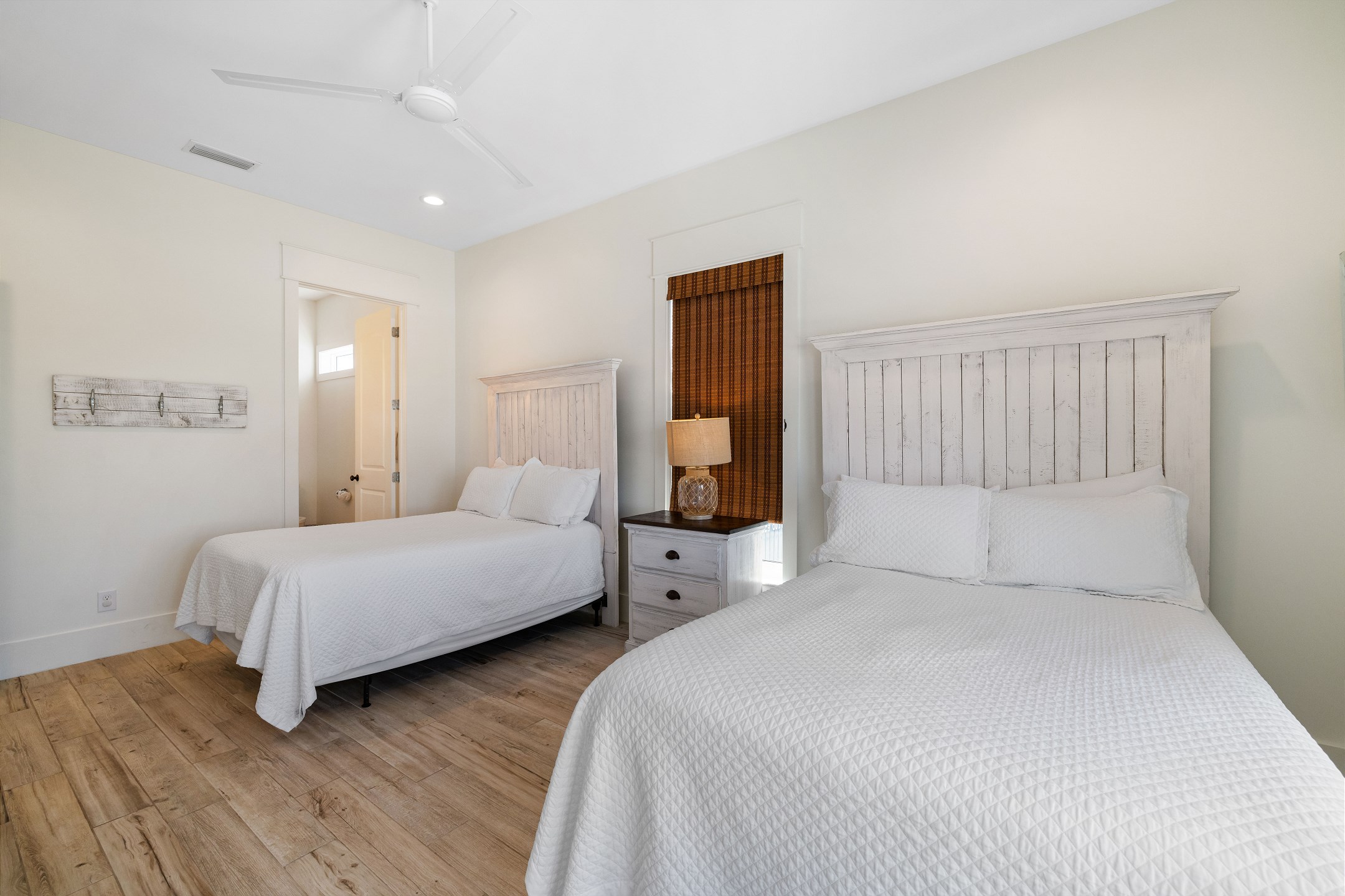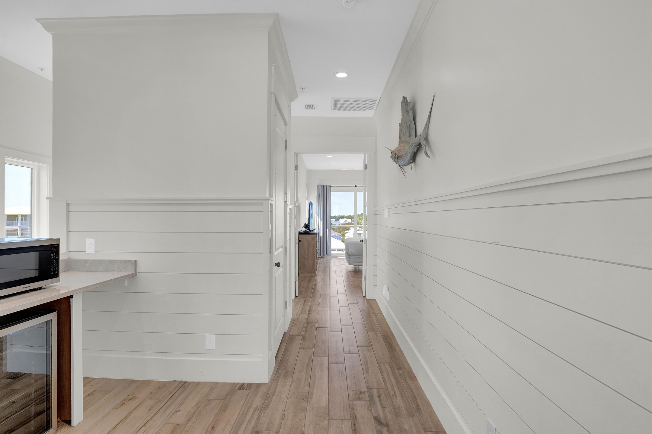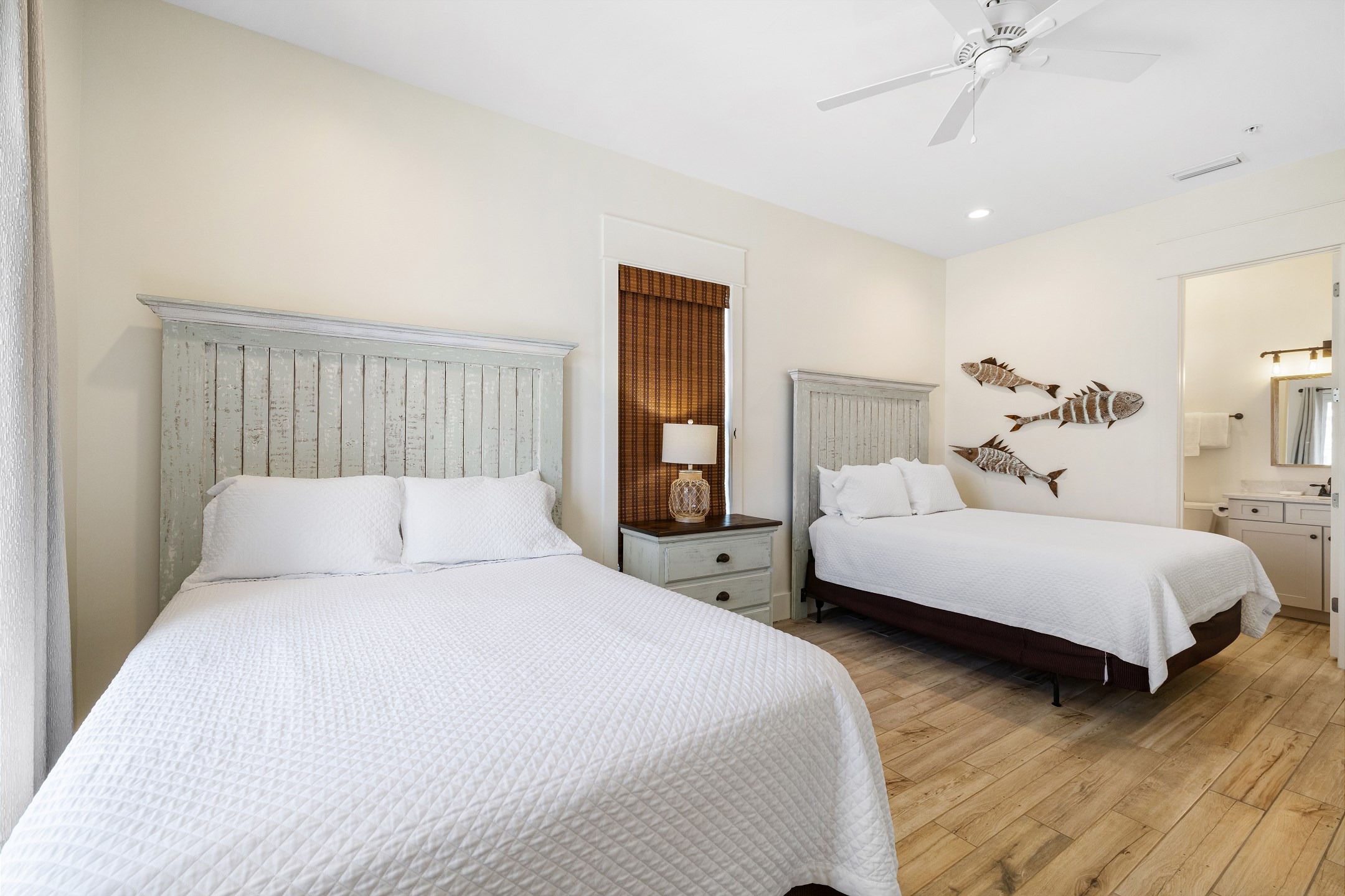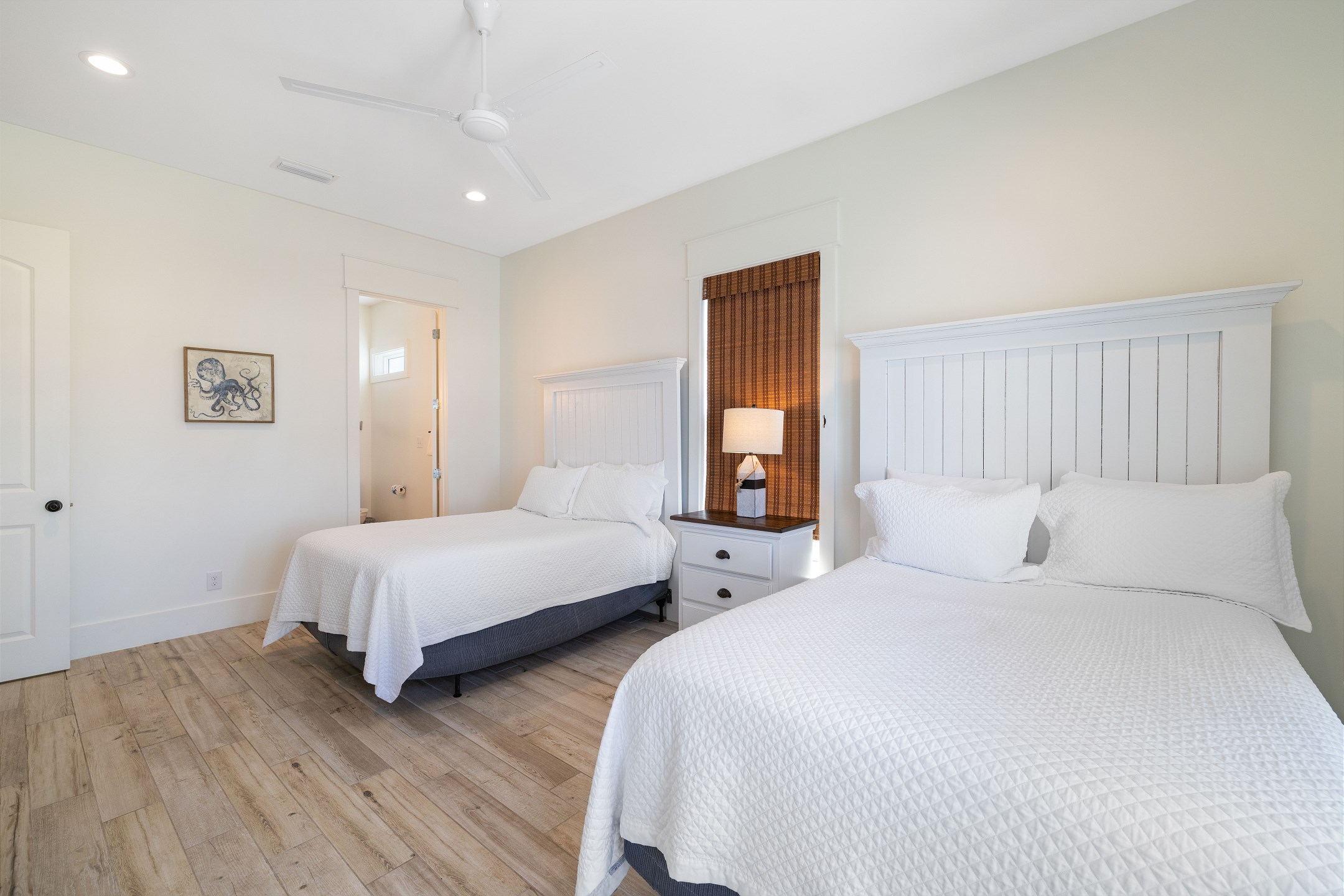 Upon arrival, you can take the stairs or elevator to the main floor, which is surrounded by windows and offers an open concept living, dining, and kitchen area with stunning beach views. The private deck features a dining table and plenty of seating around the built in pool. The fully equipped kitchen includes stainless steel appliances, two refrigerators, and two ovens. A large dining table and additional seating make it ideal for family gatherings. This level also includes a half bathroom, a laundry room, and two bedrooms. One bedroom has two queen beds, an ensuite bathroom, a private balcony, and a closet. The other bedroom has two double beds, an ensuite bathroom with a walk in shower and double vanity, and a closet.