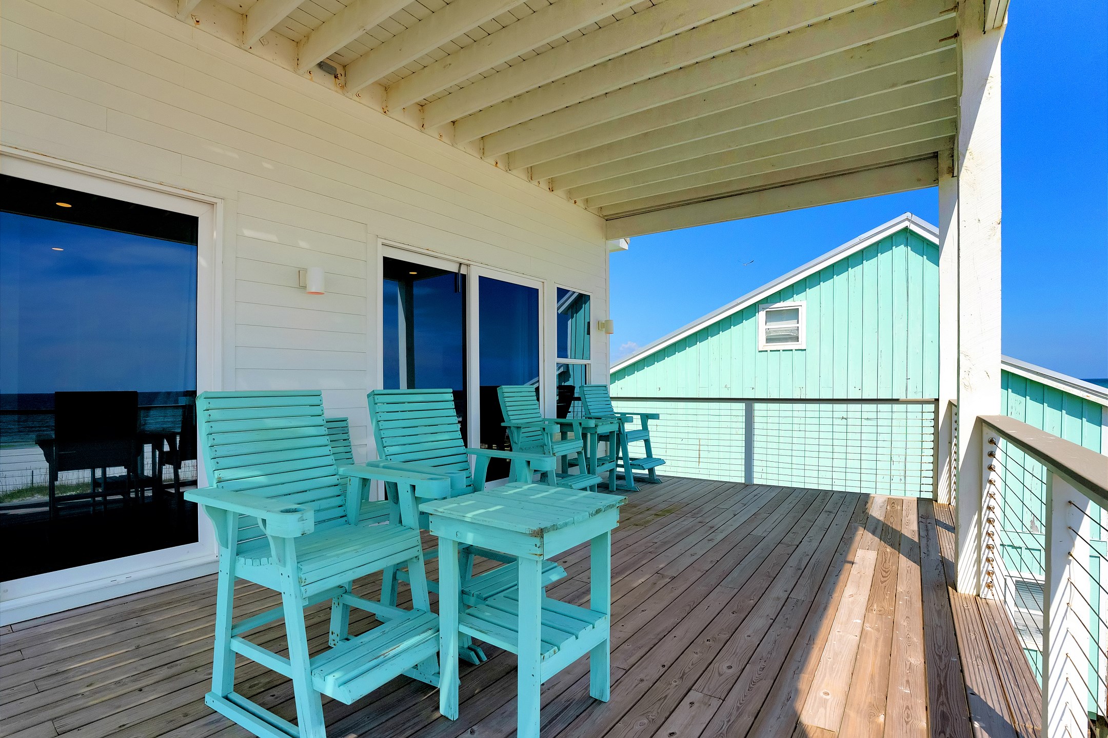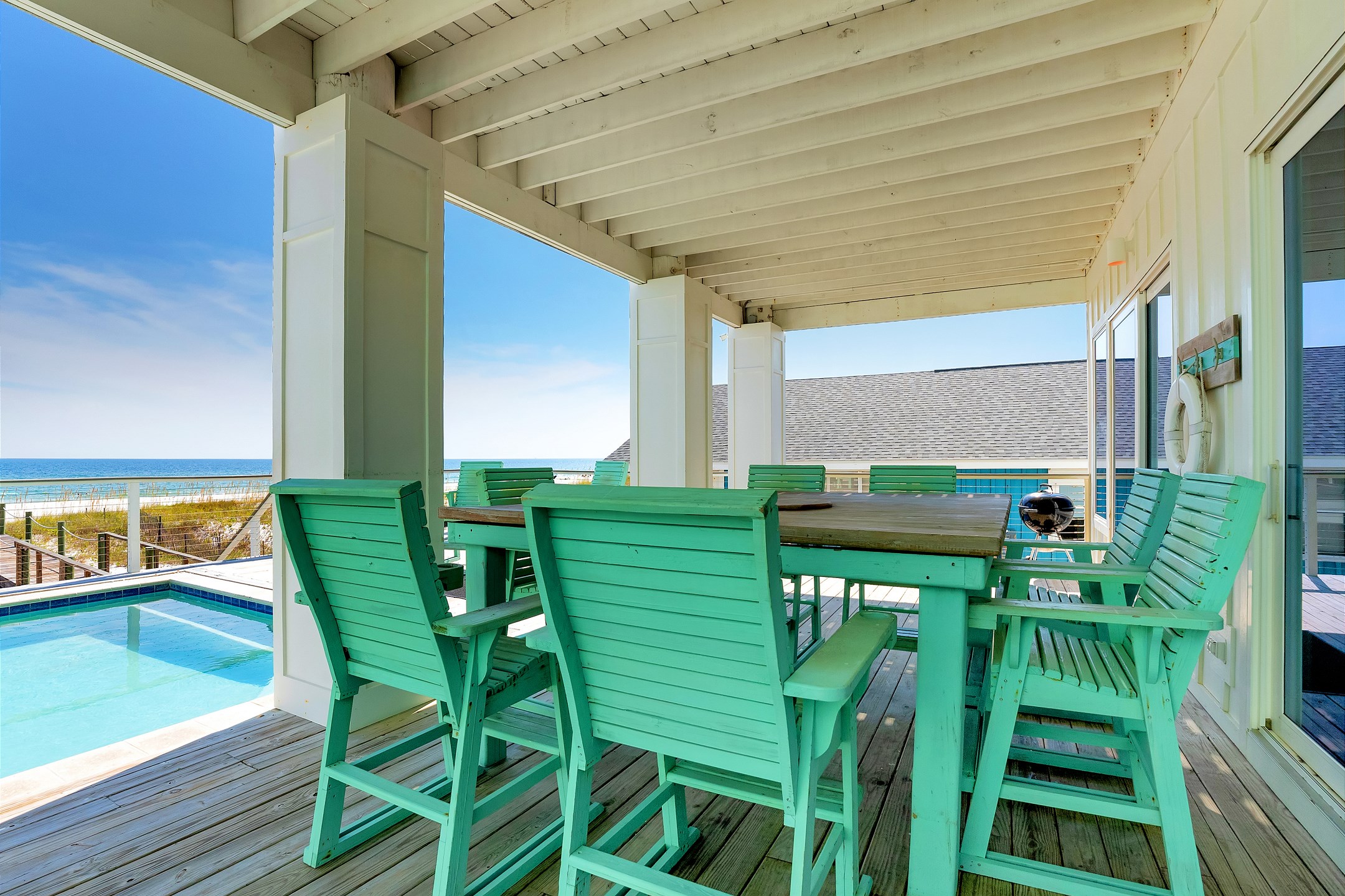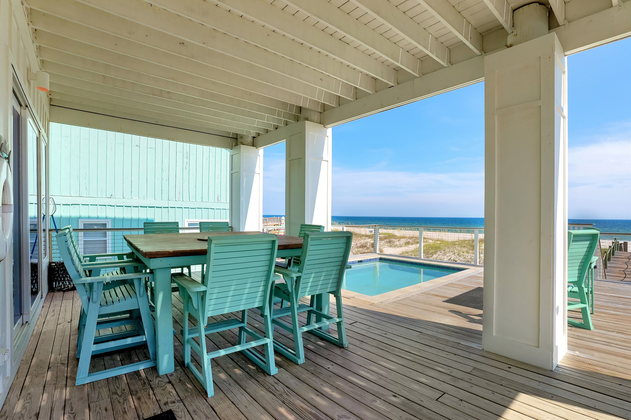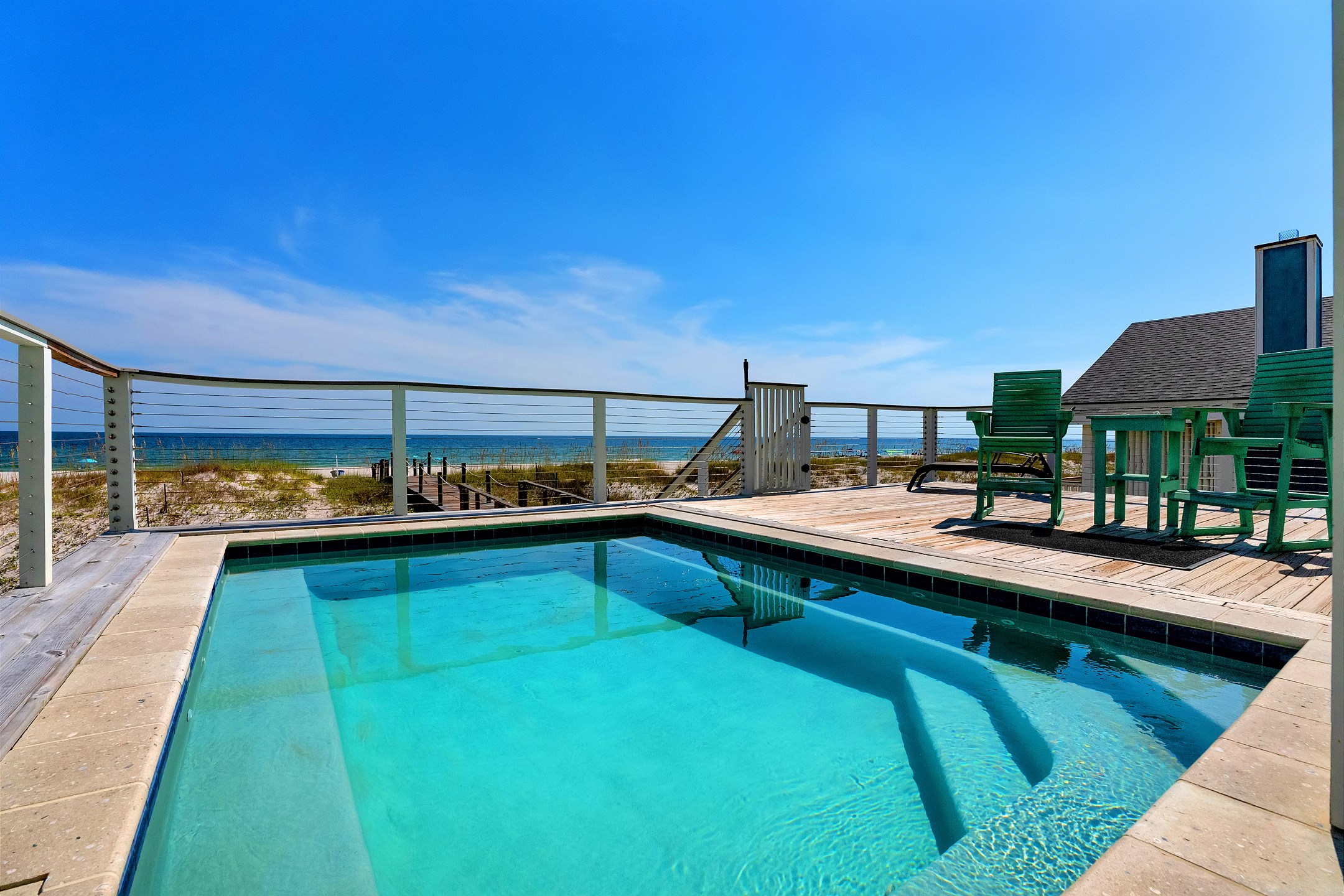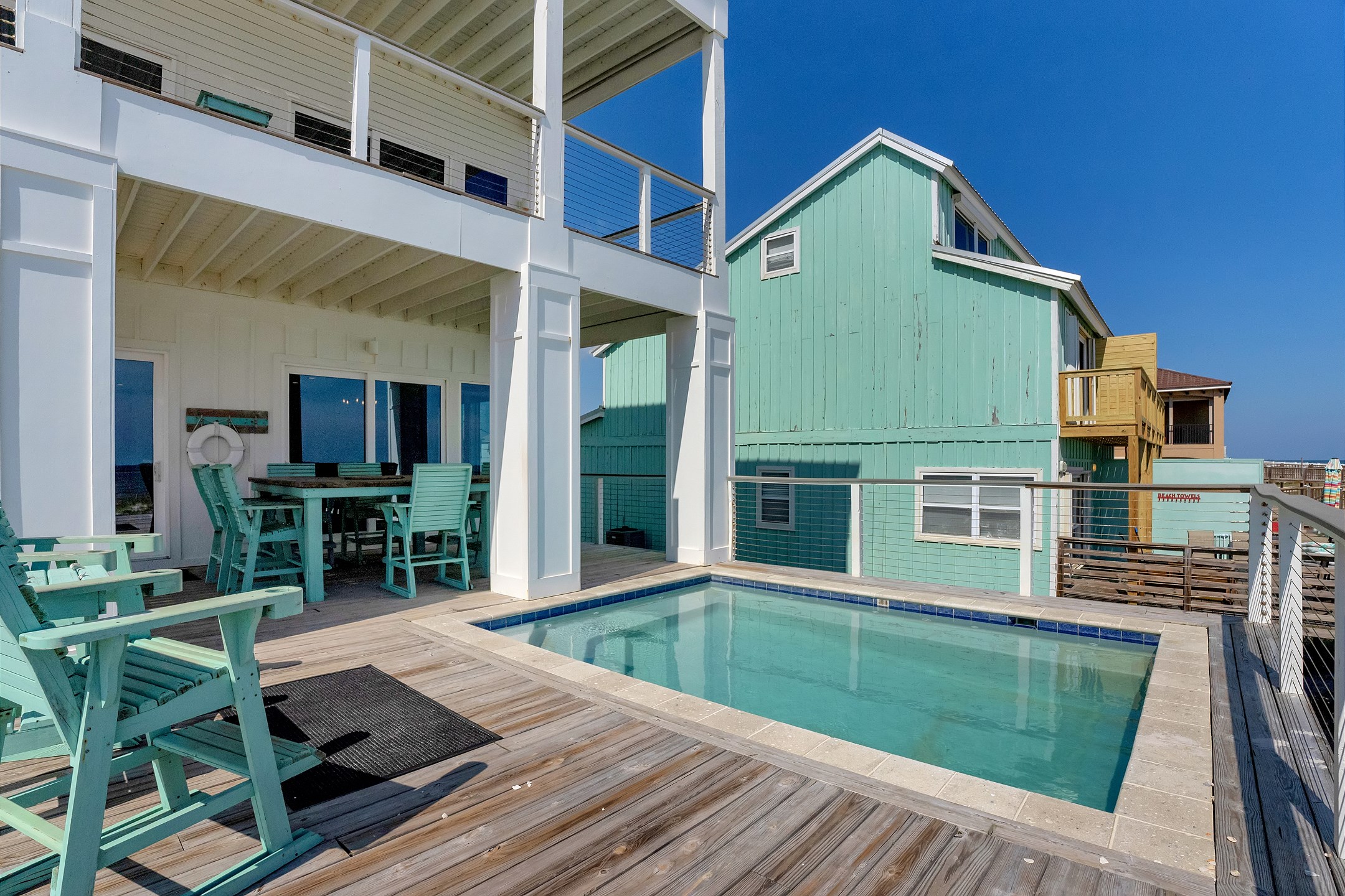 Outdoor amenities include a gulf front pool that can be heated for an additional fee, an outdoor shower, and an oversized picnic table. Inside, each bedroom and both living areas have large flat screen TVs. An elevator provides access from the ground floor to the top level. The pool measures 10 by 17 feet with a depth of 4 feet.