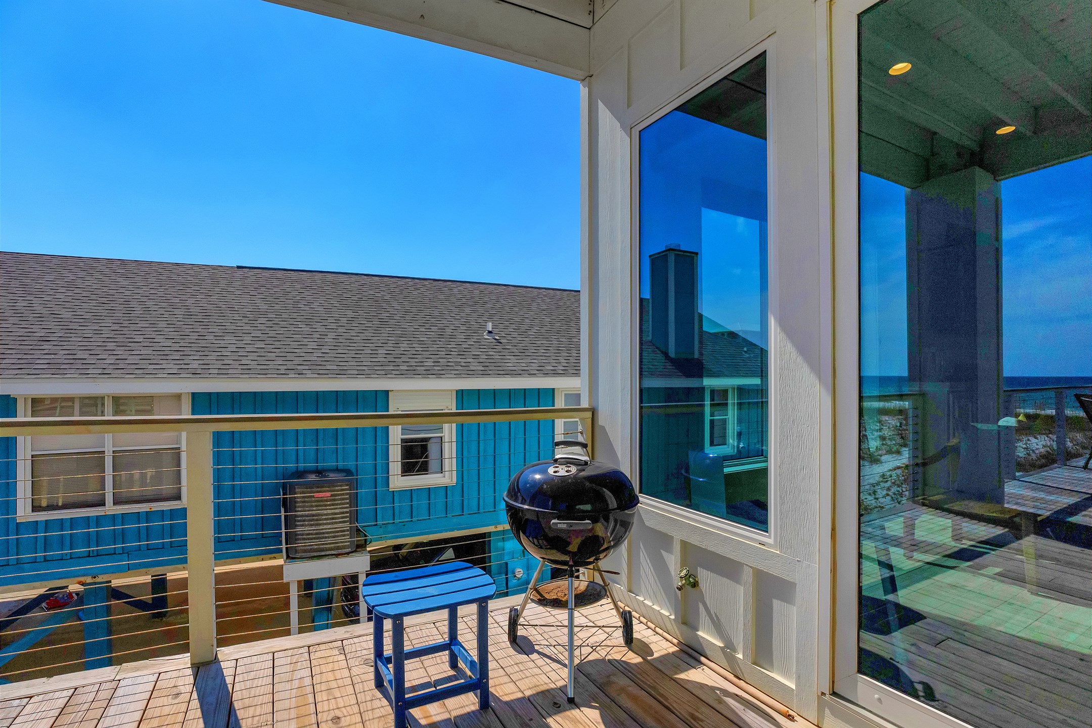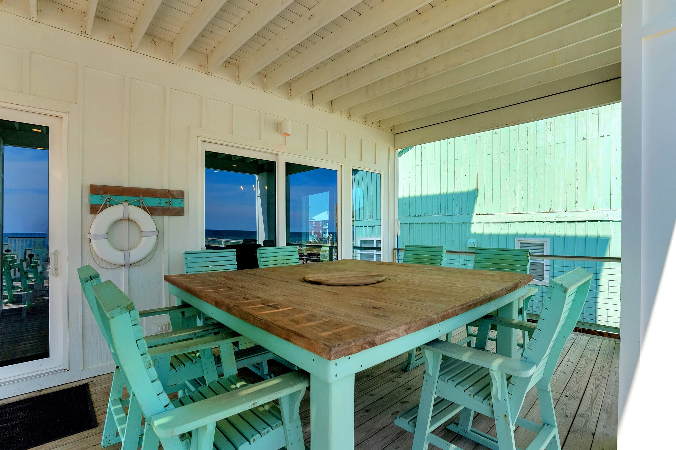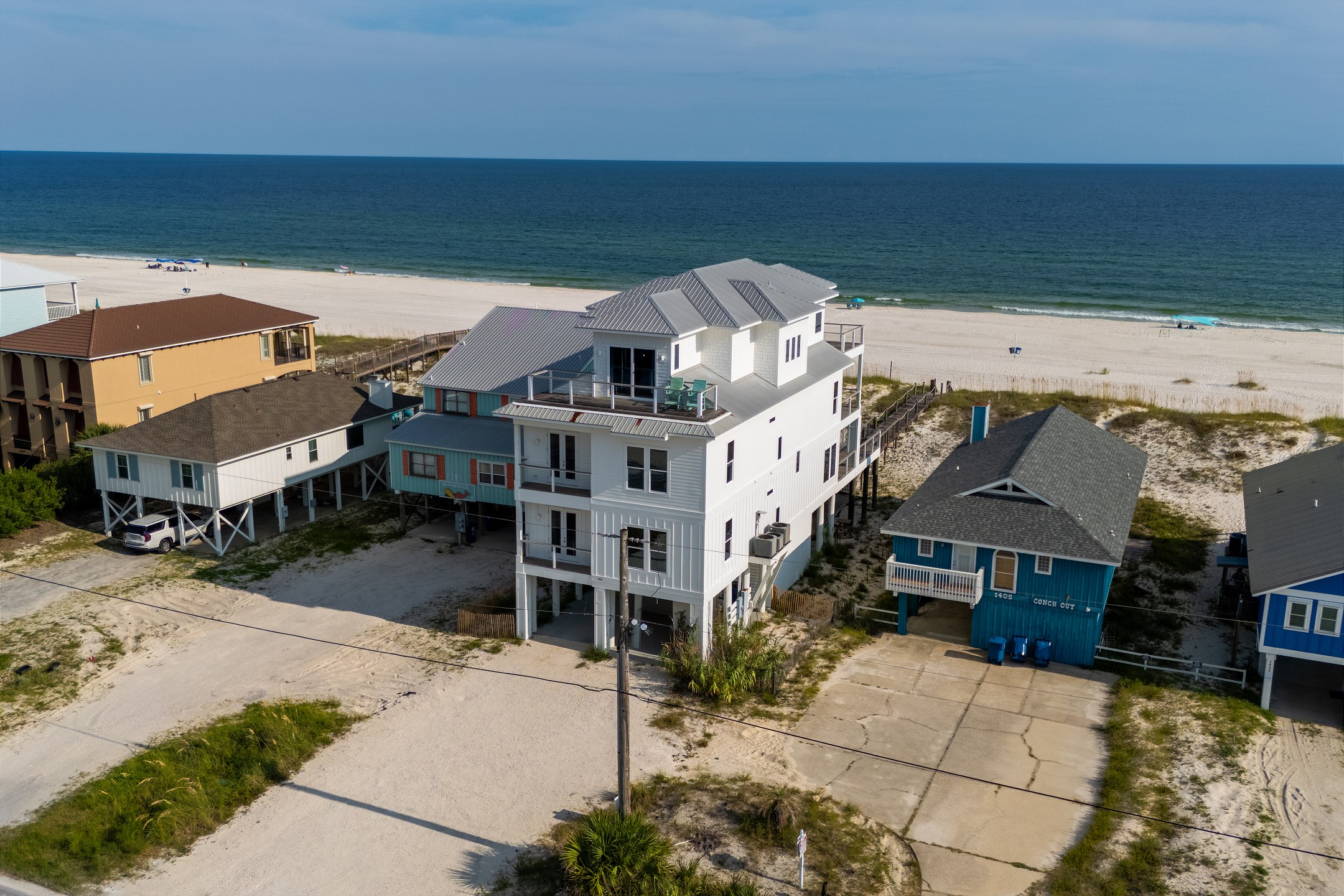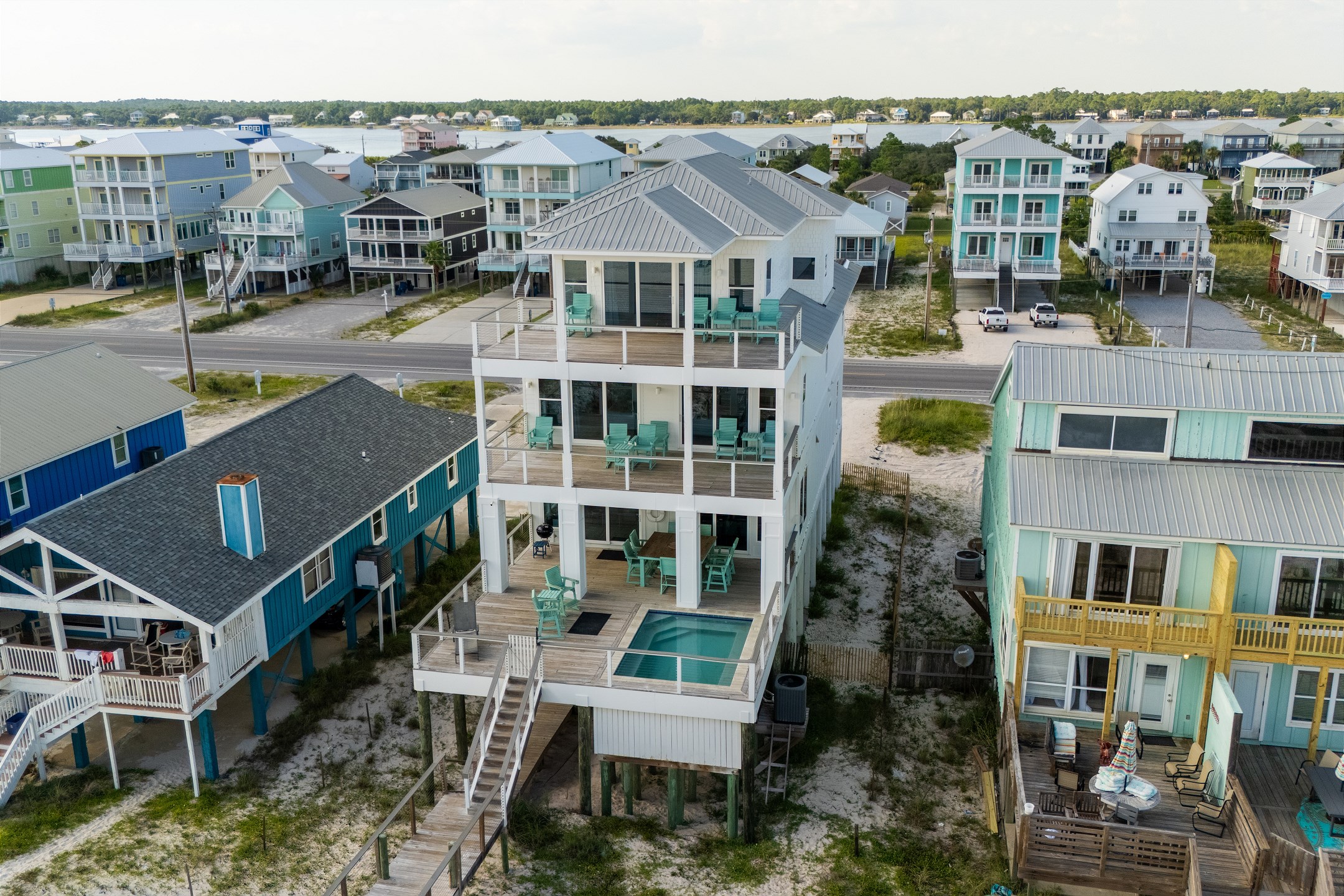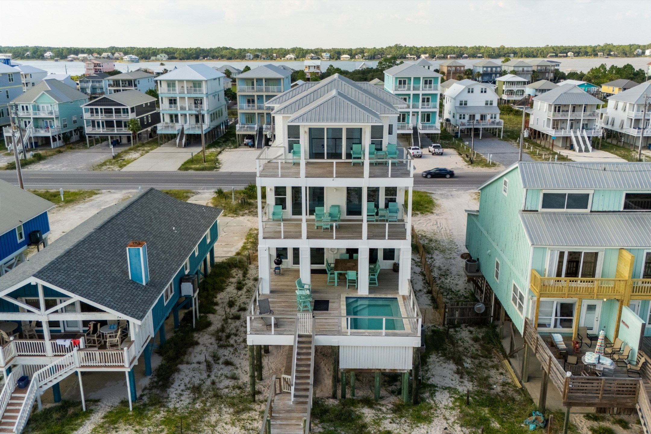 Outdoor amenities include a gulf front pool that can be heated for an additional fee, an outdoor shower, and an oversized picnic table. Inside, each bedroom and both living areas have large flat screen TVs. An elevator provides access from the ground floor to the top level. The pool measures 10 by 17 feet with a depth of 4 feet.