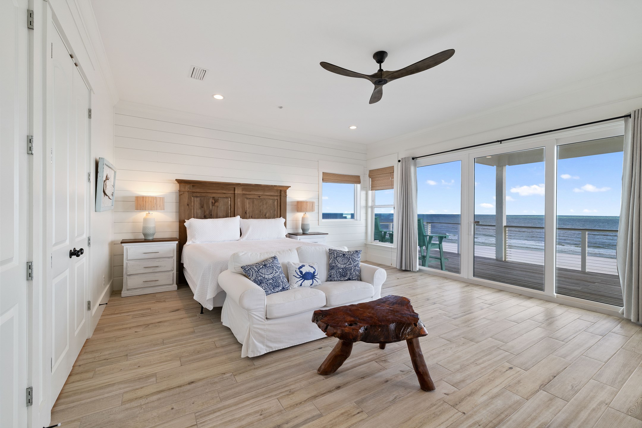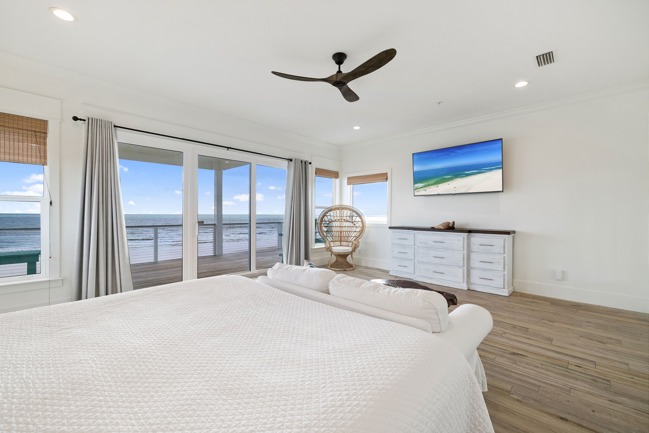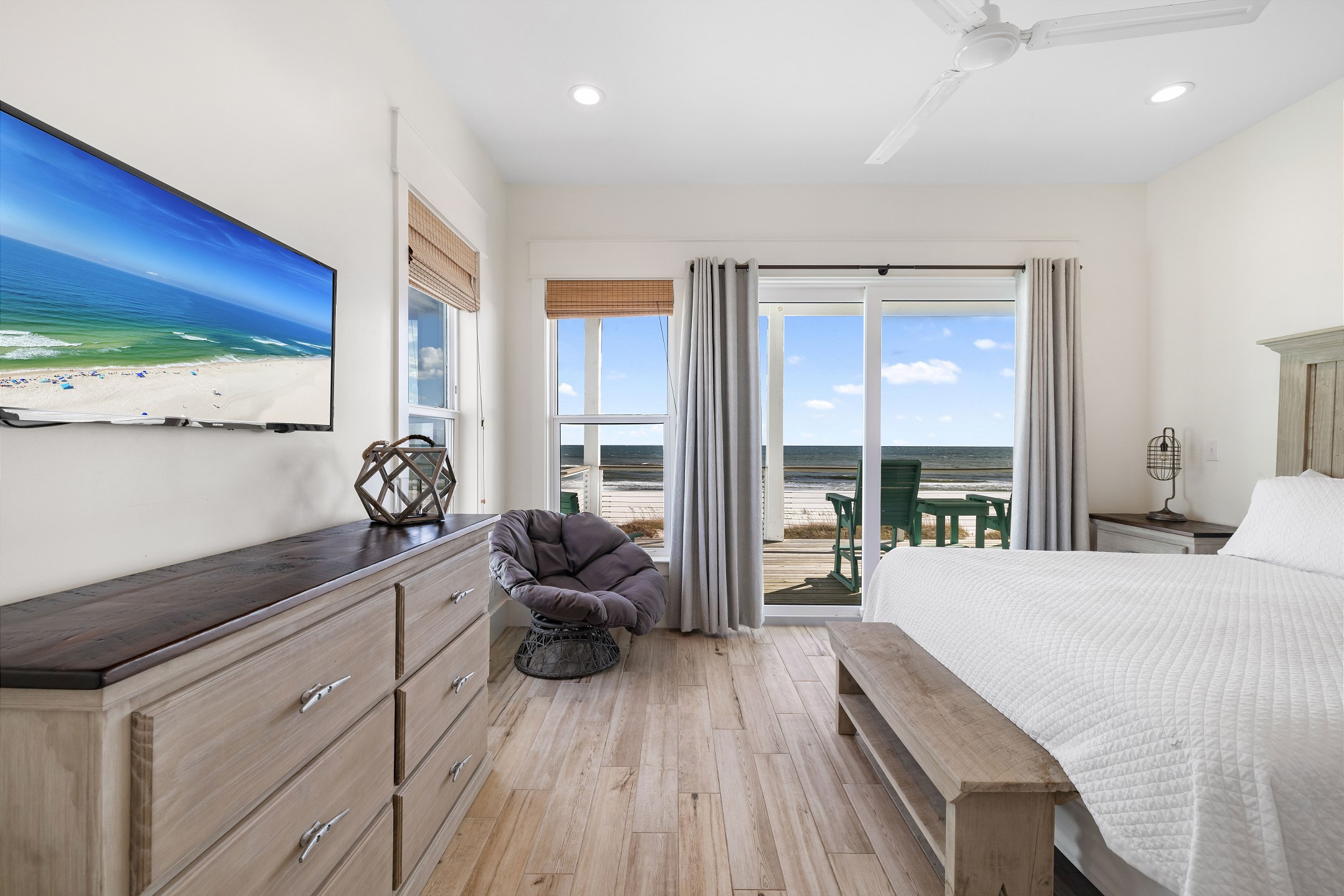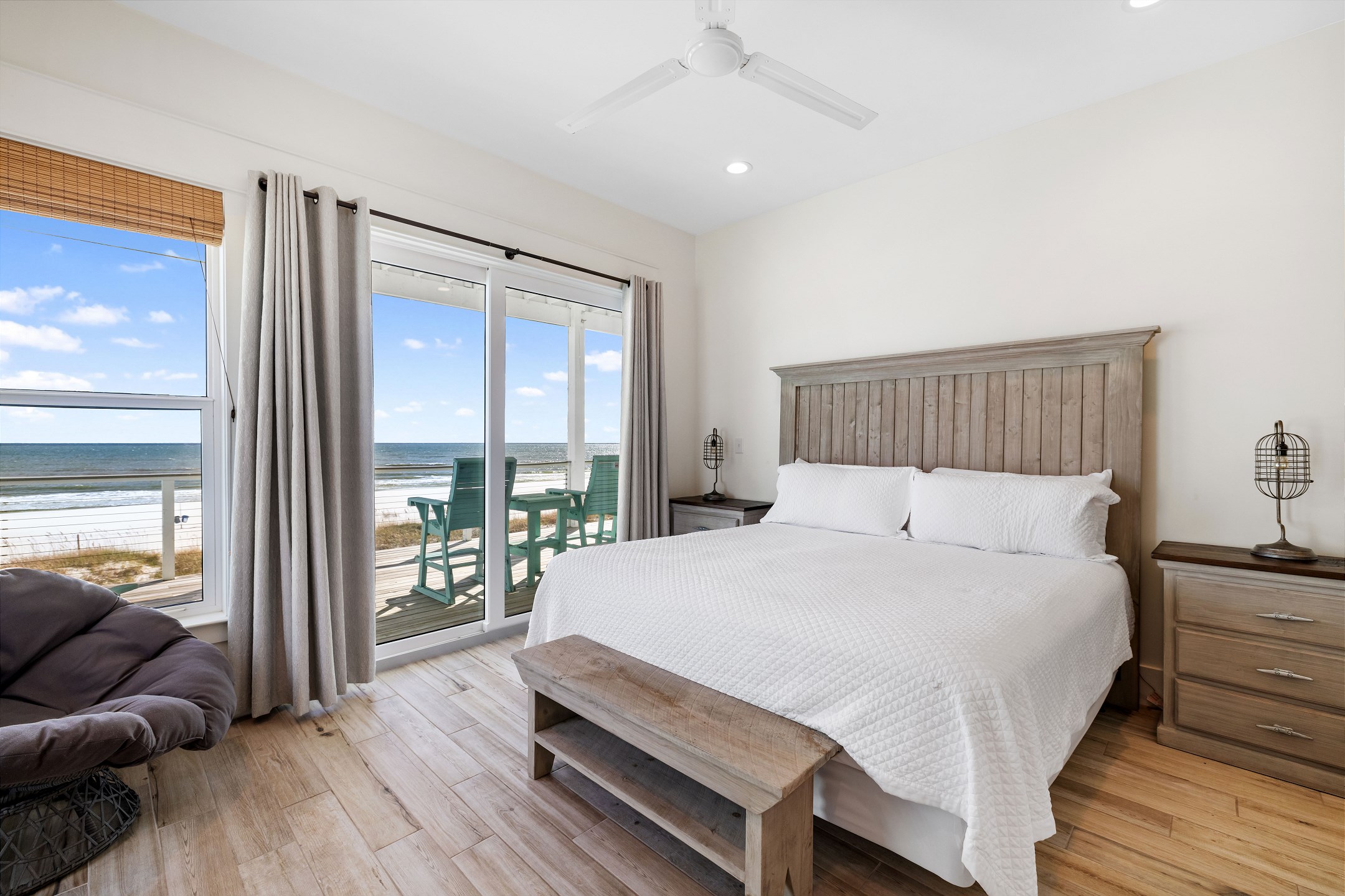 The third floor offers a wet bar, the main king suite with a spacious ensuite bathroom featuring a soaking tub, a large tiled walk in shower, and a double vanity. This suite also has a large private gulf front balcony. The final bedroom provides a king bed, balcony access, and an ensuite bathroom with a tiled walk in shower.