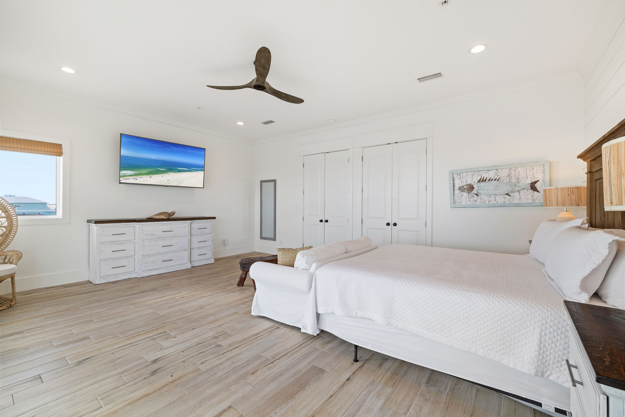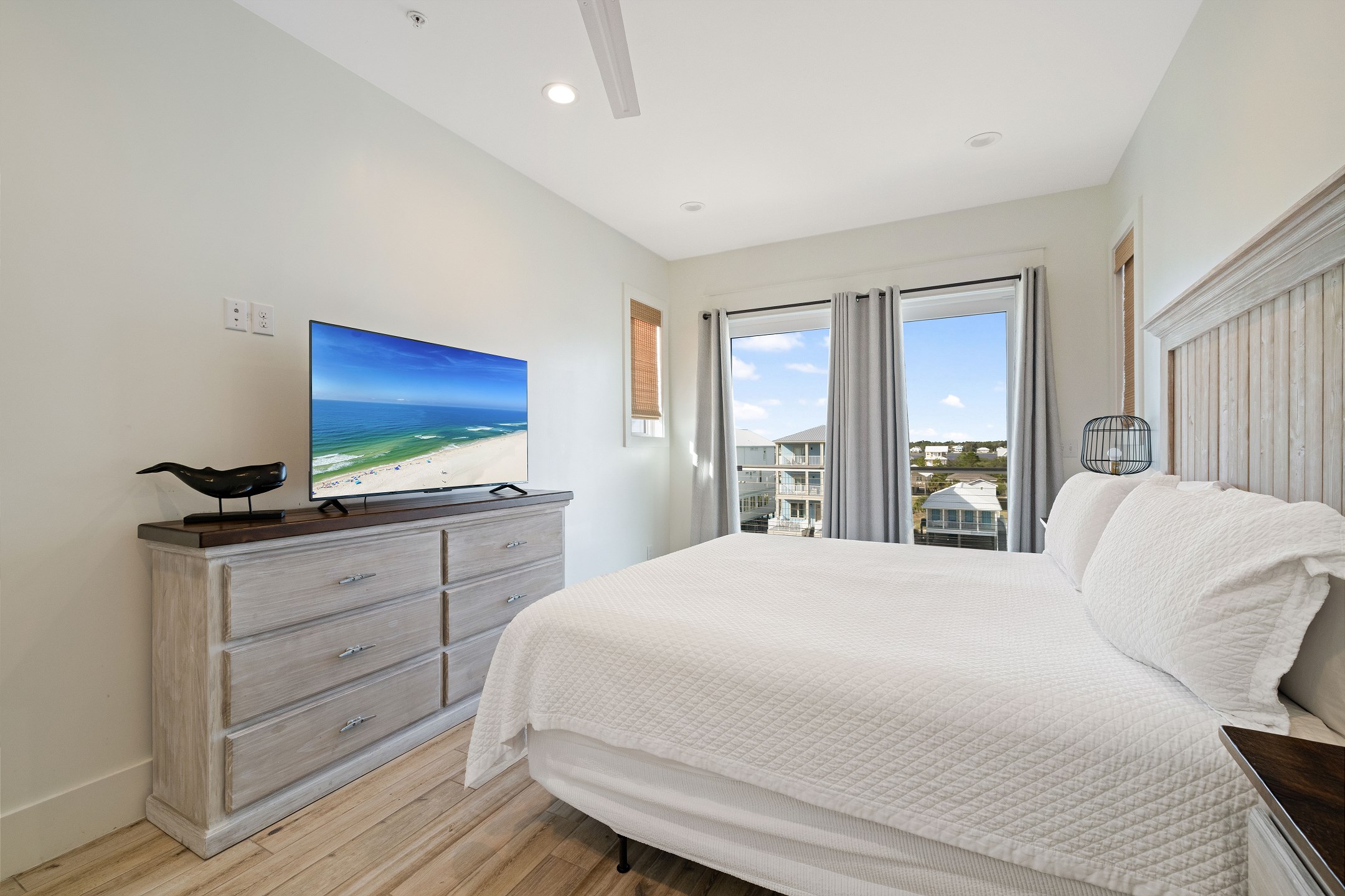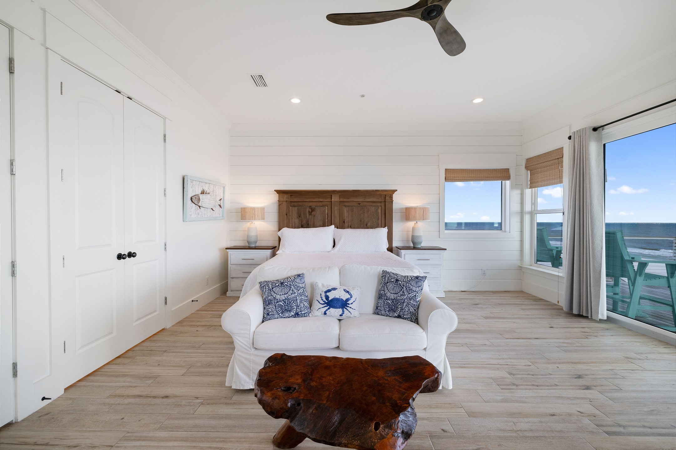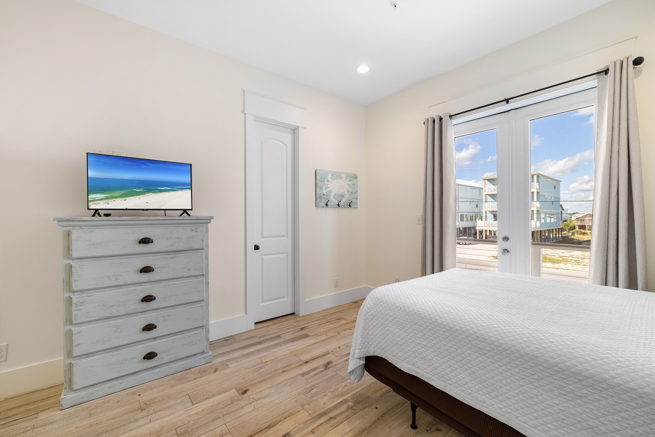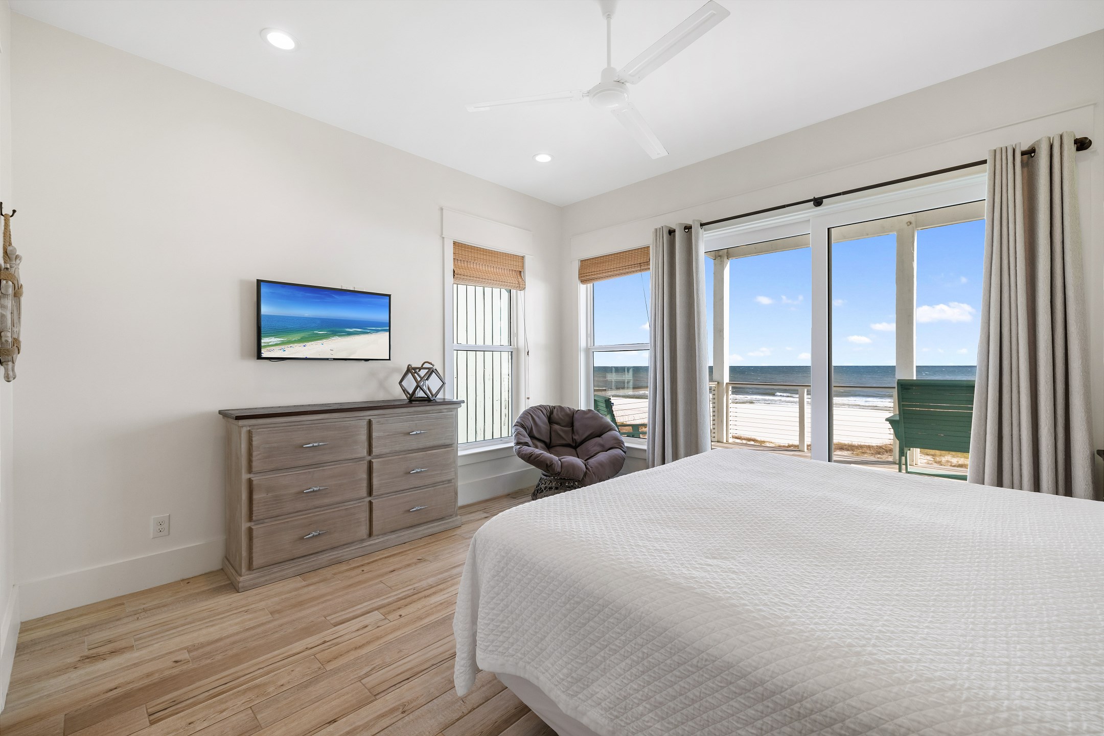 The third floor offers a wet bar, the main king suite with a spacious ensuite bathroom featuring a soaking tub, a large tiled walk in shower, and a double vanity. This suite also has a large private gulf front balcony. The final bedroom provides a king bed, balcony access, and an ensuite bathroom with a tiled walk in shower.