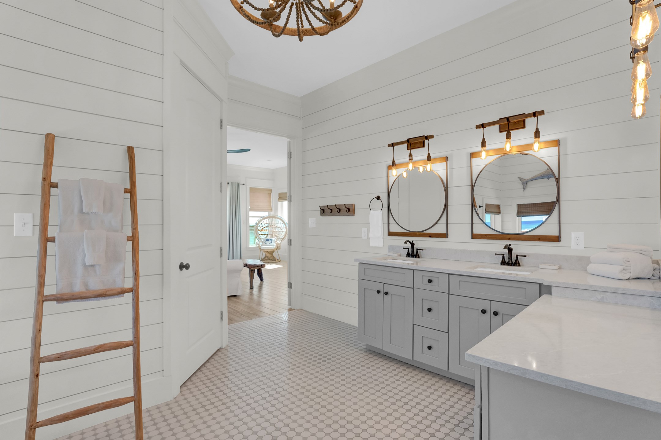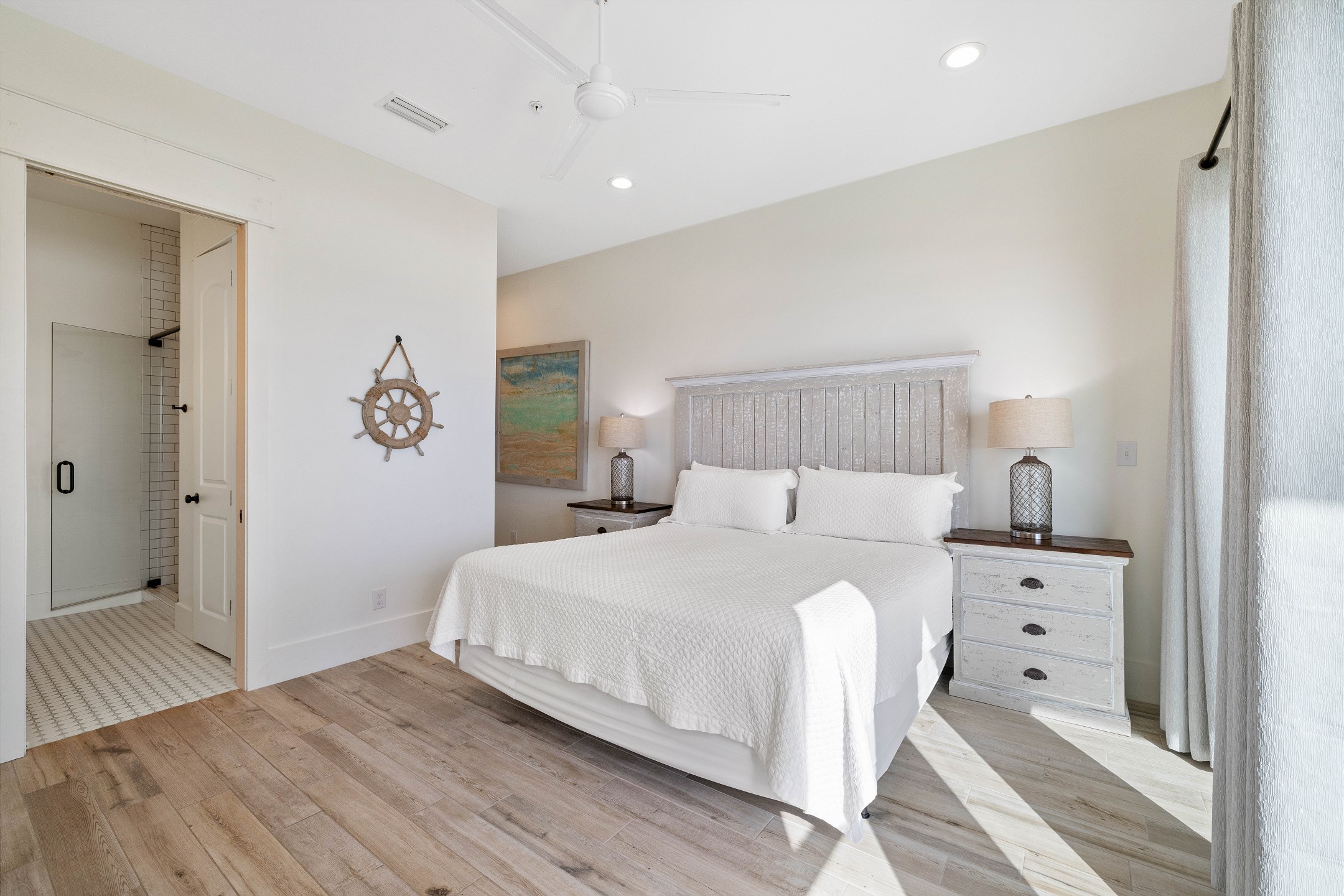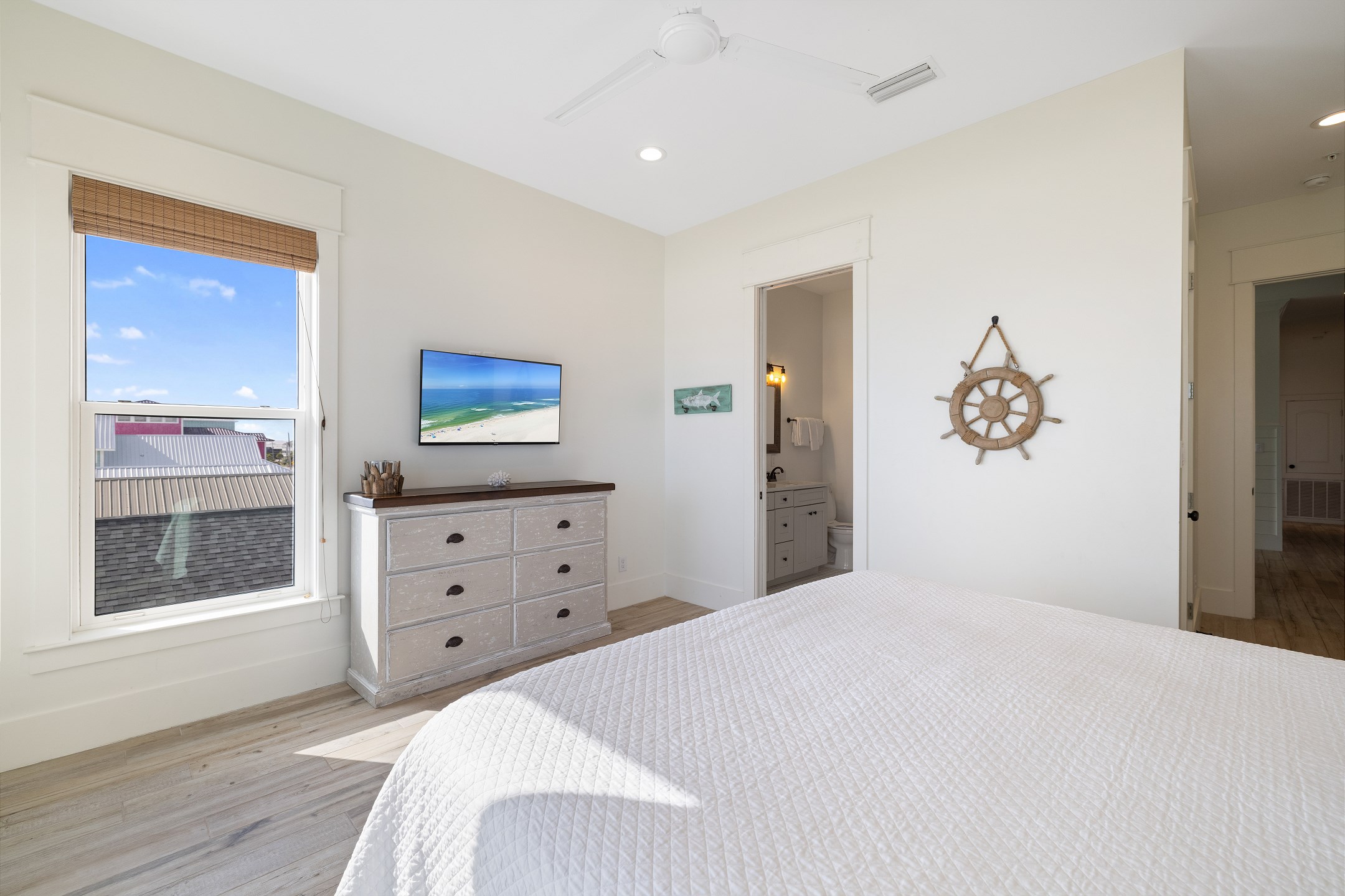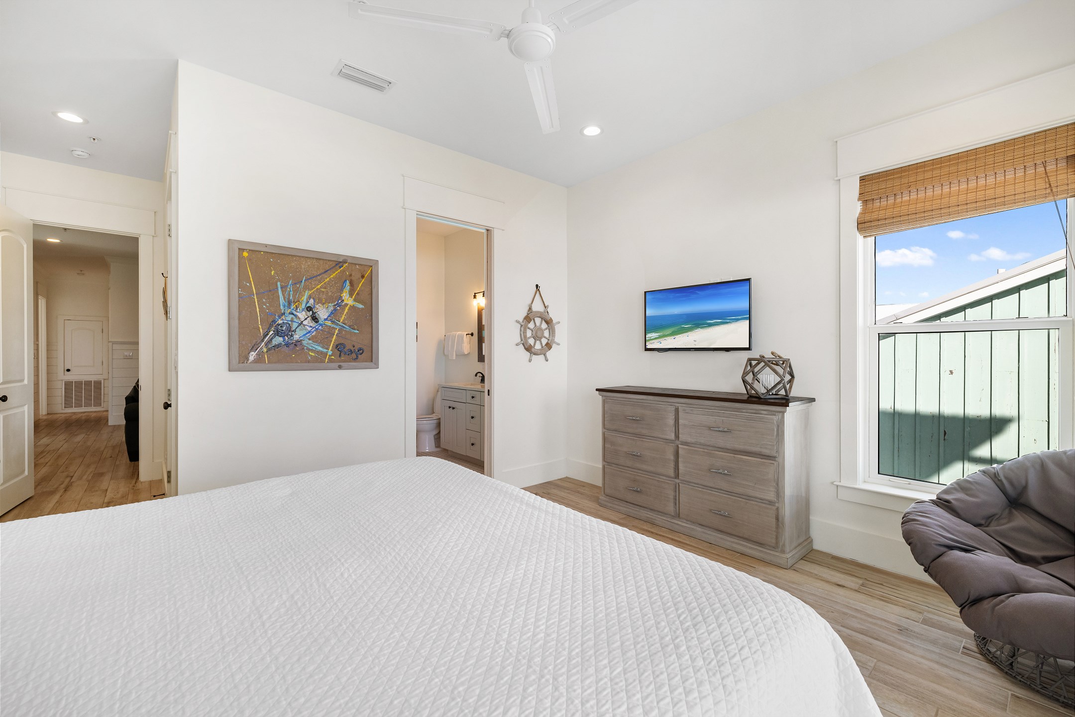 The third floor offers a wet bar, the main king suite with a spacious ensuite bathroom featuring a soaking tub, a large tiled walk in shower, and a double vanity. This suite also has a large private gulf front balcony. The final bedroom provides a king bed, balcony access, and an ensuite bathroom with a tiled walk in shower.