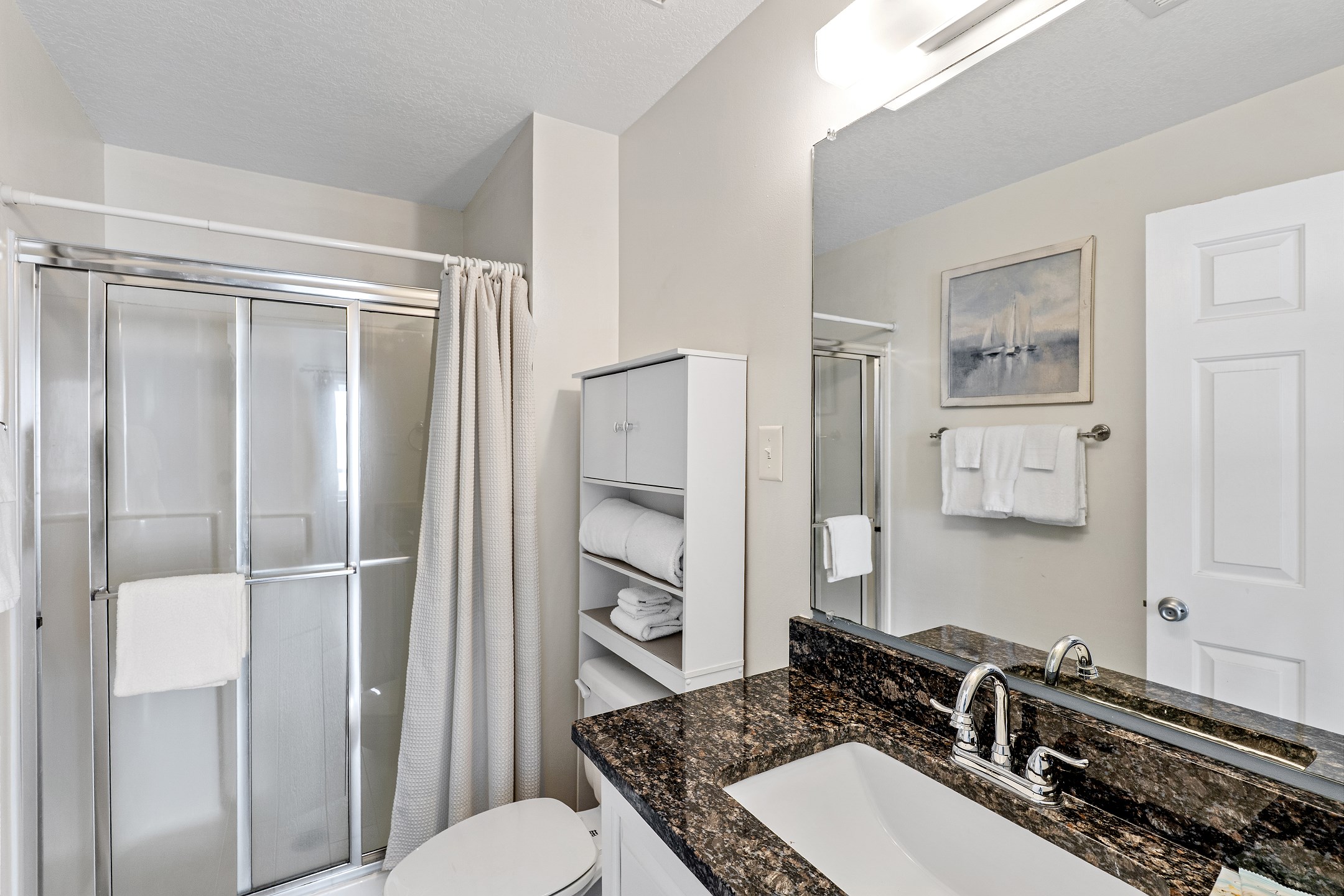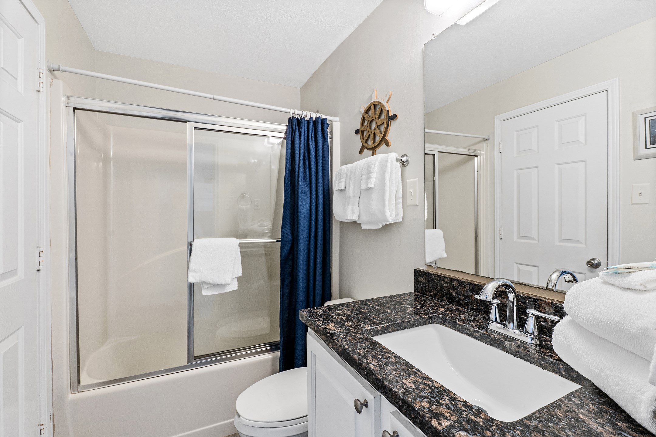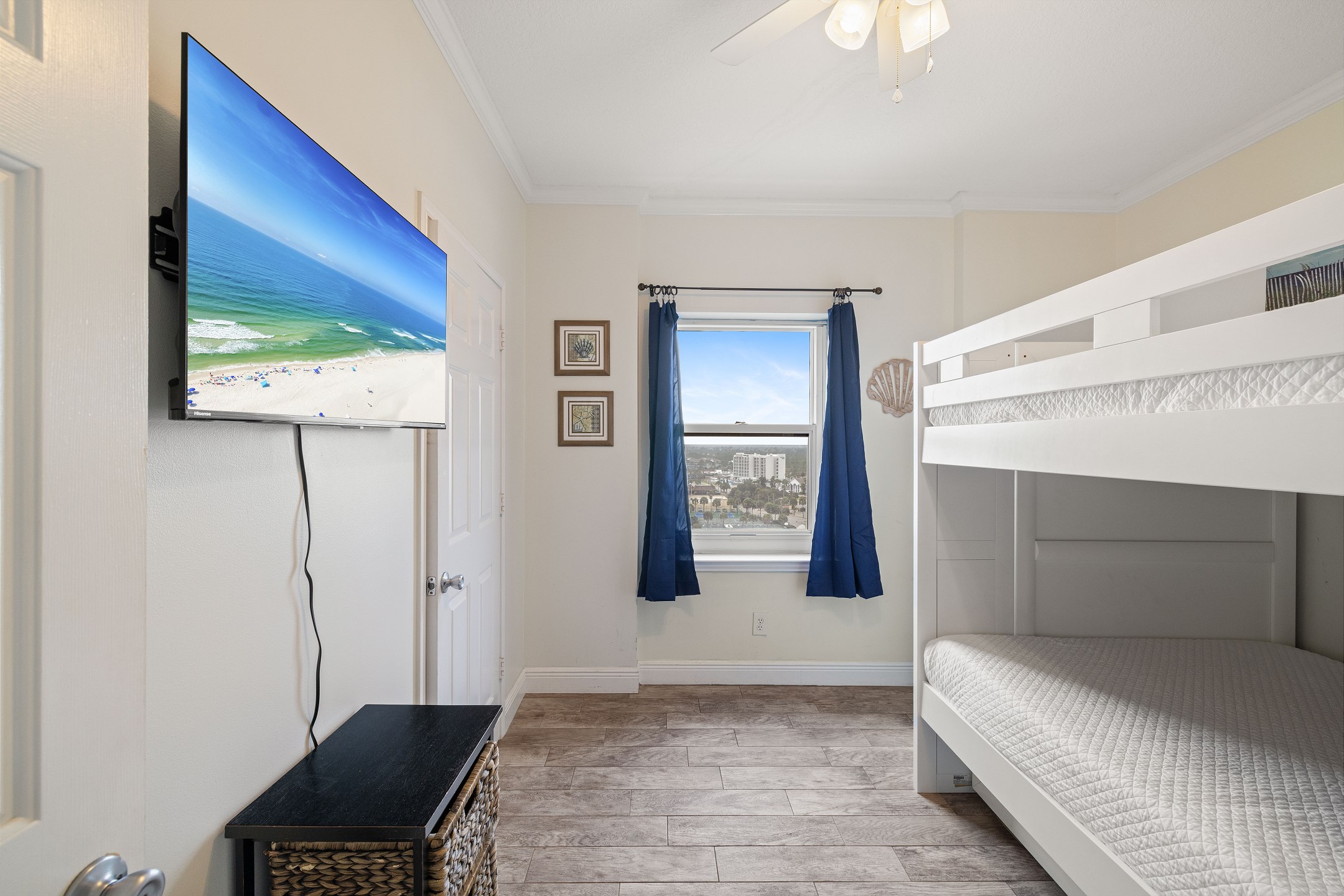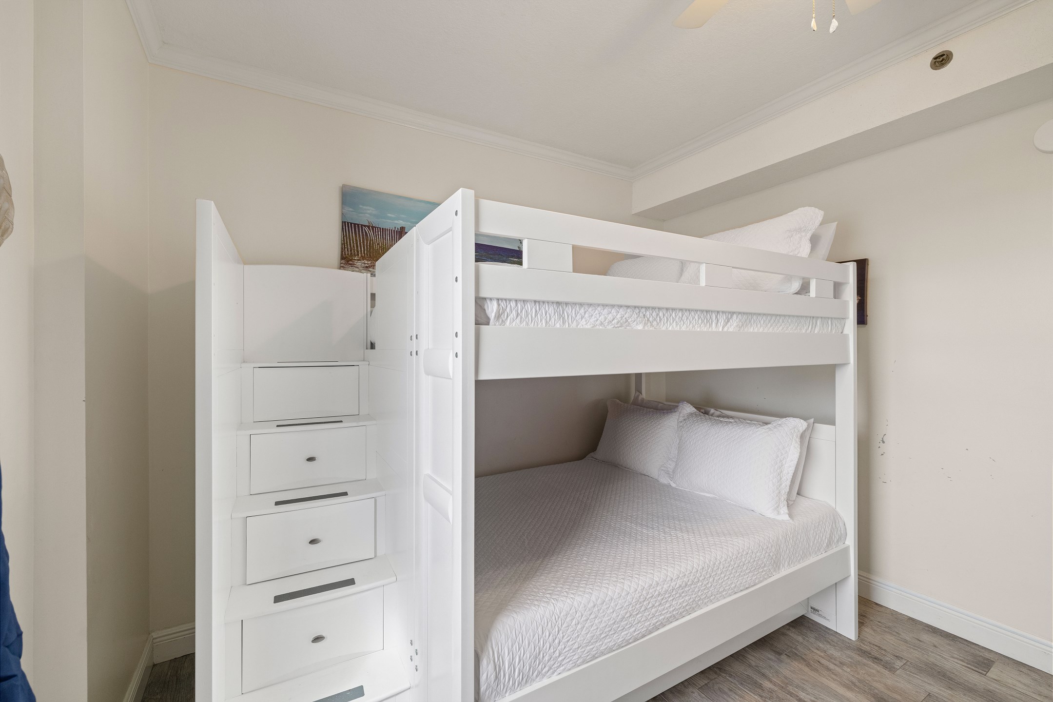 The primary bedroom offers a king bed, beautiful Gulf views, a flat screen TV, and a private ensuite bathroom with a walk in shower. The second bedroom is perfect for families or groups, featuring a full over full bunk bed with a twin trundle that sleeps up to five guests comfortably. A sofa sleeper in the living room provides additional sleeping space.