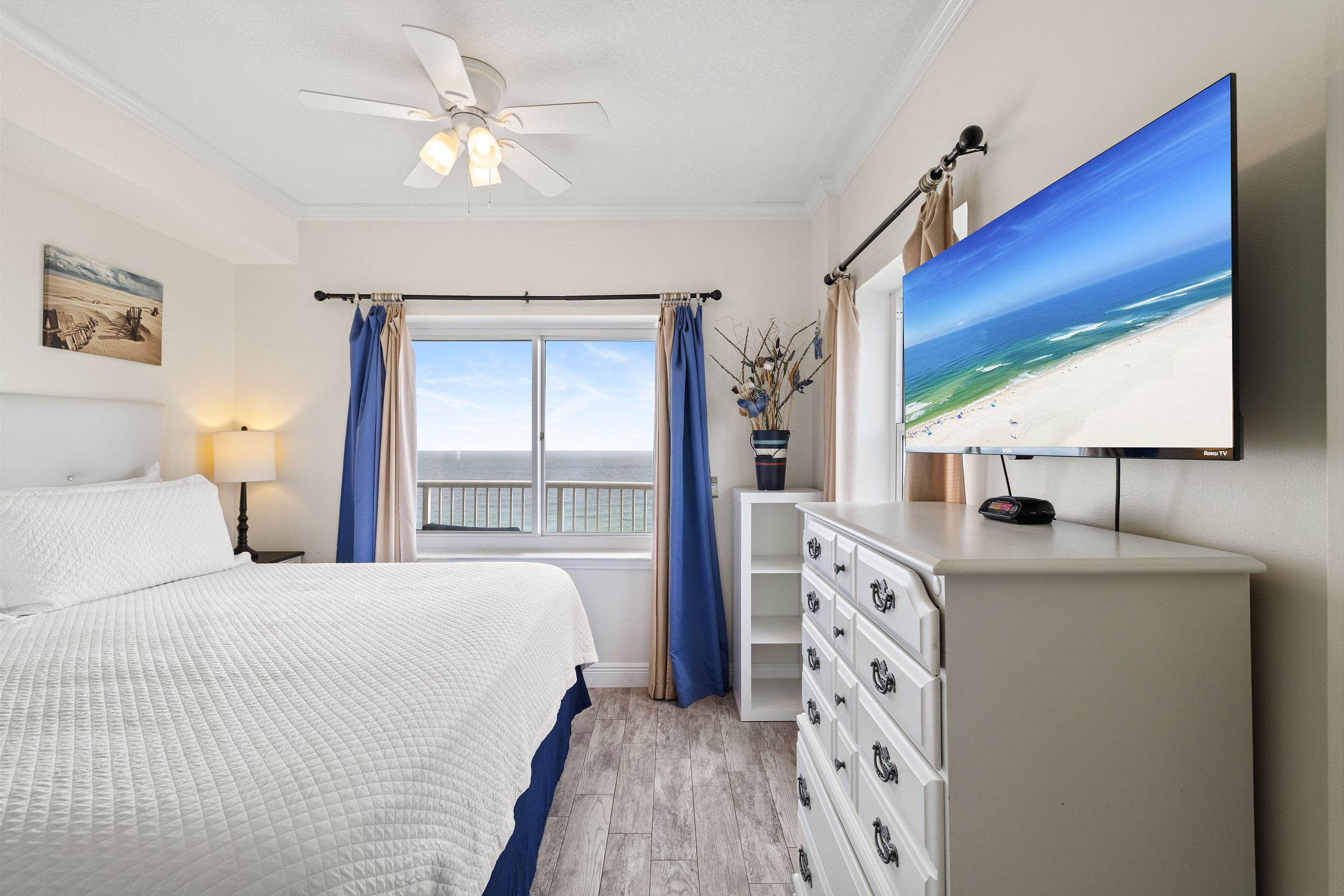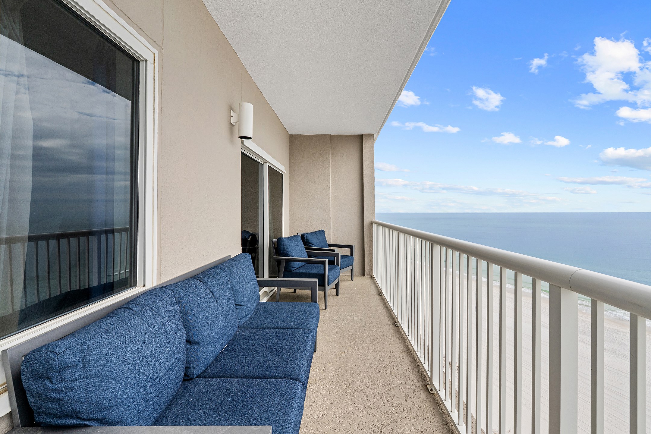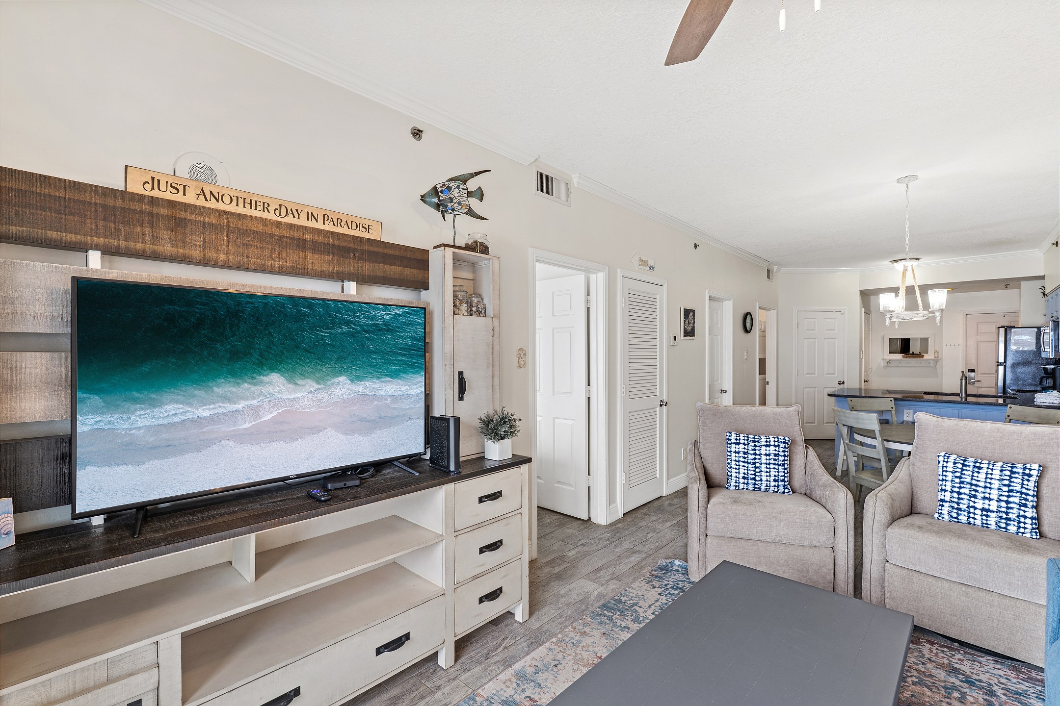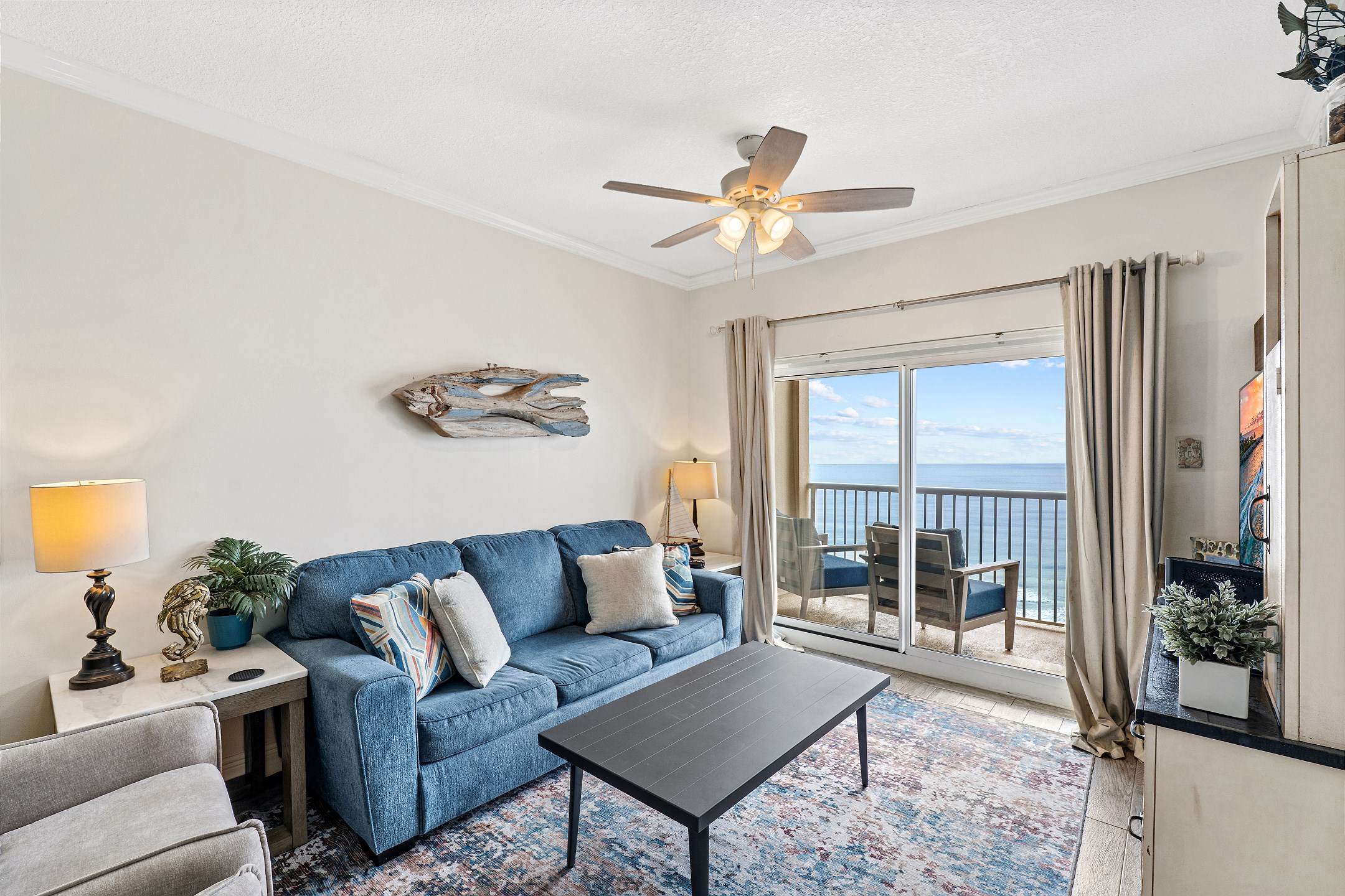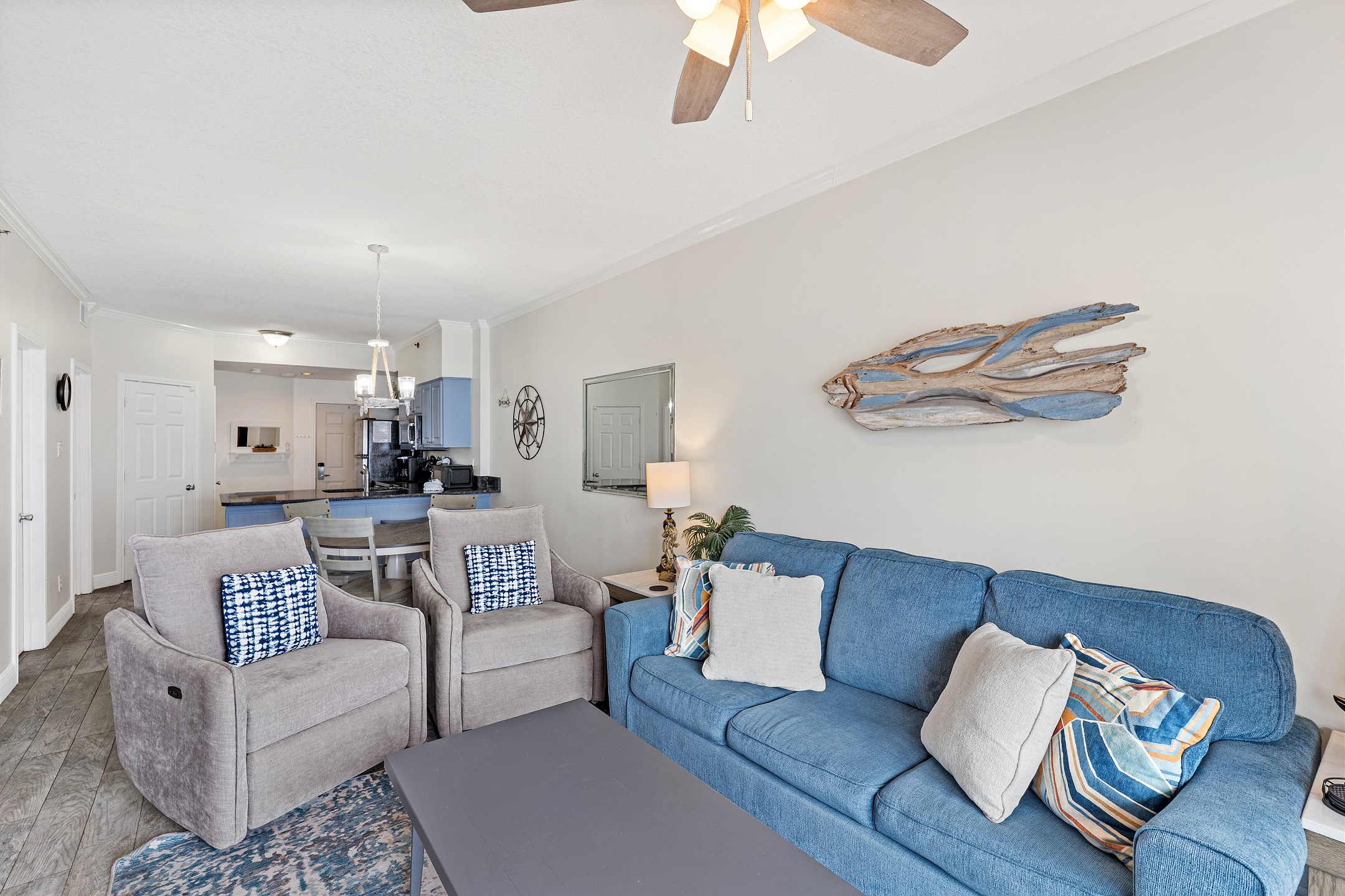 Inside, the bright and comfortable living room offers plenty of seating, a flat screen TV, and direct access to the private balcony overlooking the water. The balcony provides ample seating for relaxing with morning coffee, evening drinks, or simply enjoying the panoramic beach views.