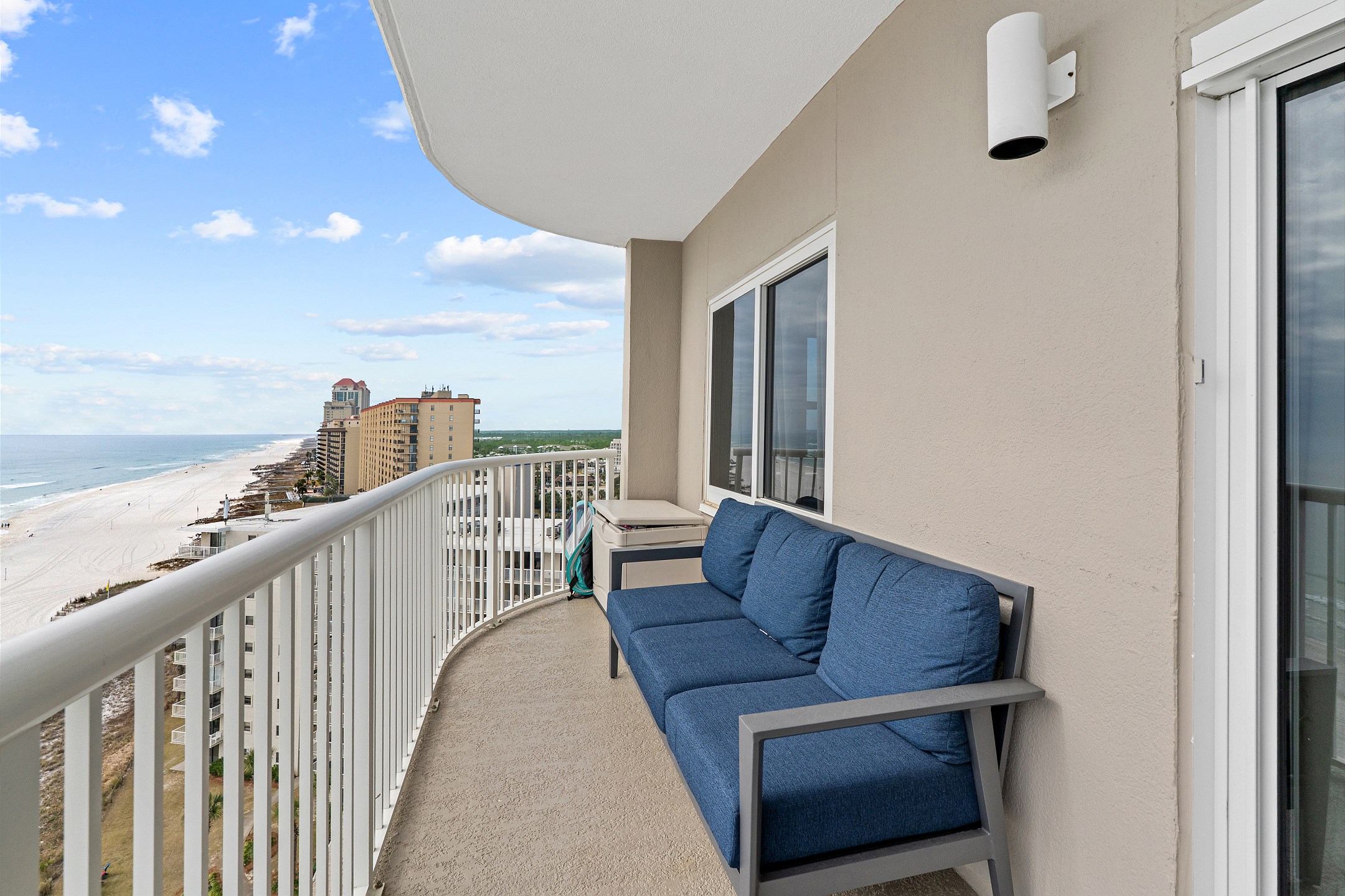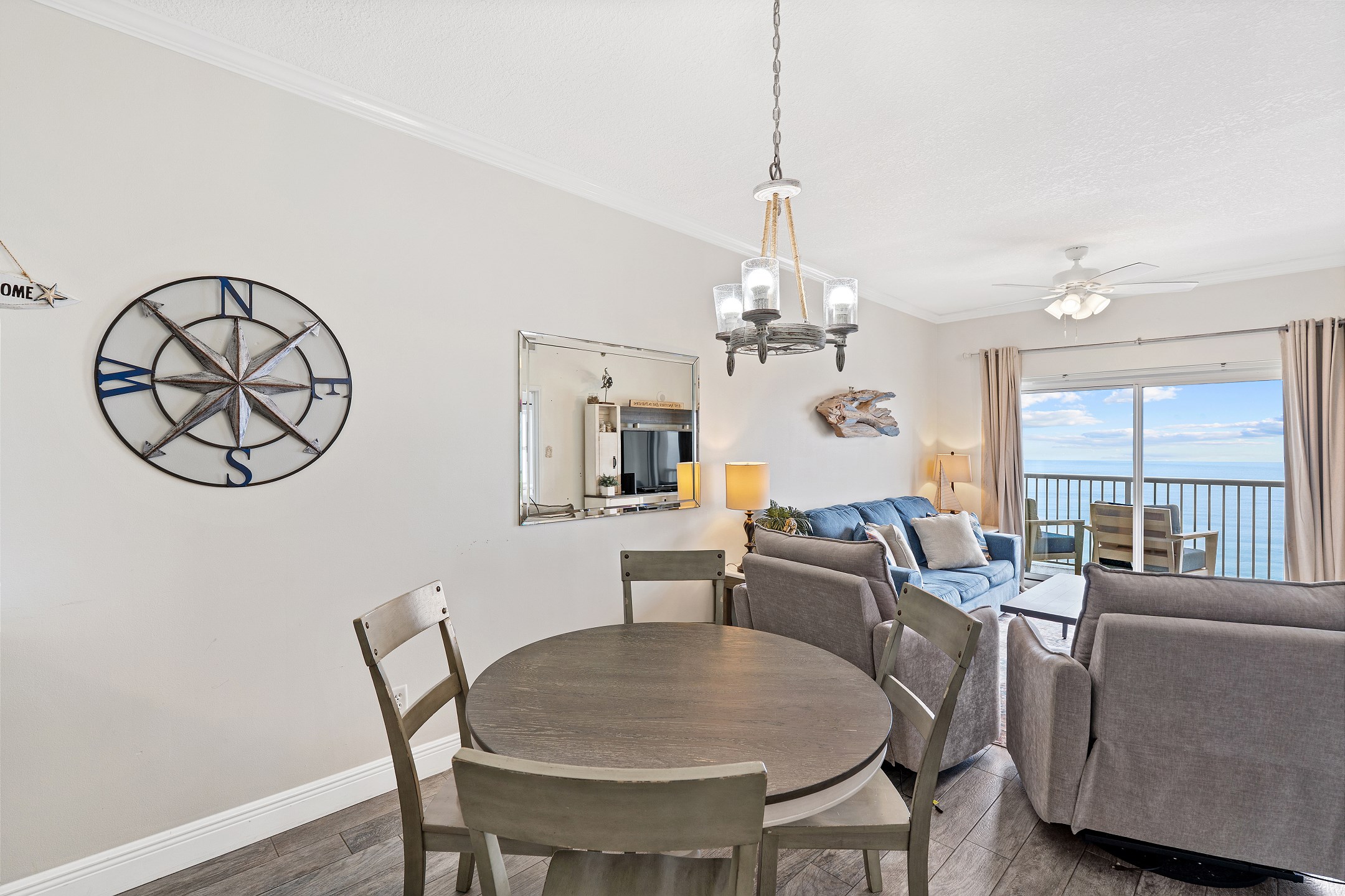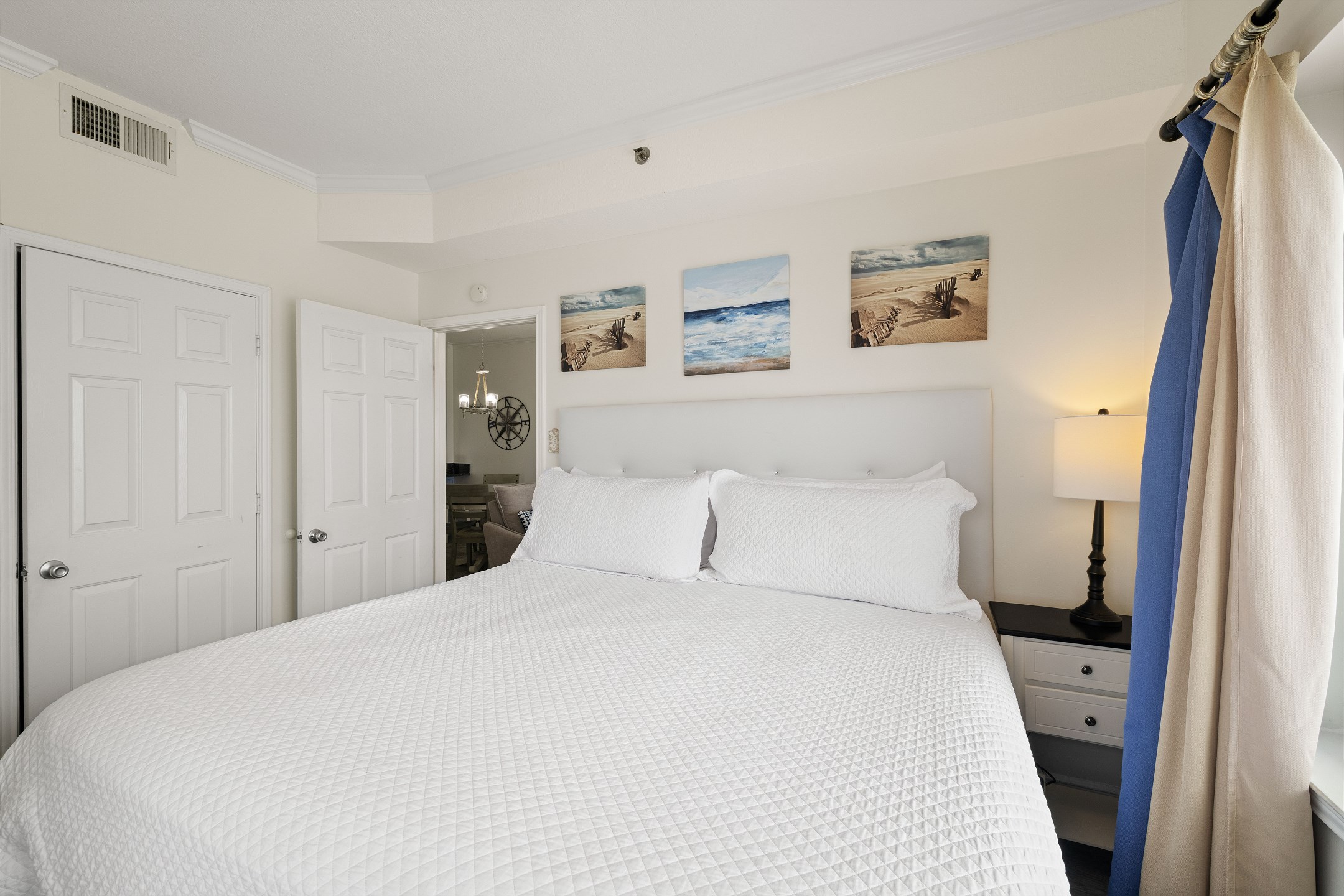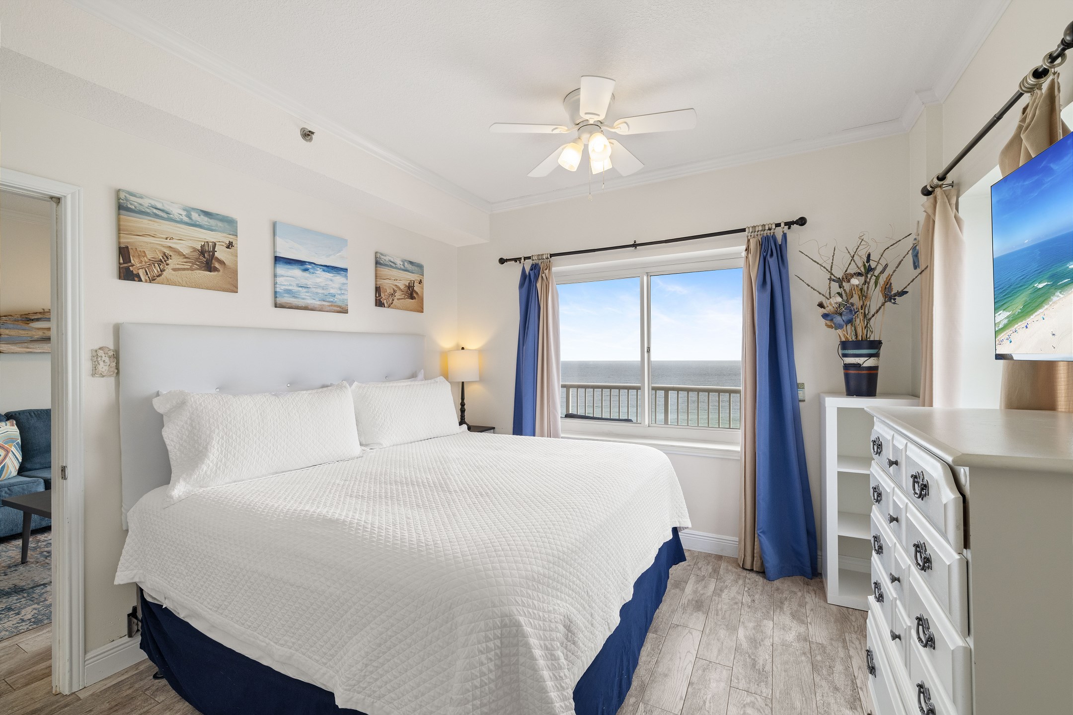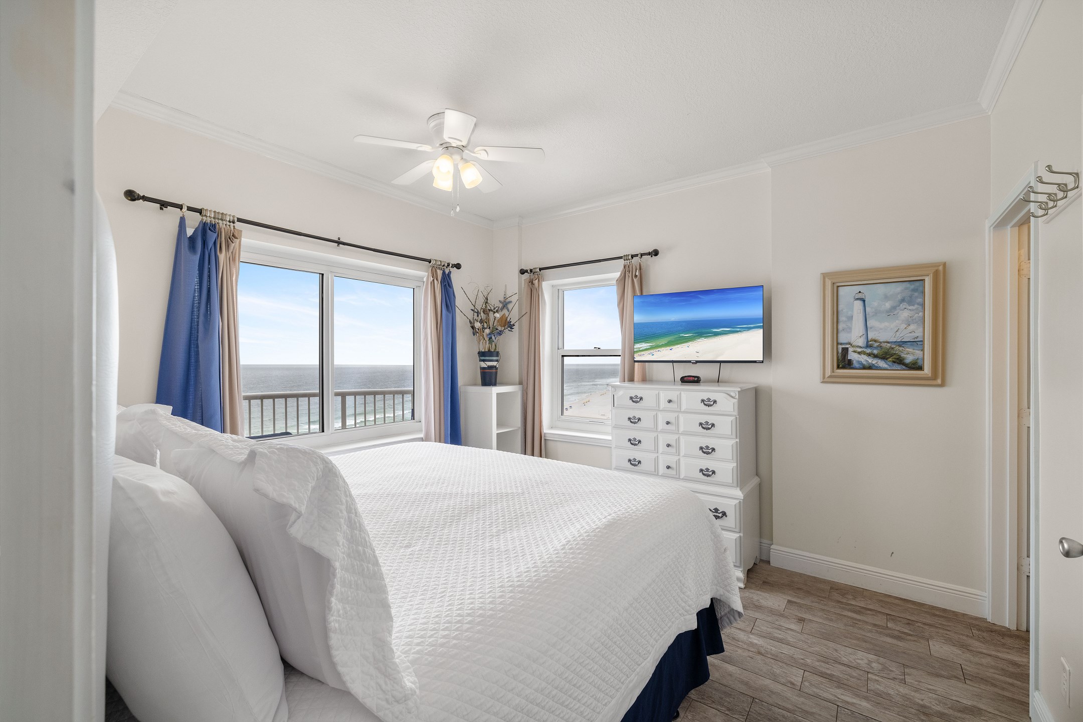 Inside, the bright and comfortable living room offers plenty of seating, a flat screen TV, and direct access to the private balcony overlooking the water. The balcony provides ample seating for relaxing with morning coffee, evening drinks, or simply enjoying the panoramic beach views.