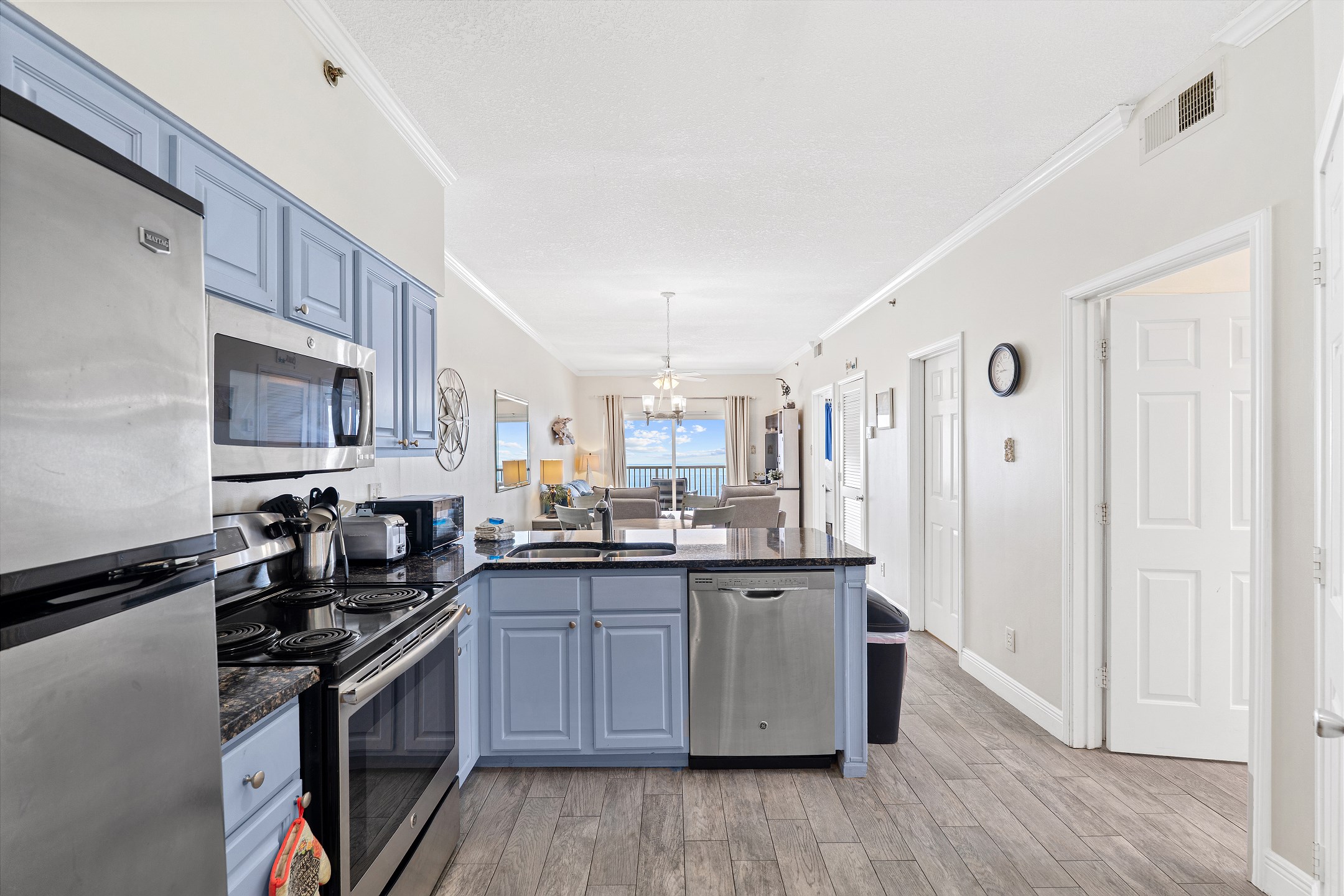 The fully equipped kitchen features stainless steel appliances, granite countertops, and a dining table, making it easy to prepare and enjoy meals together after a day at the beach.