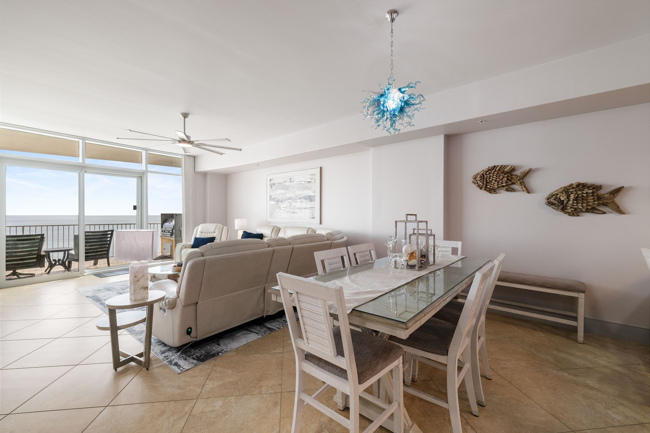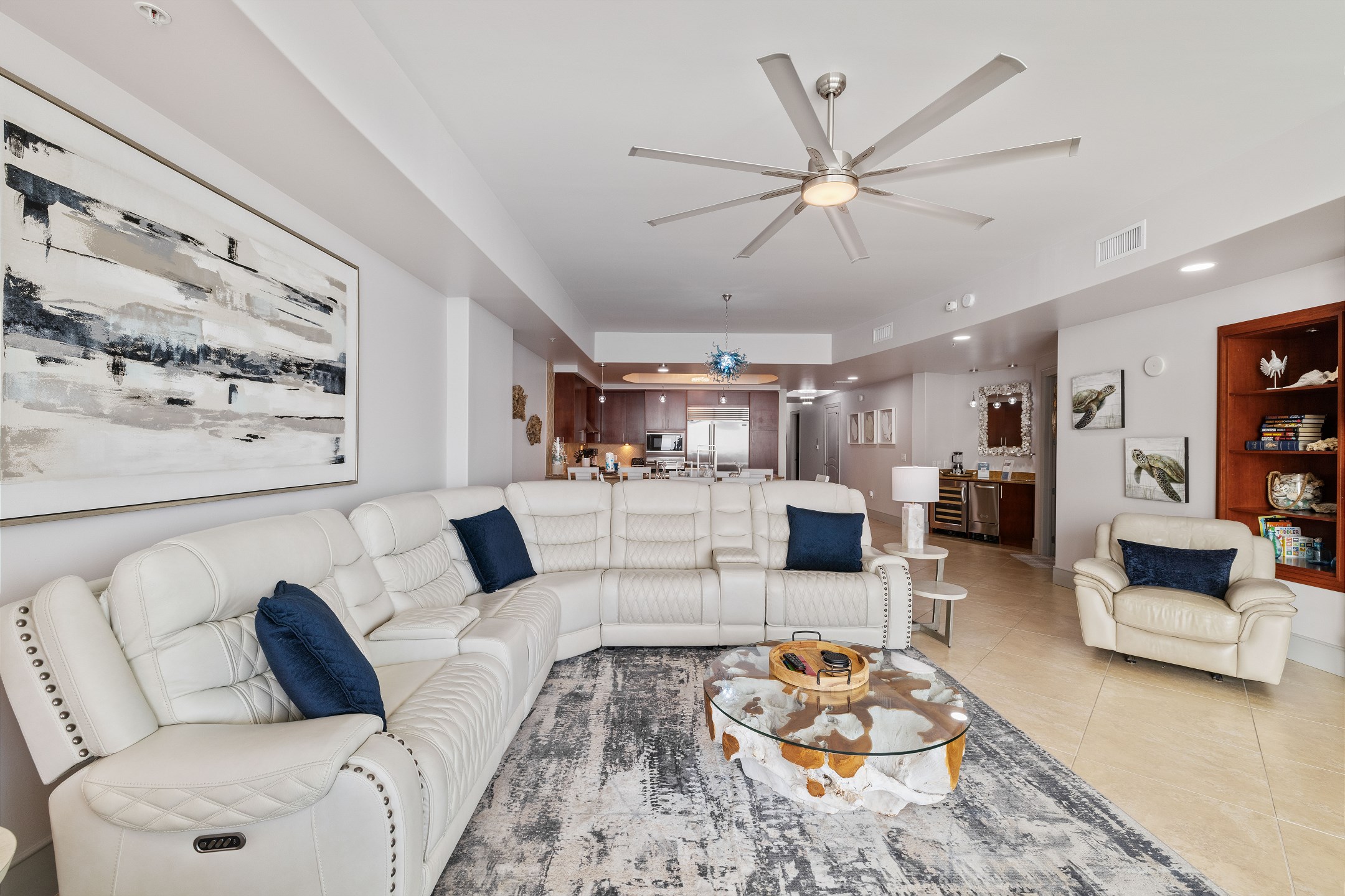 Relax in the comfortable living area, featuring a spacious sectional perfect for gathering and unwinding after a day at the beach. Prepare delicious meals in the fully equipped kitchen, complete with granite countertops, a sub-zero refrigerator, and a convenient wine cooler.