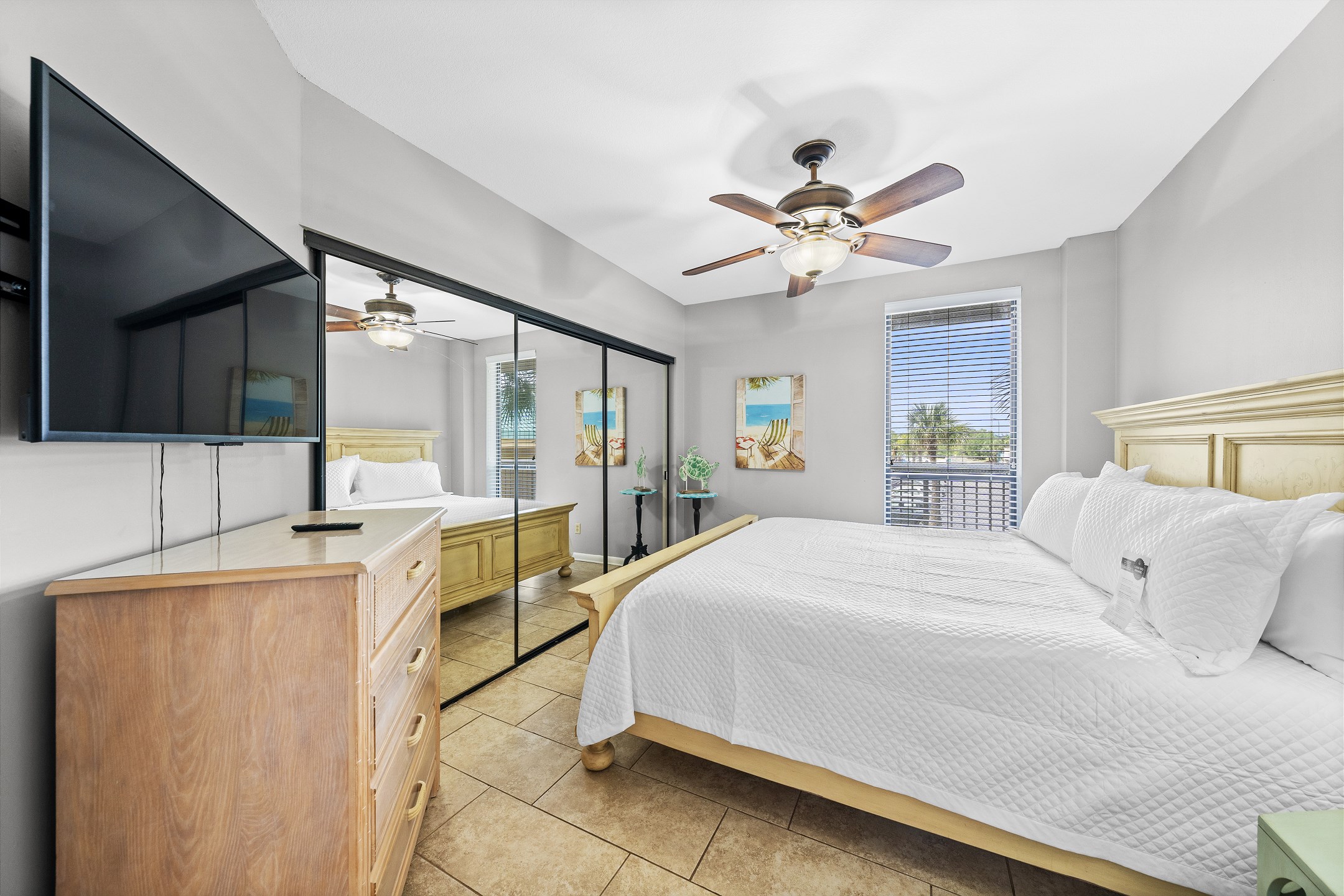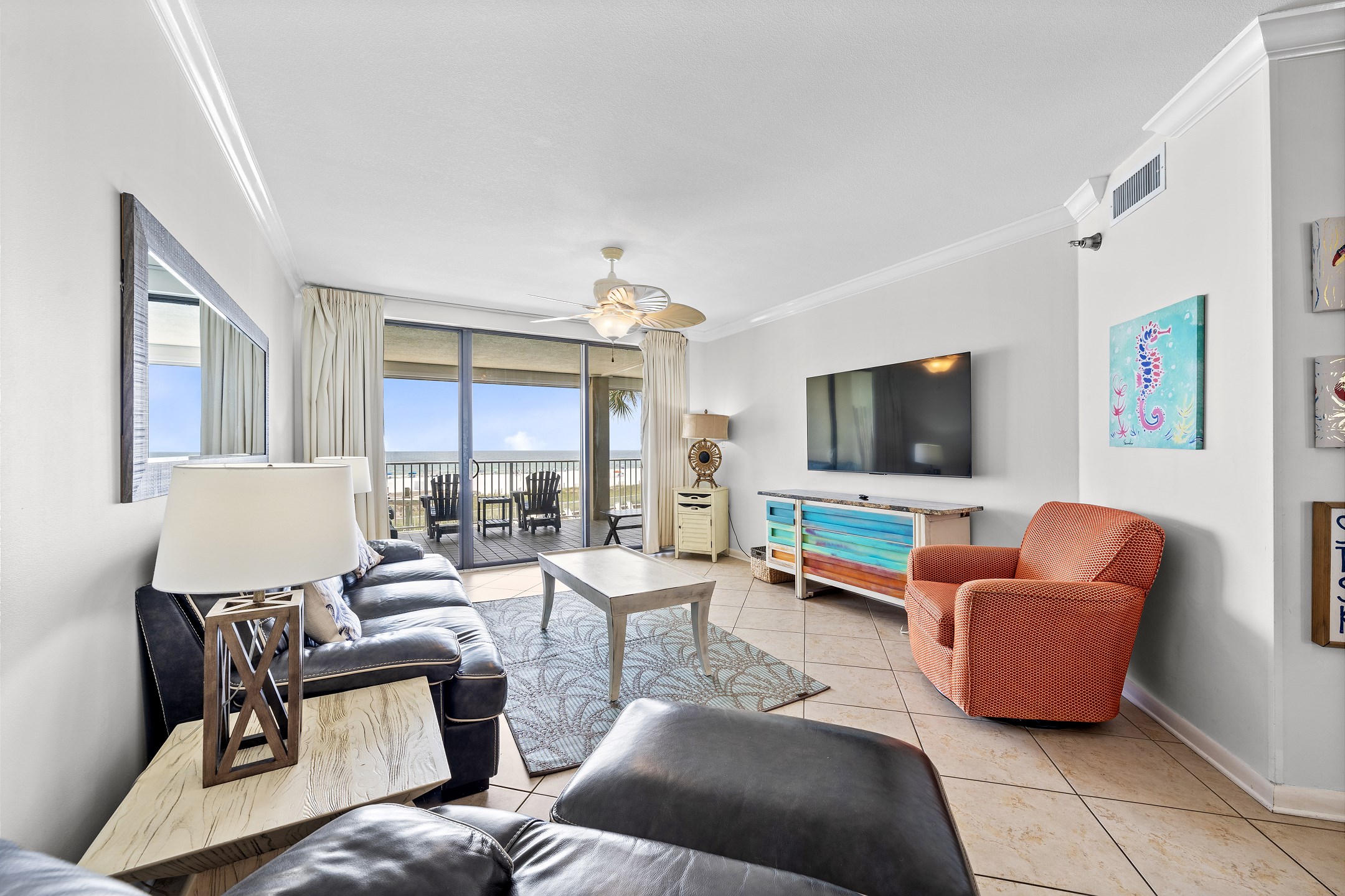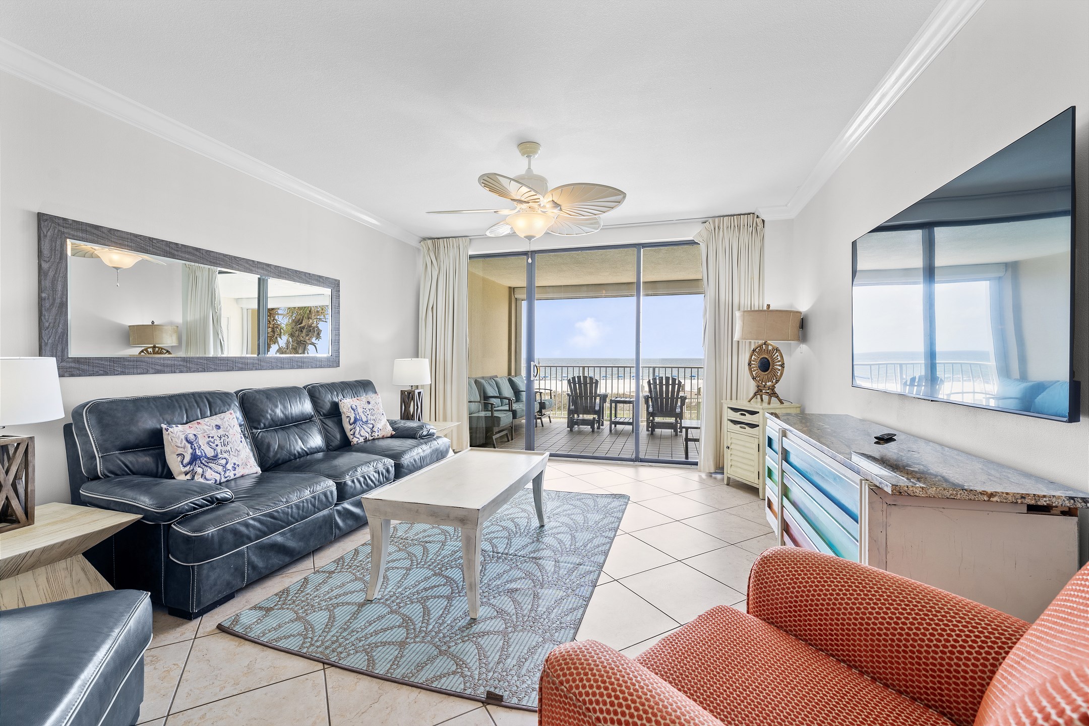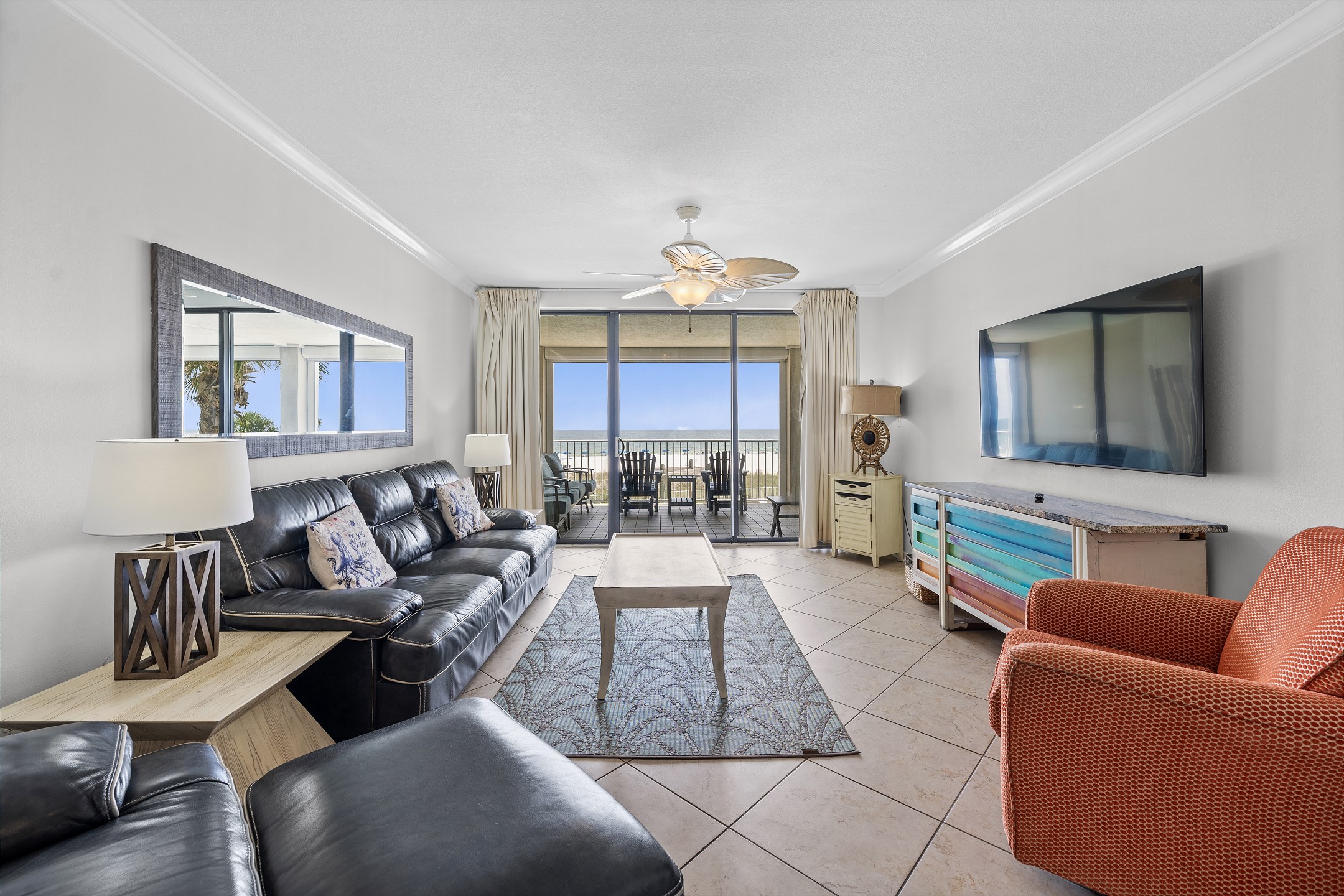 The highlight of this beautiful condo is its private balcony, a serene spot where you can enjoy breathtaking views of the Gulf while sipping your morning coffee or evening cocktail. The Primary suite is a luxurious retreat, featuring a comfortable King bed, a private bath, and direct balcony access for enjoying the gentle coastal breeze. The second bedroom also offers a King bed, providing a peaceful haven for additional guests. The third bedroom is perfect for families, offering two Queen beds, ensuring ample sleeping space for up to 8 guests. Each guest room is thoughtfully equipped with a flat-screen TV for entertainment, making relaxation easy.