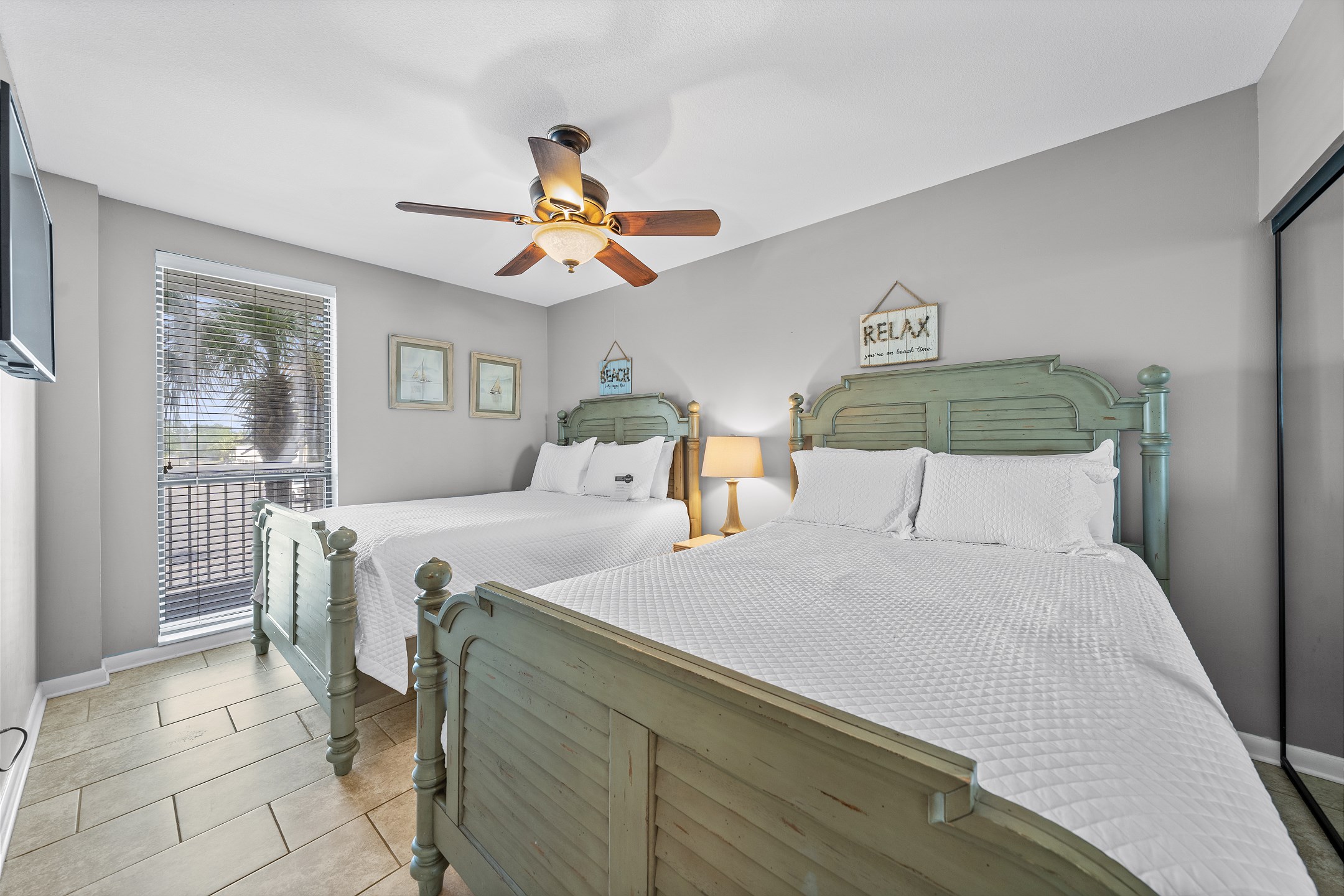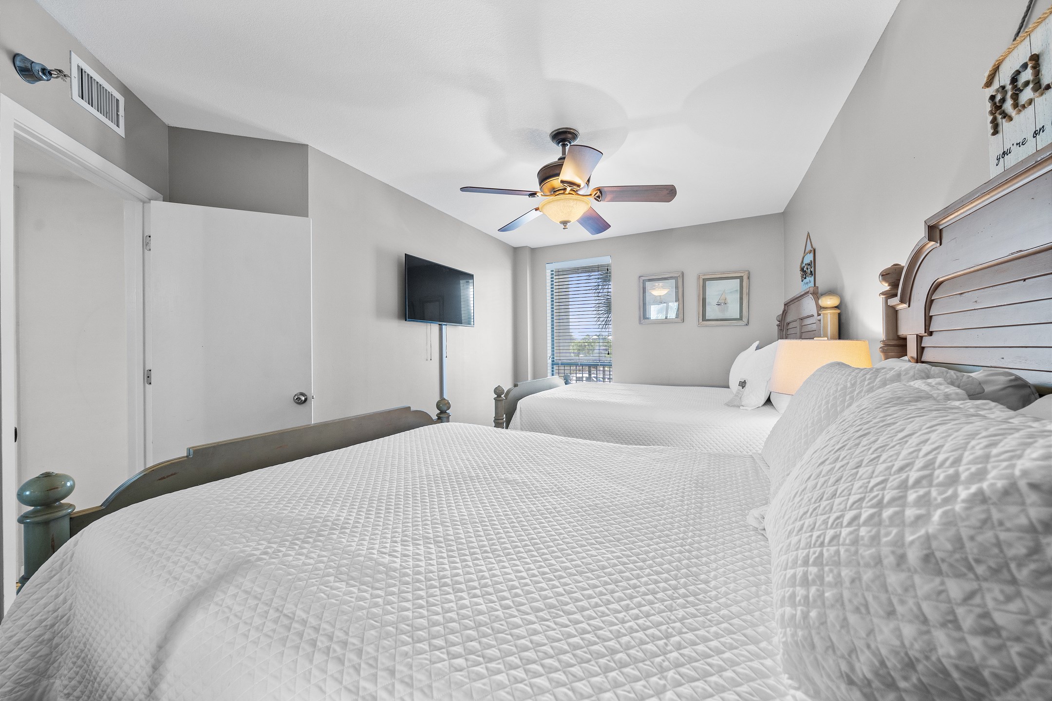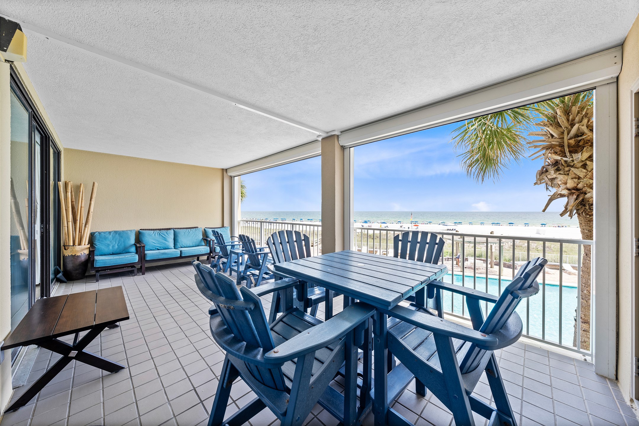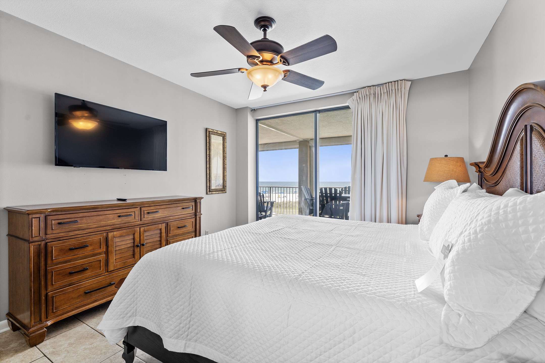 The highlight of this beautiful condo is its private balcony, a serene spot where you can enjoy breathtaking views of the Gulf while sipping your morning coffee or evening cocktail. The Primary suite is a luxurious retreat, featuring a comfortable King bed, a private bath, and direct balcony access for enjoying the gentle coastal breeze. The second bedroom also offers a King bed, providing a peaceful haven for additional guests. The third bedroom is perfect for families, offering two Queen beds, ensuring ample sleeping space for up to 8 guests. Each guest room is thoughtfully equipped with a flat-screen TV for entertainment, making relaxation easy.