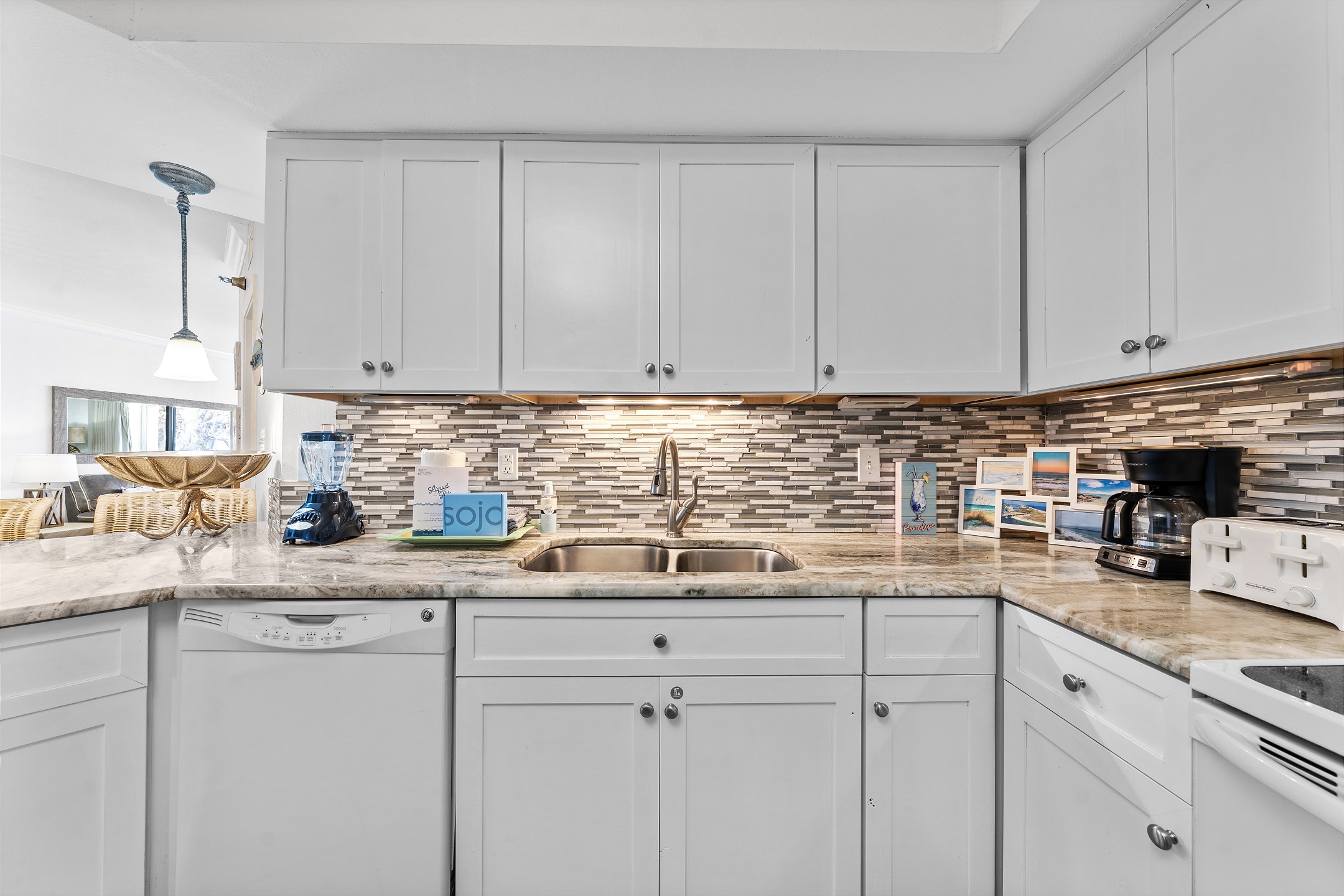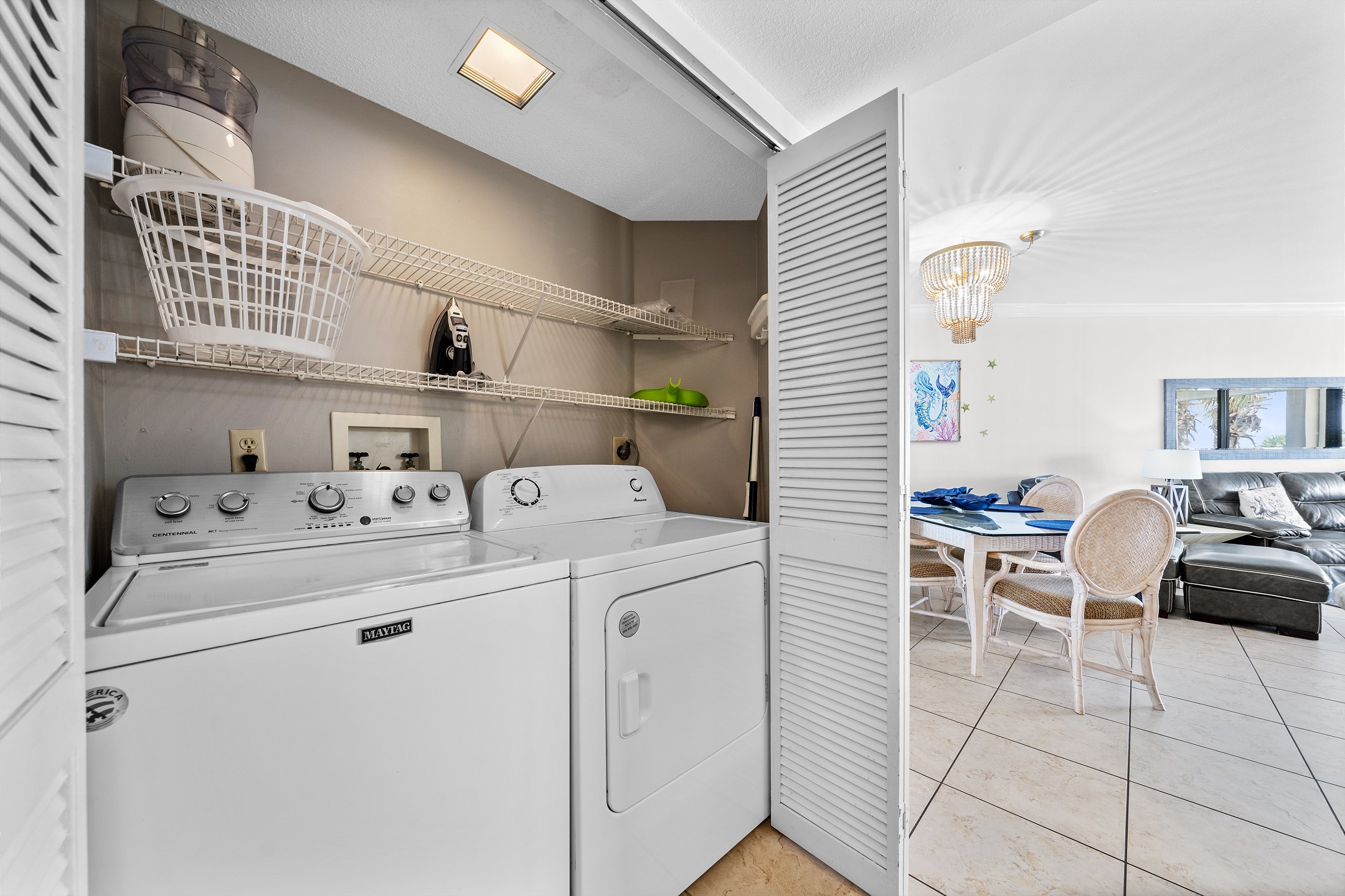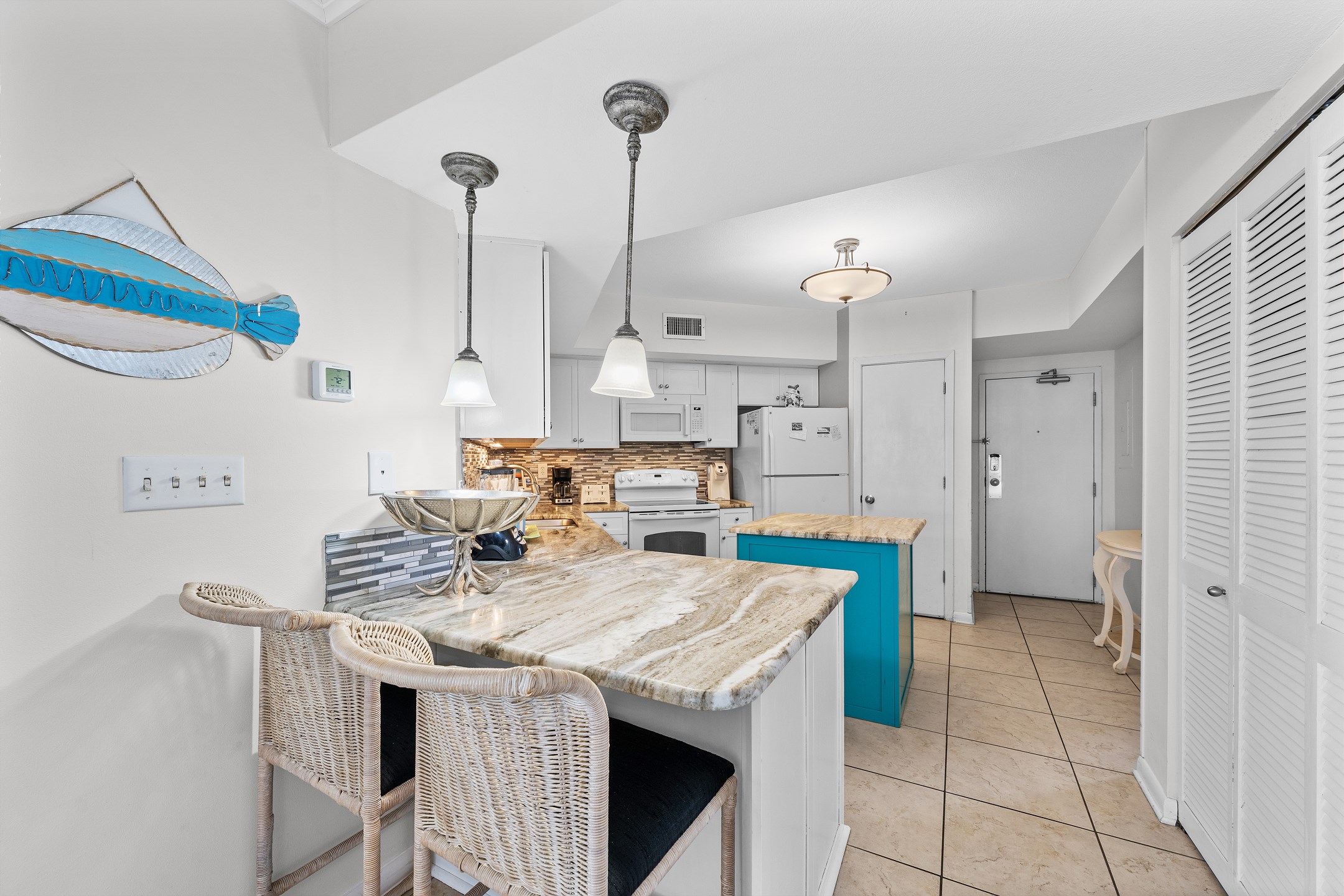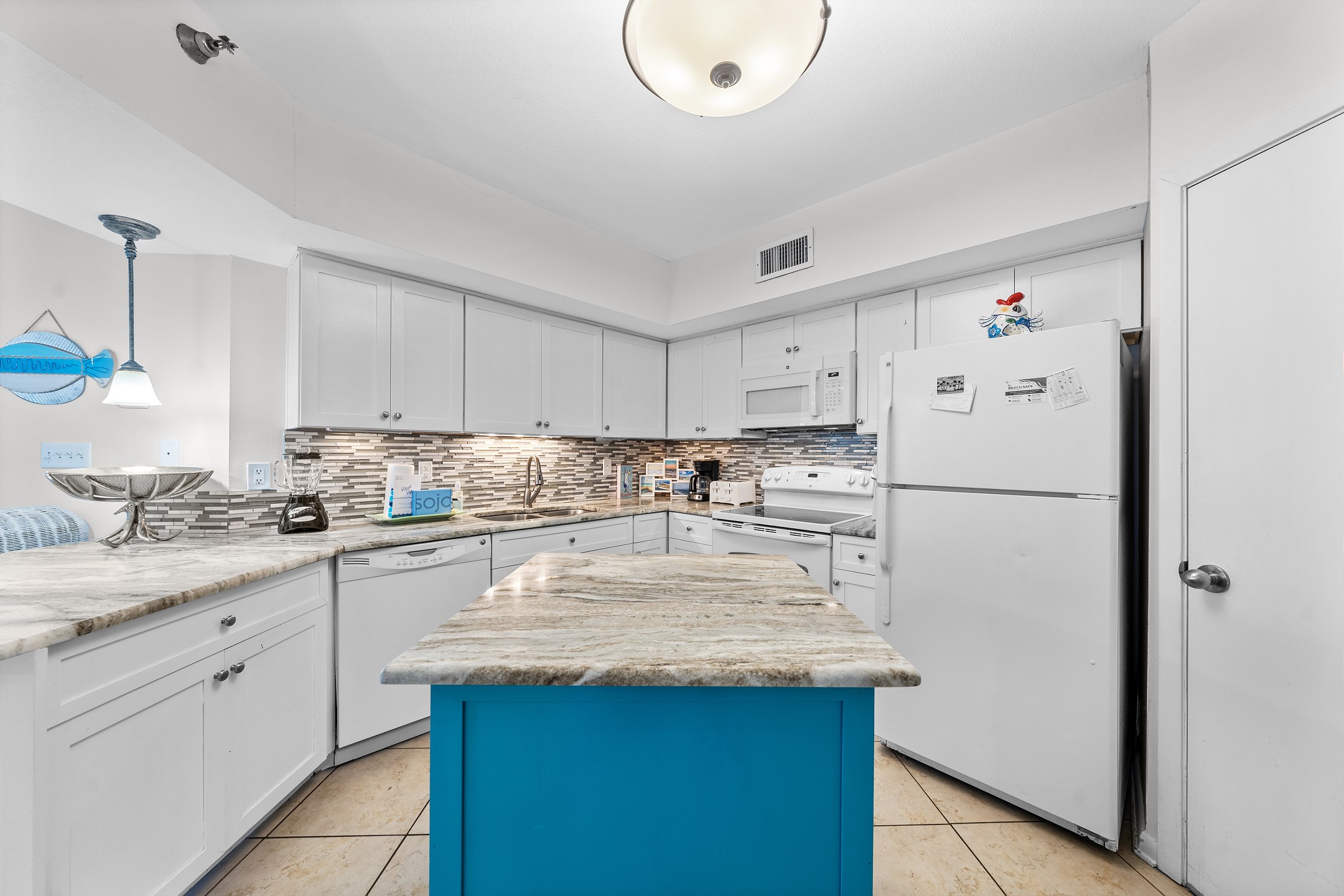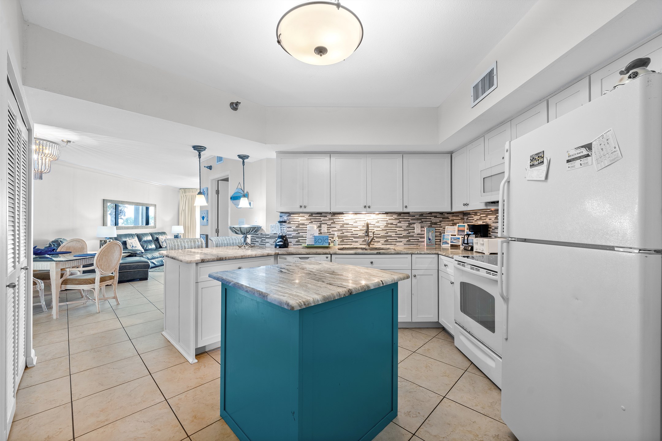 Step inside to discover tile floors in the living area, adding to the coastal ambiance of the space. The fully equipped kitchen is a chef's delight, featuring granite countertops, stainless steel appliances, and a convenient coffee maker for those early mornings. Whether you're preparing a full meal or a quick snack, this kitchen has everything you need. A full-sized washer and dryer are provided for your convenience, ensuring your beachwear stays fresh and ready for your next adventure.