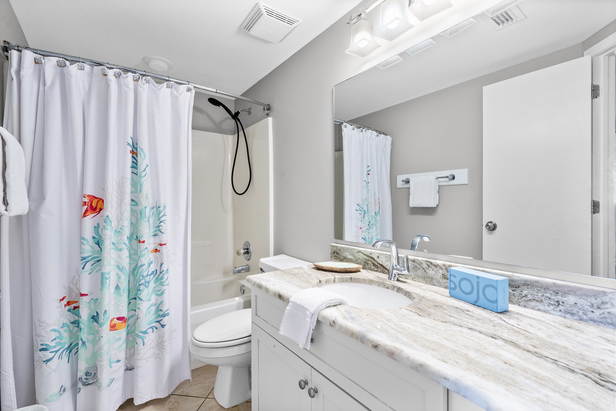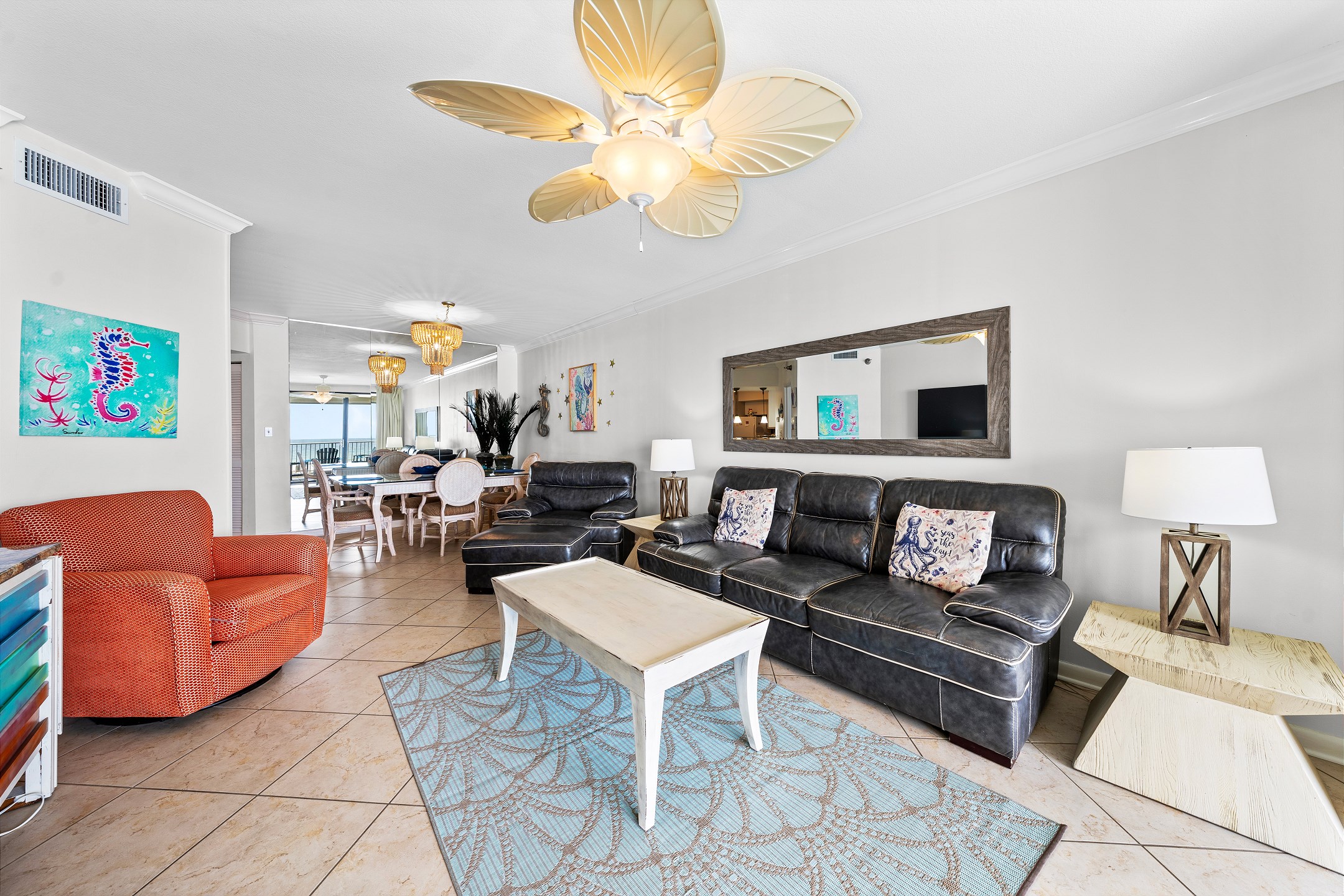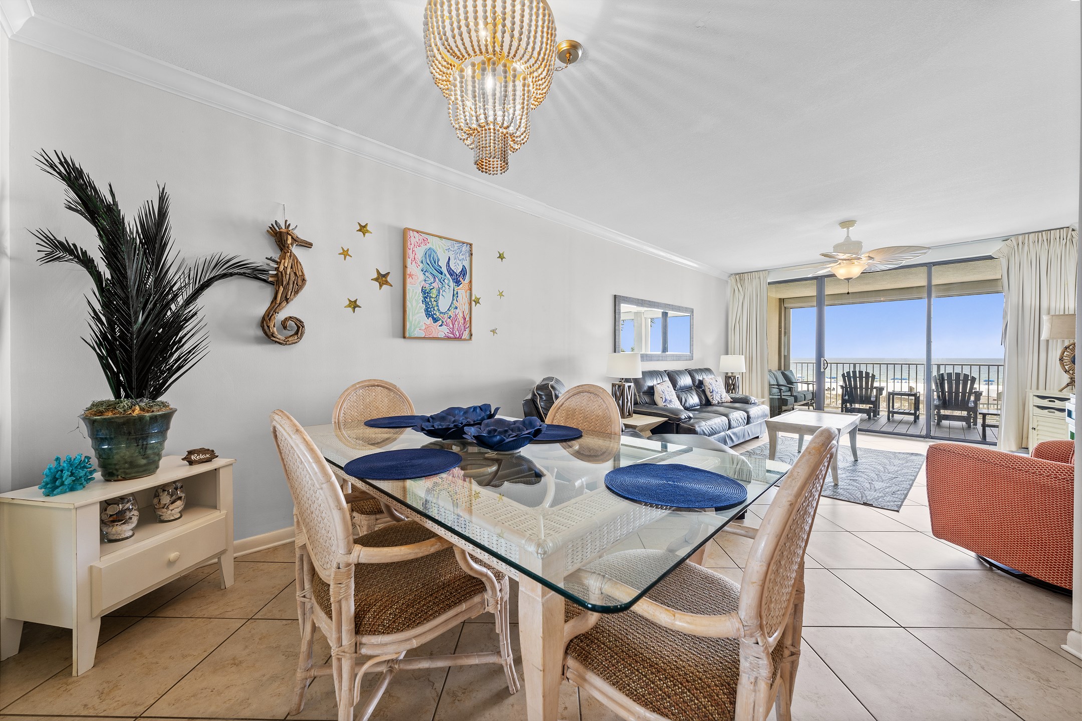 After a long day at the beach, retreat to the cozy living room, where a flat-screen TV awaits you. Whether you're catching up on your favorite shows or simply enjoying some downtime with loved ones, this space is designed for relaxation. White Caps 205 is the ideal getaway for families, couples, or groups of friends seeking a luxurious and tranquil beach vacation.