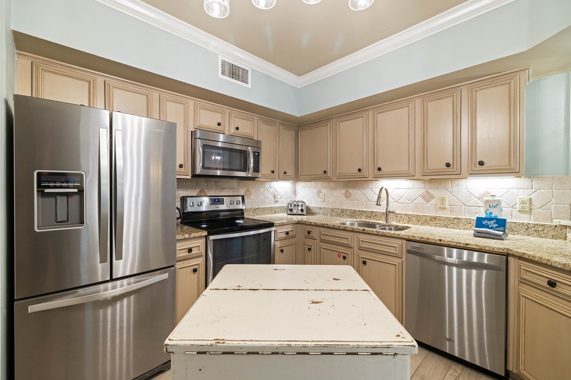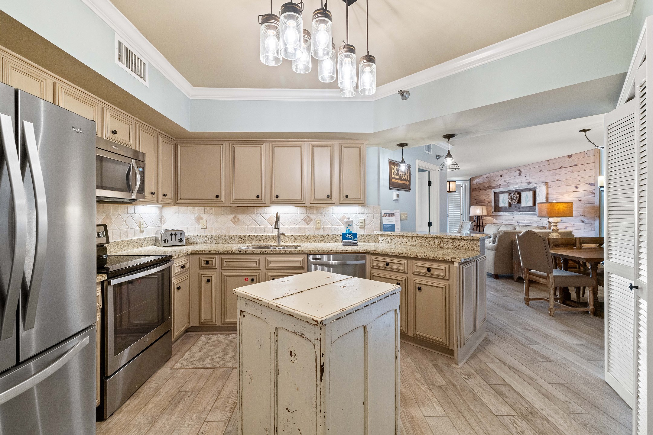 The fully equipped kitchen features stainless steel appliances, granite countertops, and a dining table, providing everything you need to enjoy meals together.