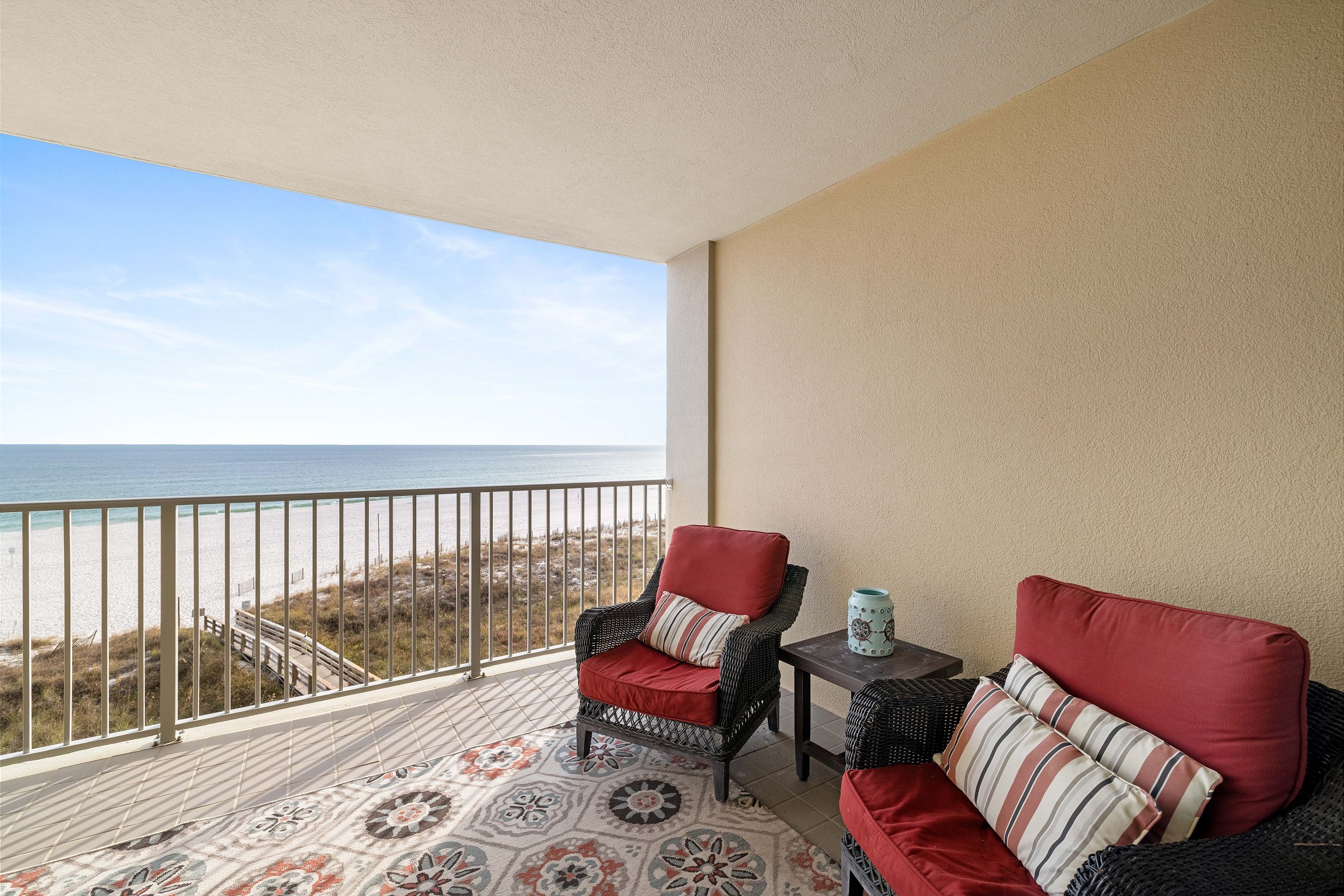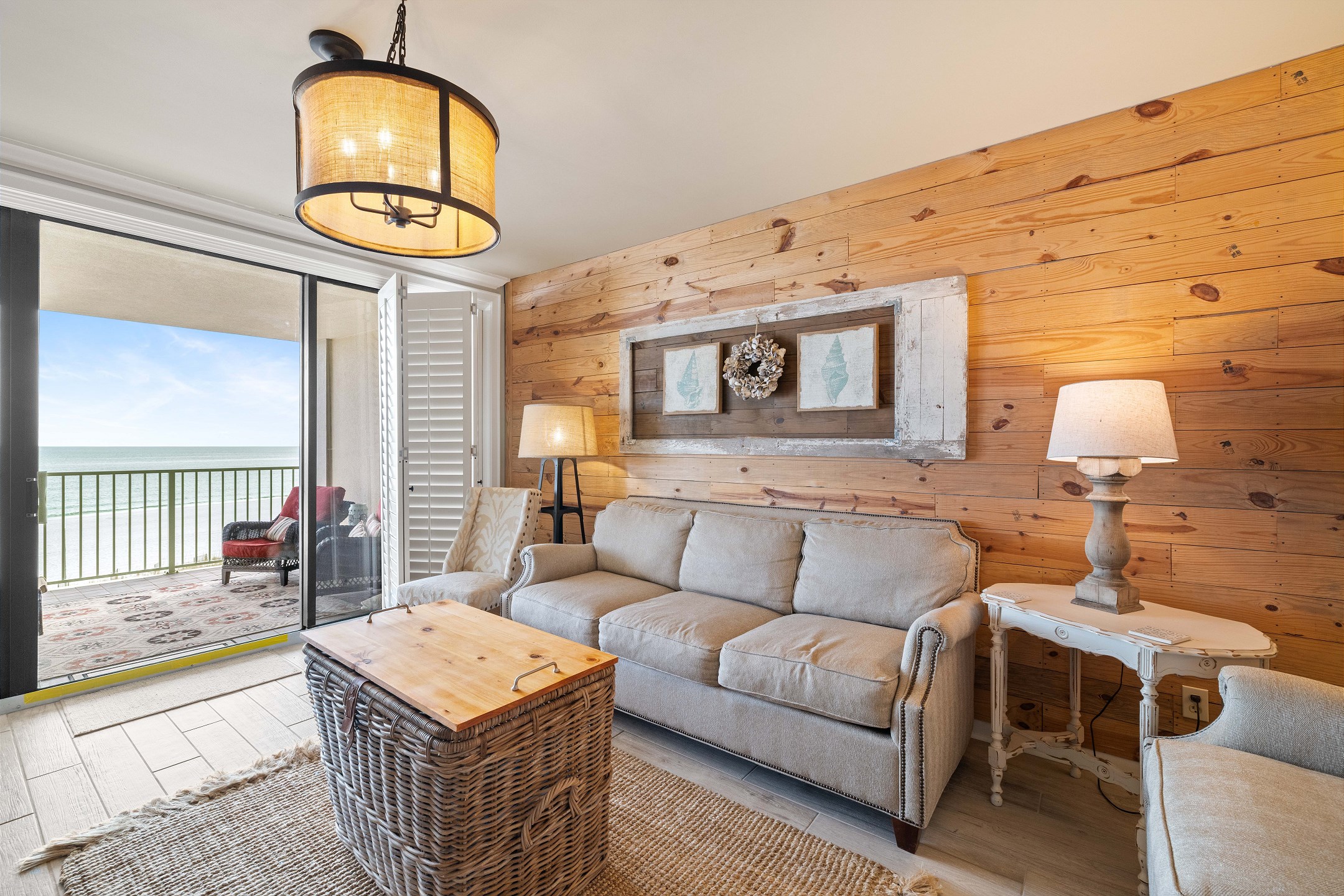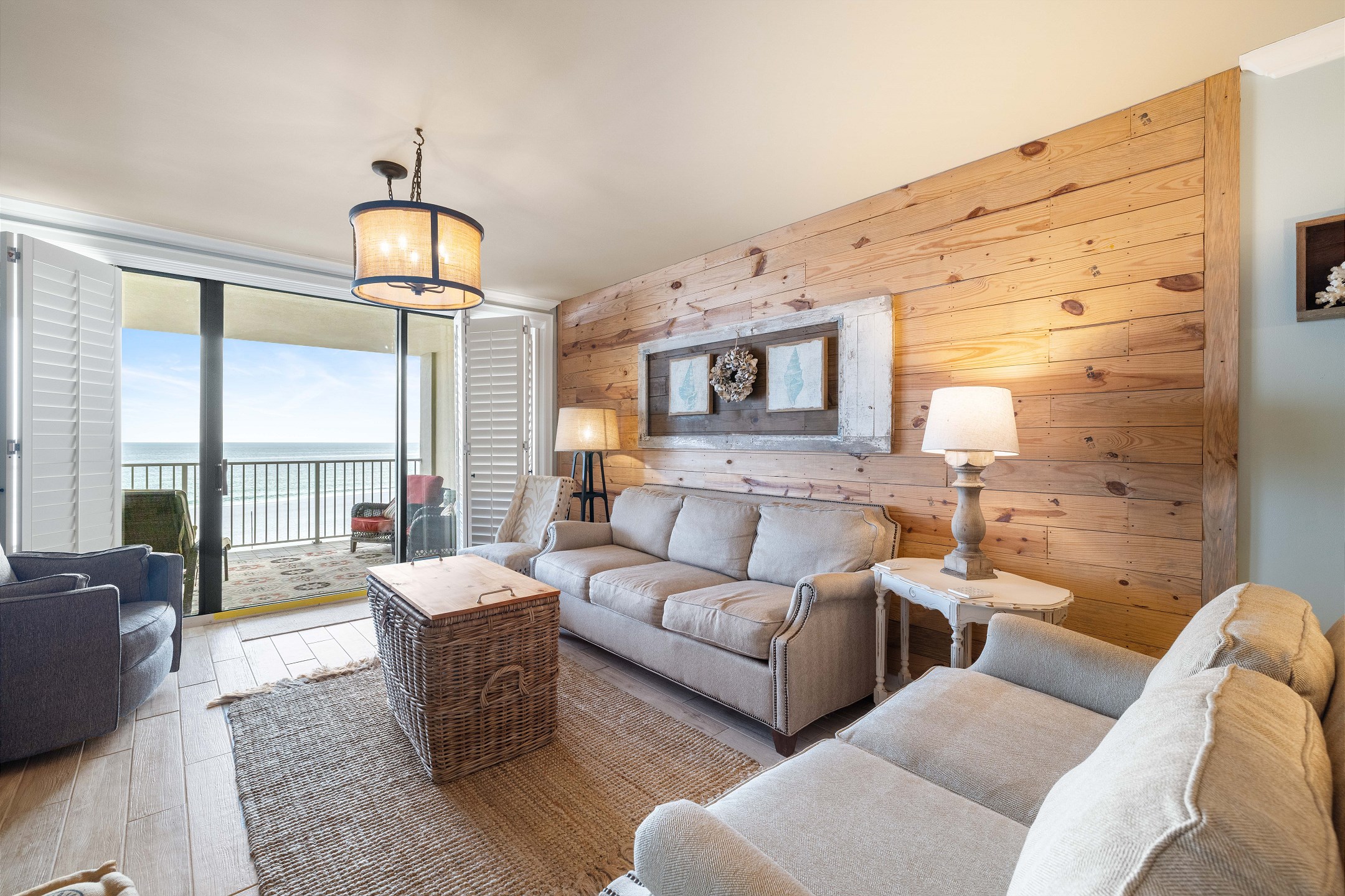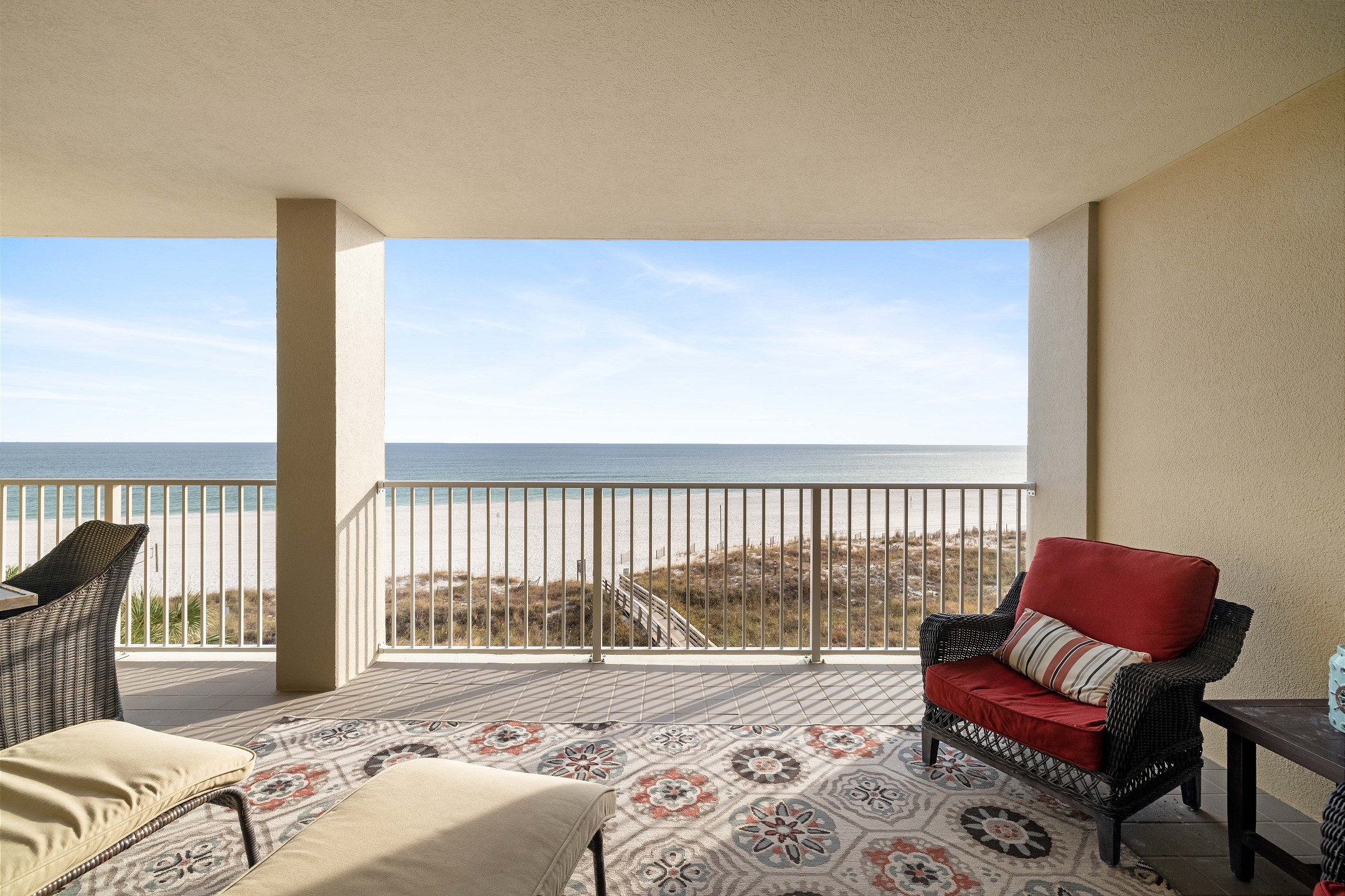 The spacious living room offers plenty of seating, a flat screen TV, and floor to ceiling windows that lead out to a private balcony overlooking the Gulf, perfect for taking in the stunning views and fresh sea breeze.