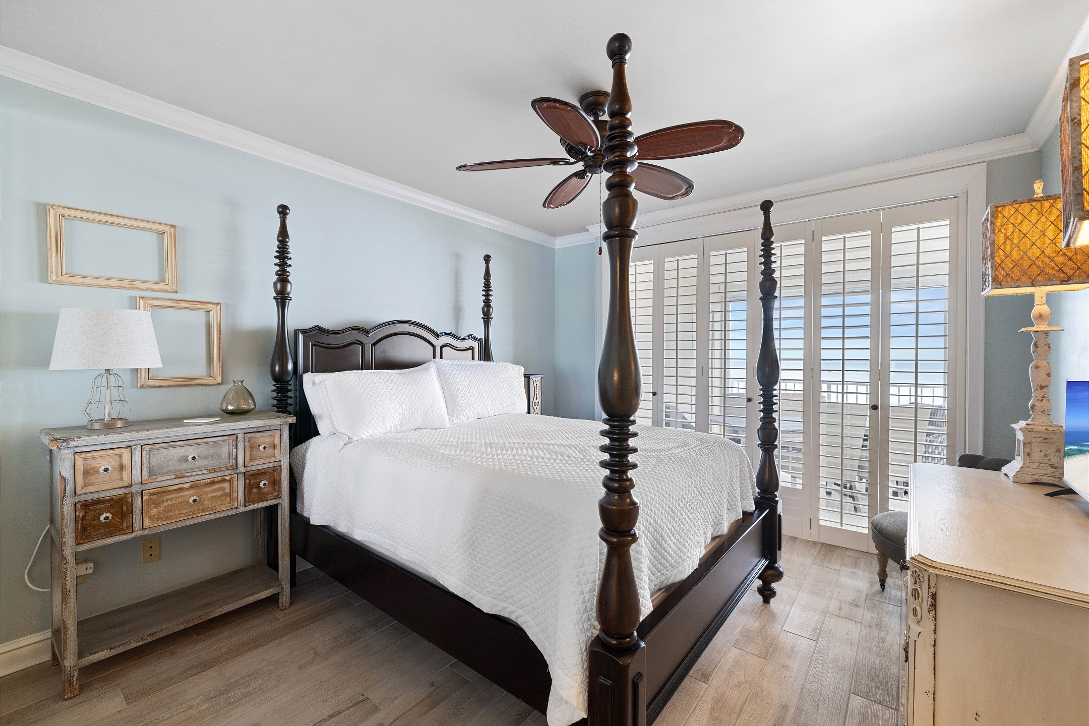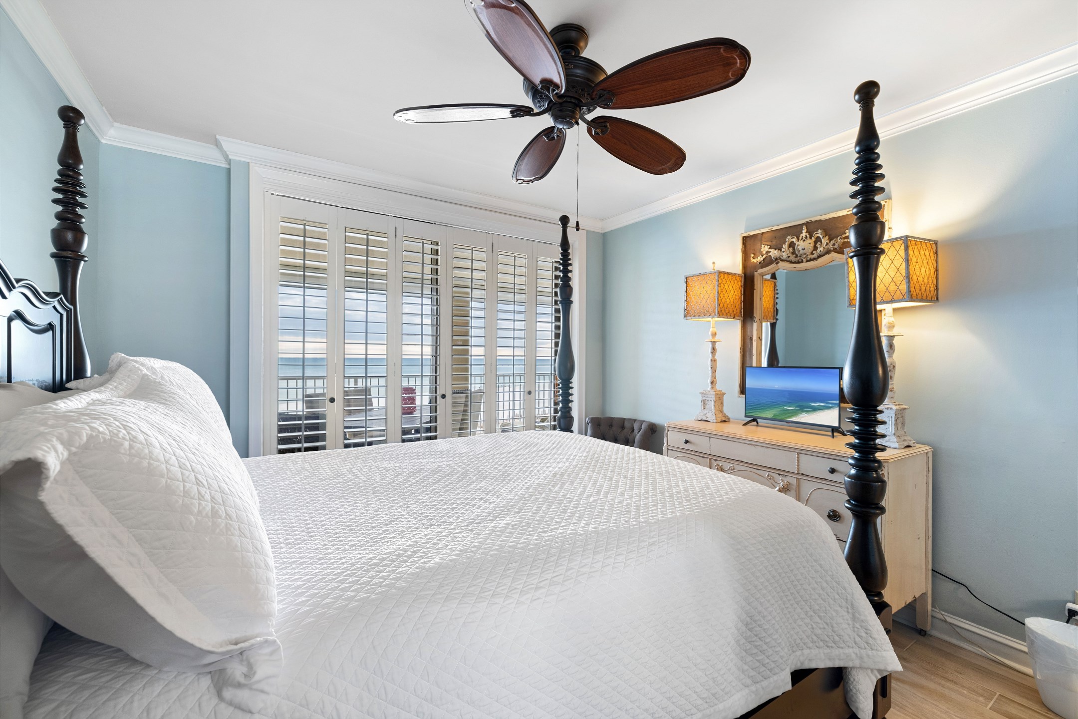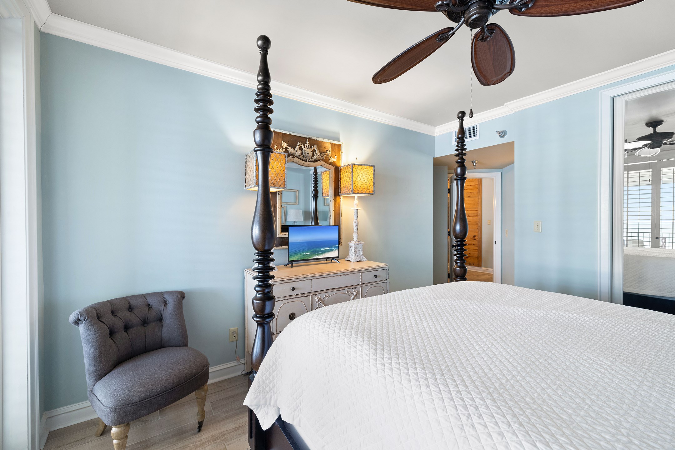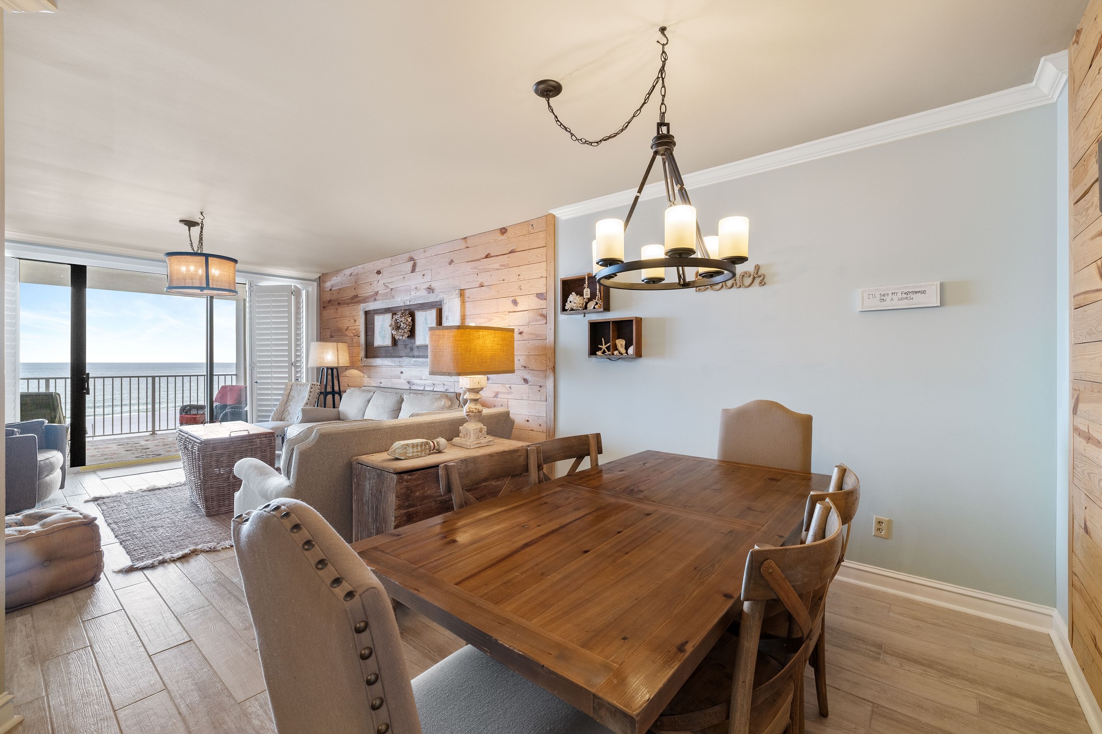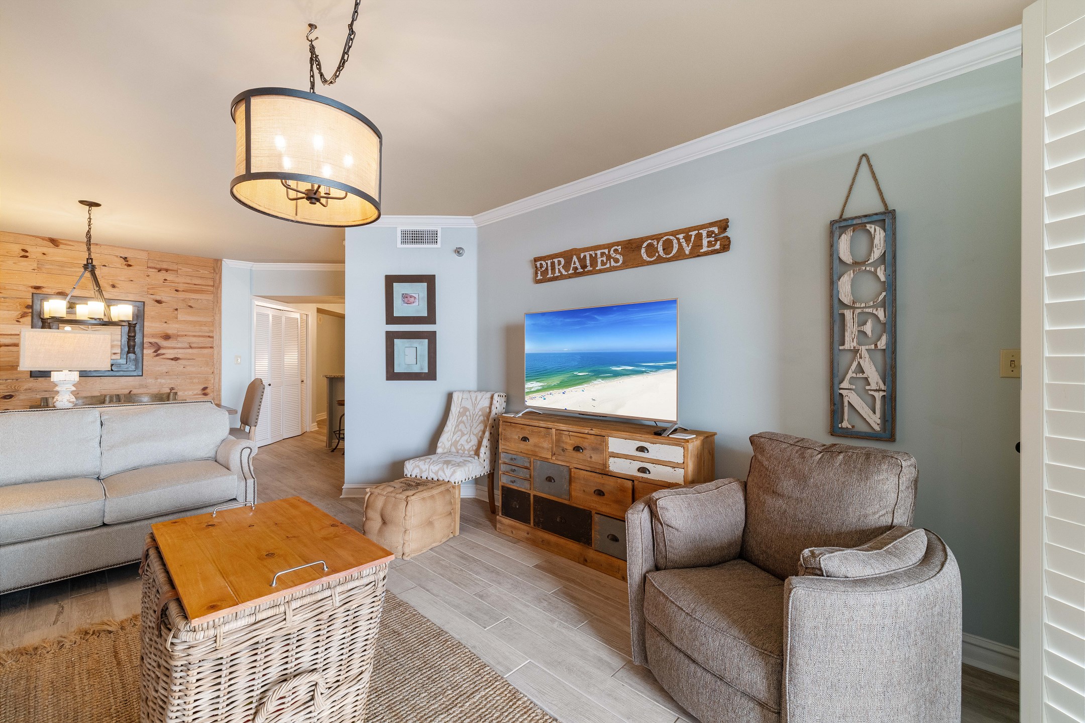 The spacious living room offers plenty of seating, a flat screen TV, and floor to ceiling windows that lead out to a private balcony overlooking the Gulf, perfect for taking in the stunning views and fresh sea breeze.