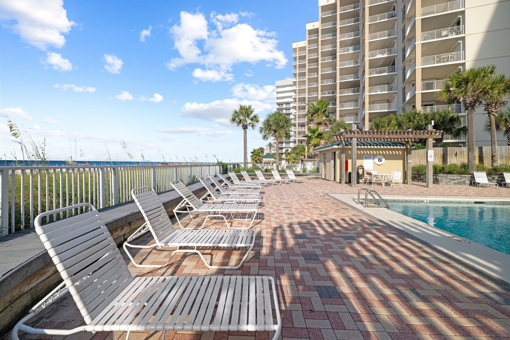 The Primary suite is a serene oasis, featuring a King bed, private bath, flat-screen Smart TV, and convenient balcony access for tranquil moments overlooking the Gulf. In the second bedroom, you'll find another luxurious King bed, while the third bedroom offers two Queen-sized beds, providing ample sleeping arrangements for up to 10 guests. Each guest room is thoughtfully equipped with a flat-screen Smart TV for added entertainment.