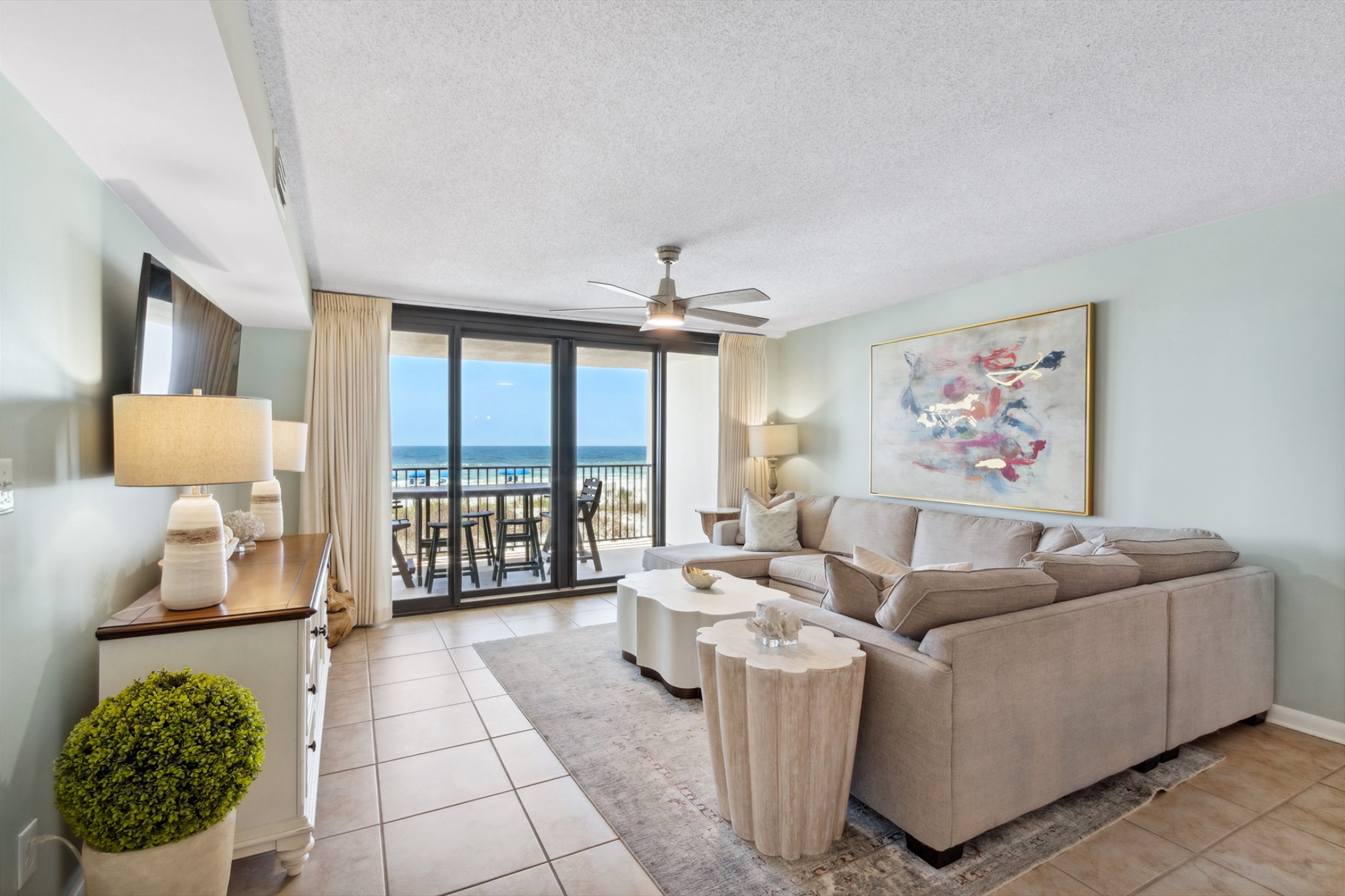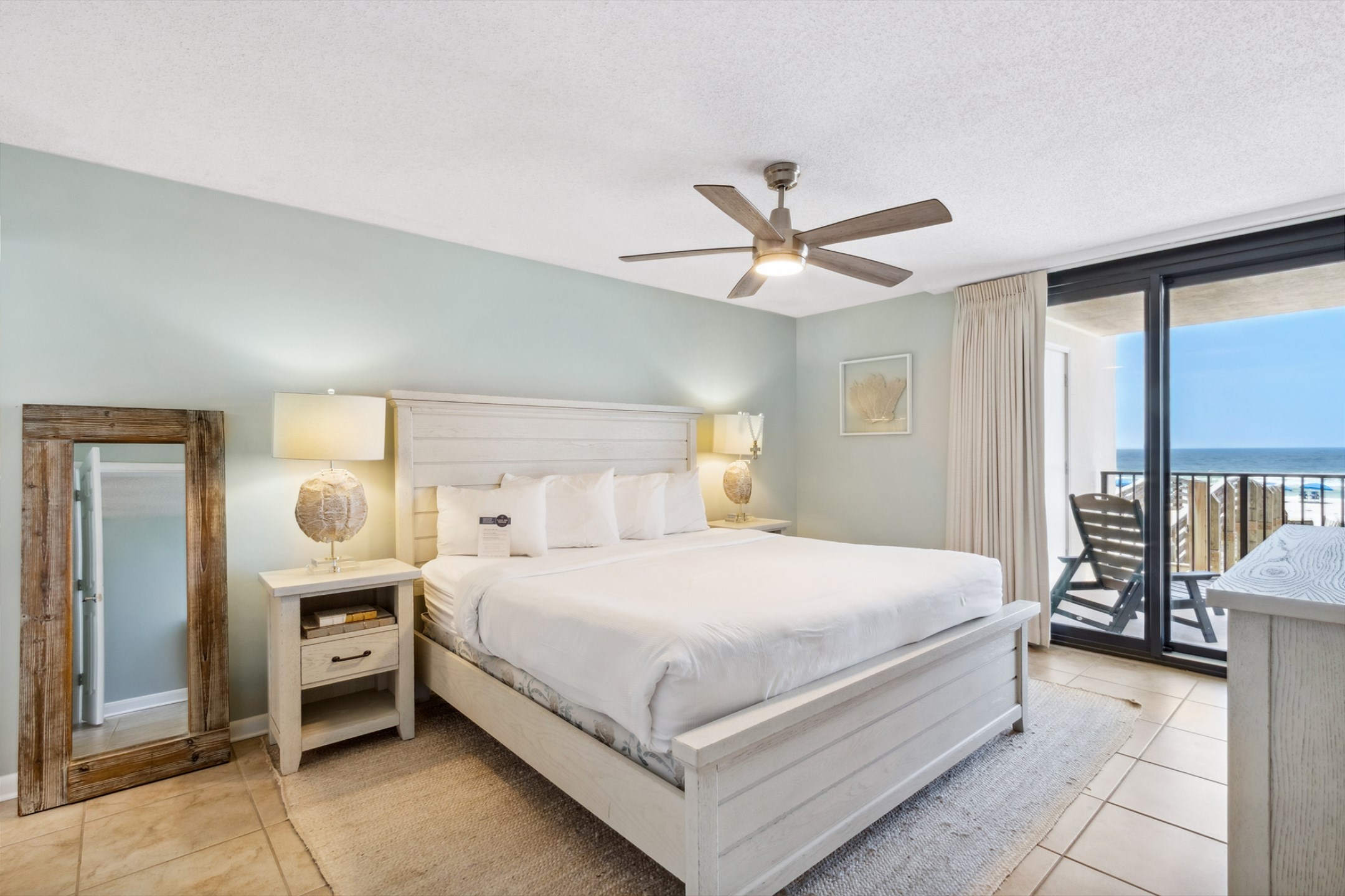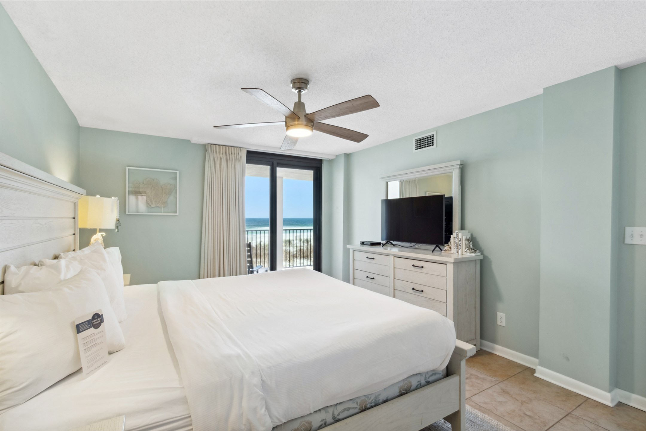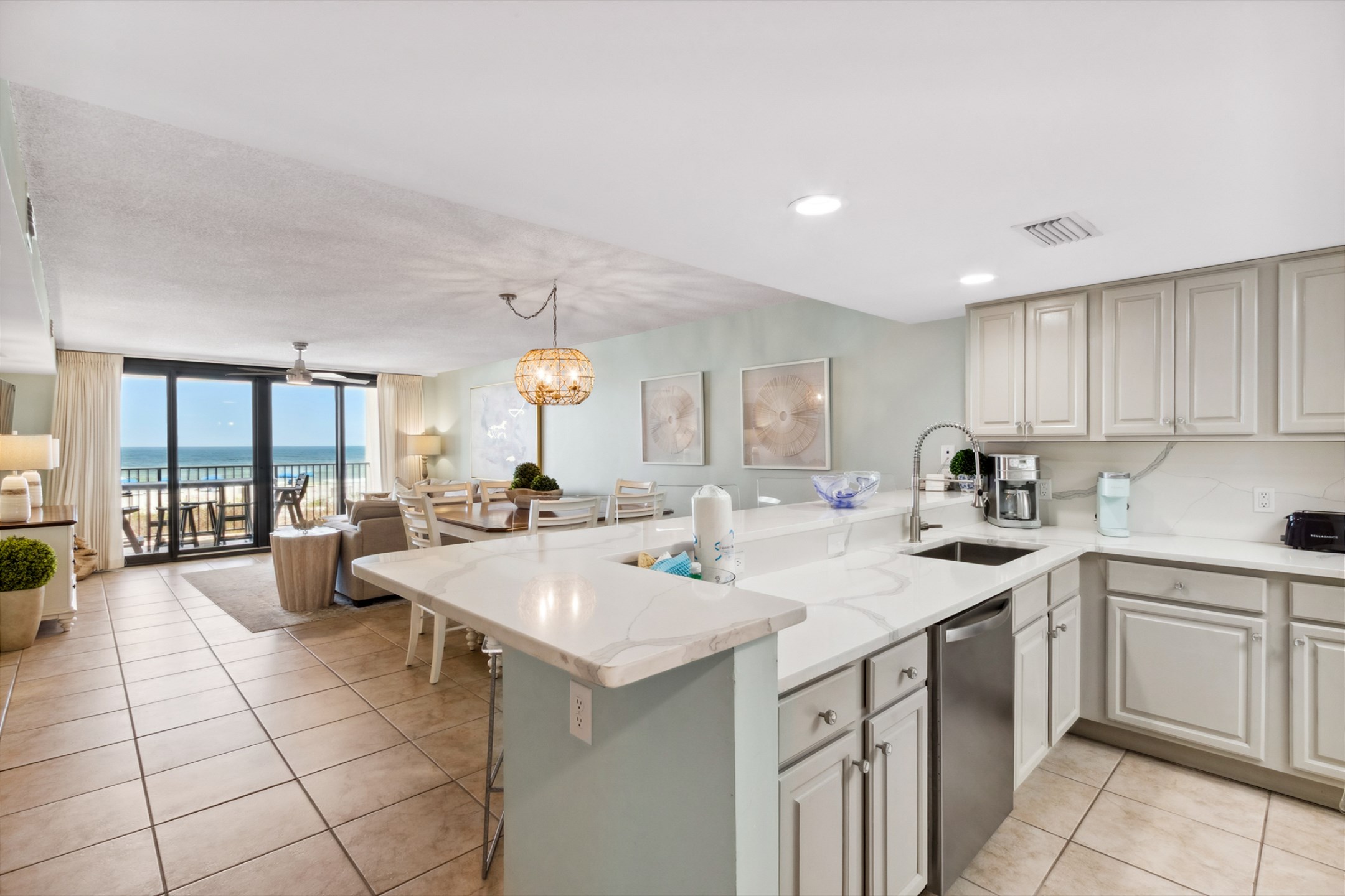 Located on the 1st floor of the West Tower, this condo's living room features a spacious sectional sofa and floor-to-ceiling windows that open to a large private balcony with stunning Gulf views. The fully equipped kitchen includes stainless steel appliances, a dining table, and a wet bar—perfect for entertaining.