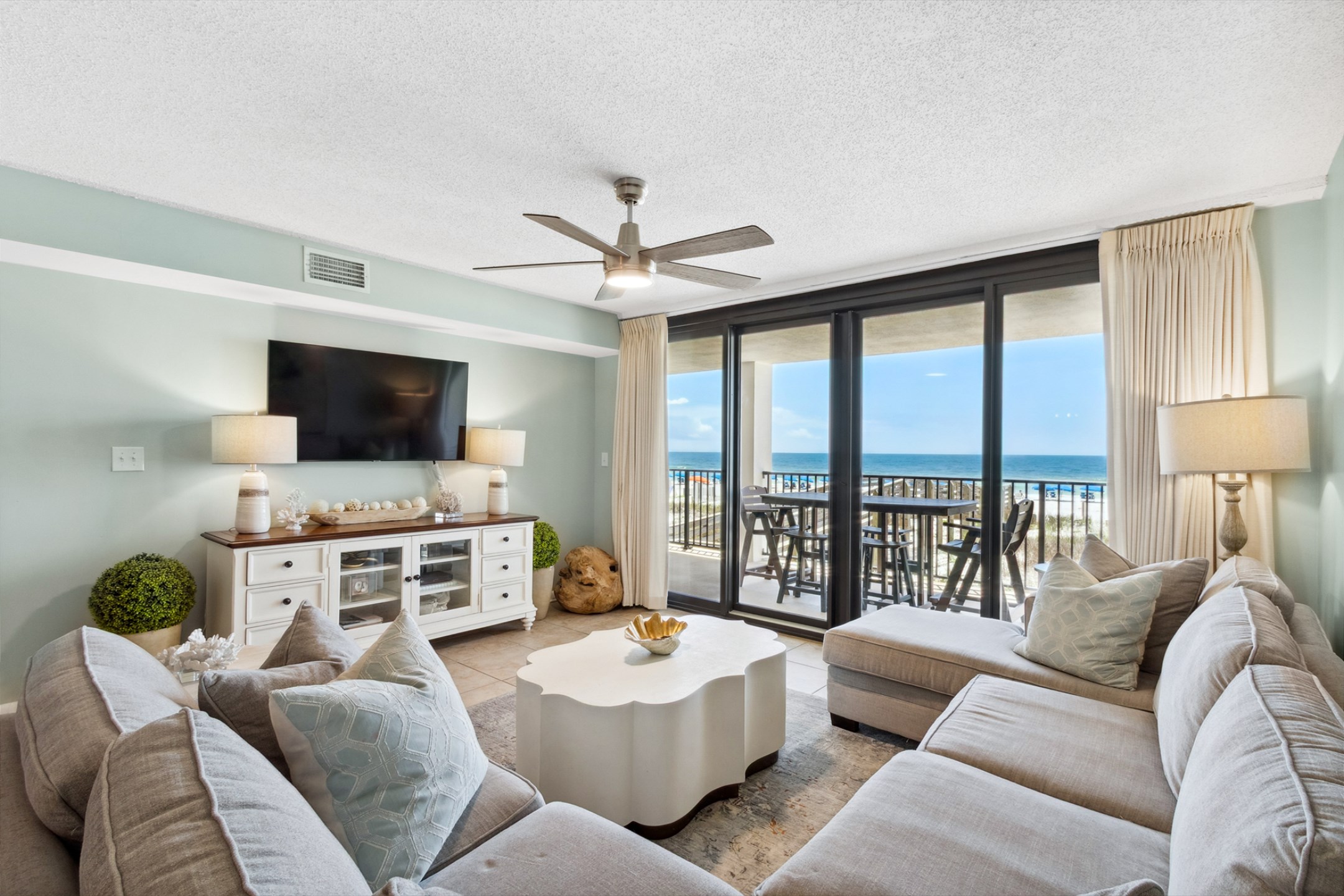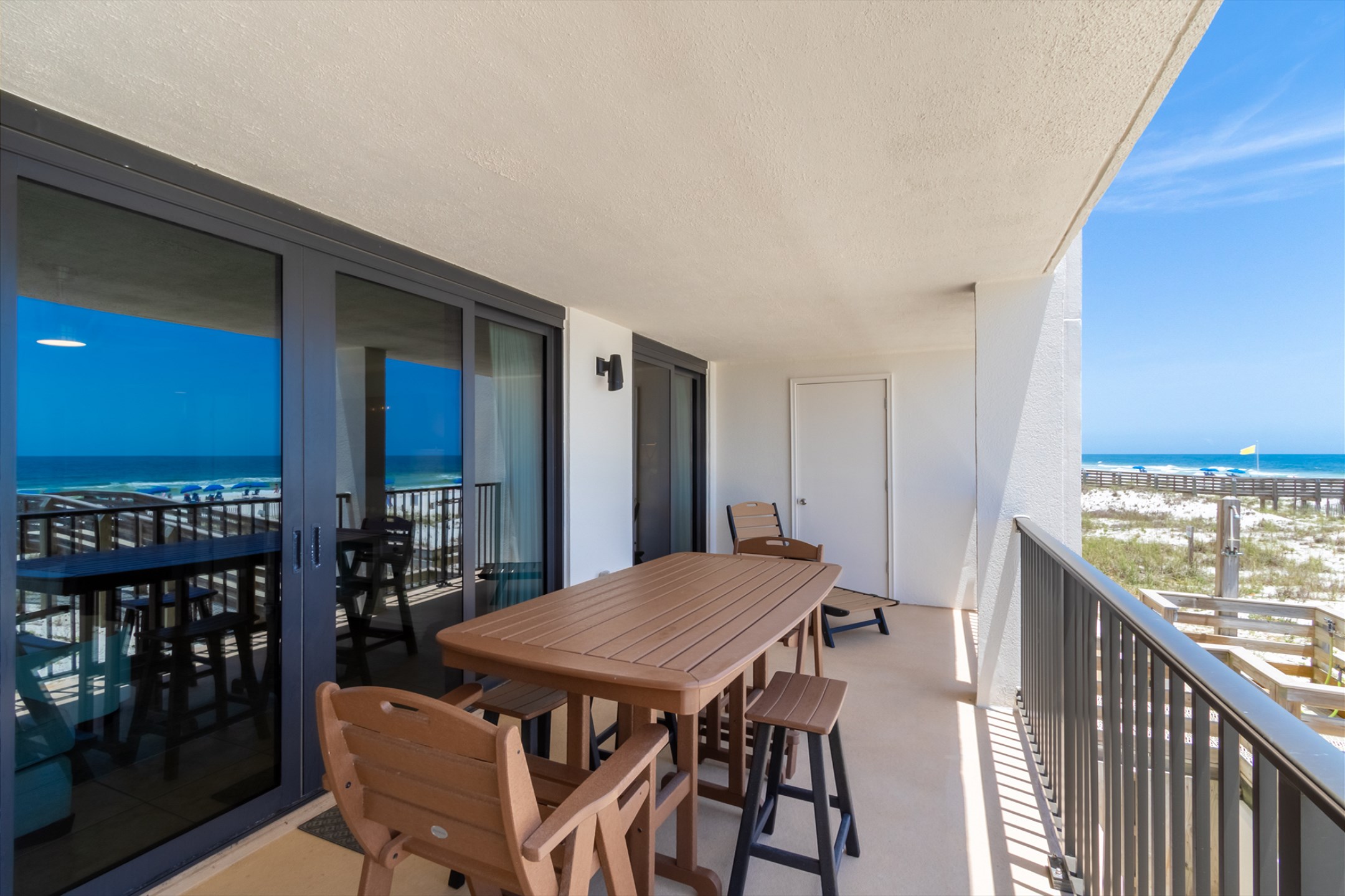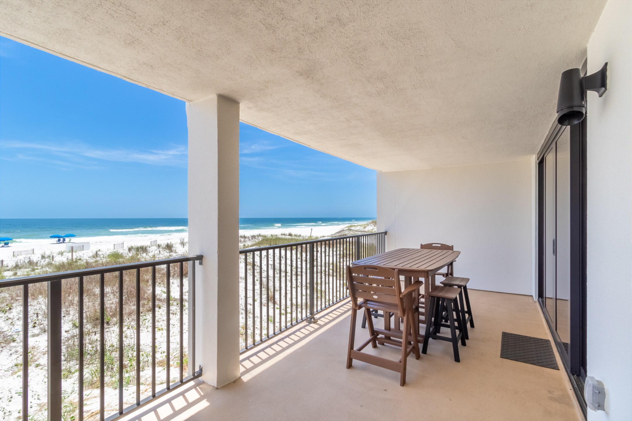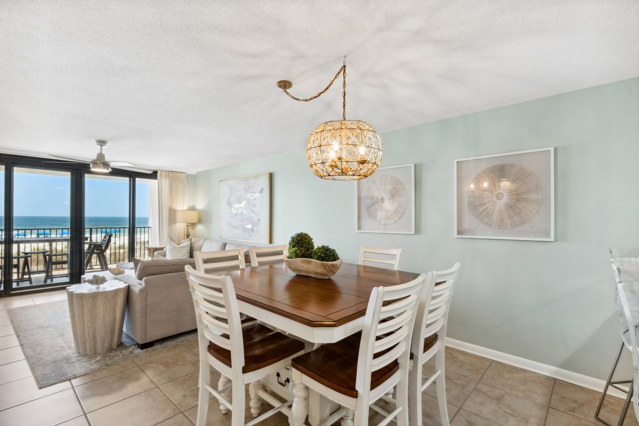 Located on the 1st floor of the West Tower, this condo's living room features a spacious sectional sofa and floor-to-ceiling windows that open to a large private balcony with stunning Gulf views. The fully equipped kitchen includes stainless steel appliances, a dining table, and a wet bar—perfect for entertaining.