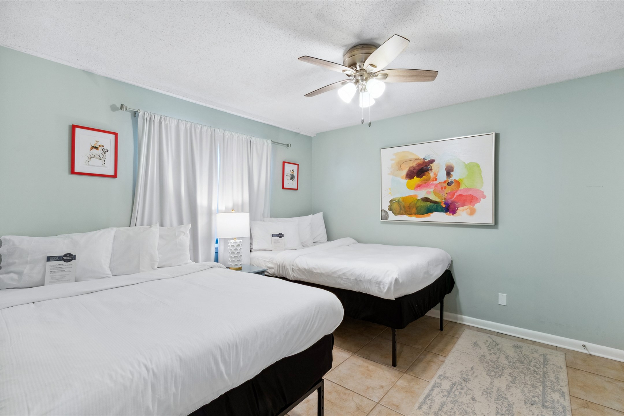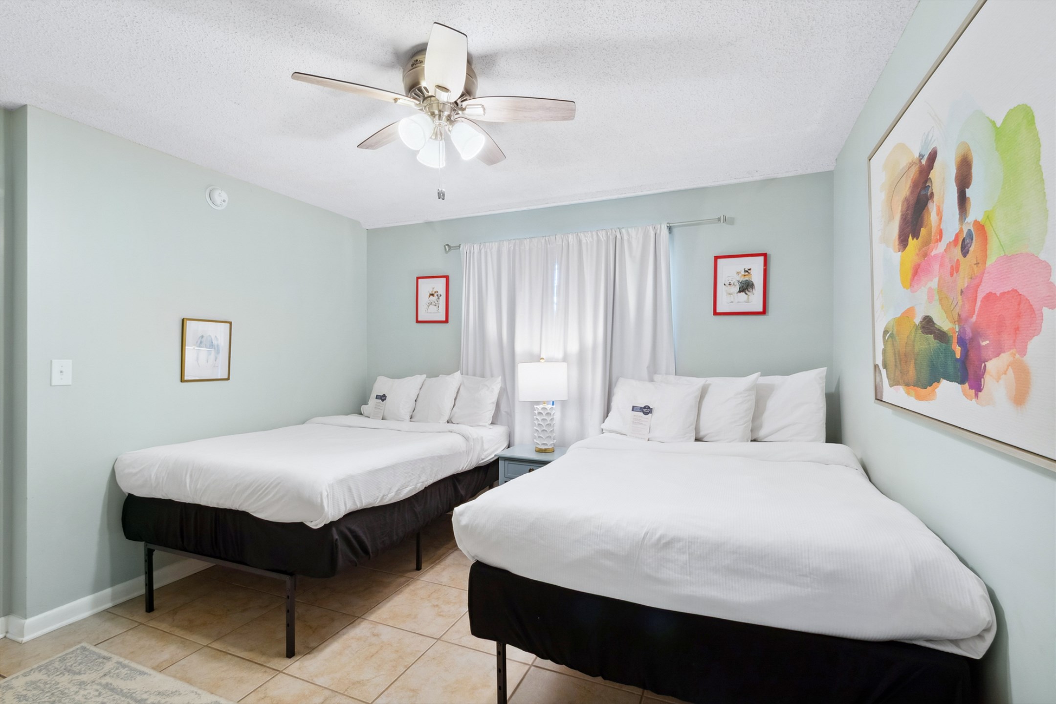 The primary bedroom offers a king bed, private balcony access, and an ensuite bathroom for a relaxing retreat. The second bedroom features two full beds and its own ensuite bathroom, providing comfort and privacy for guests.