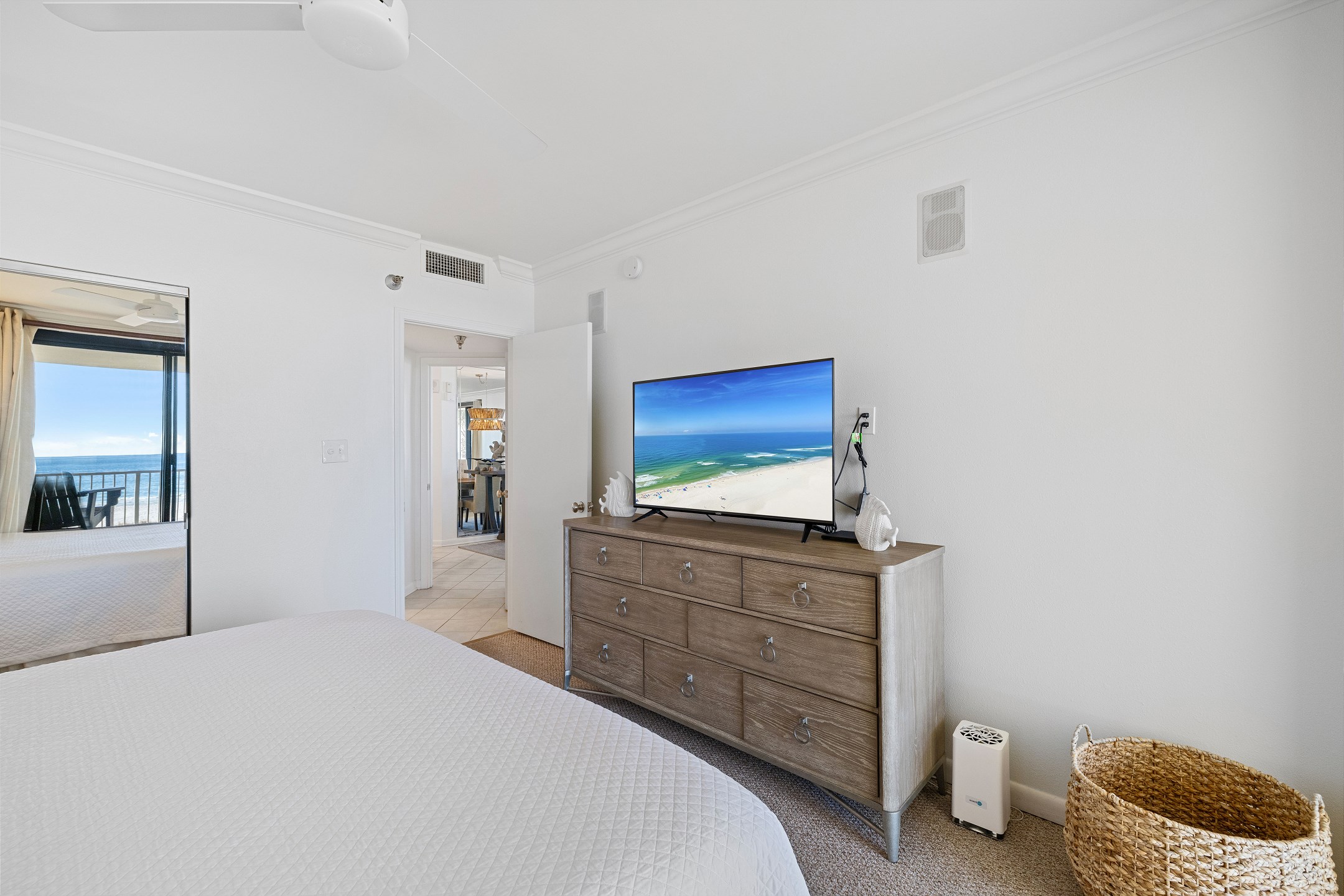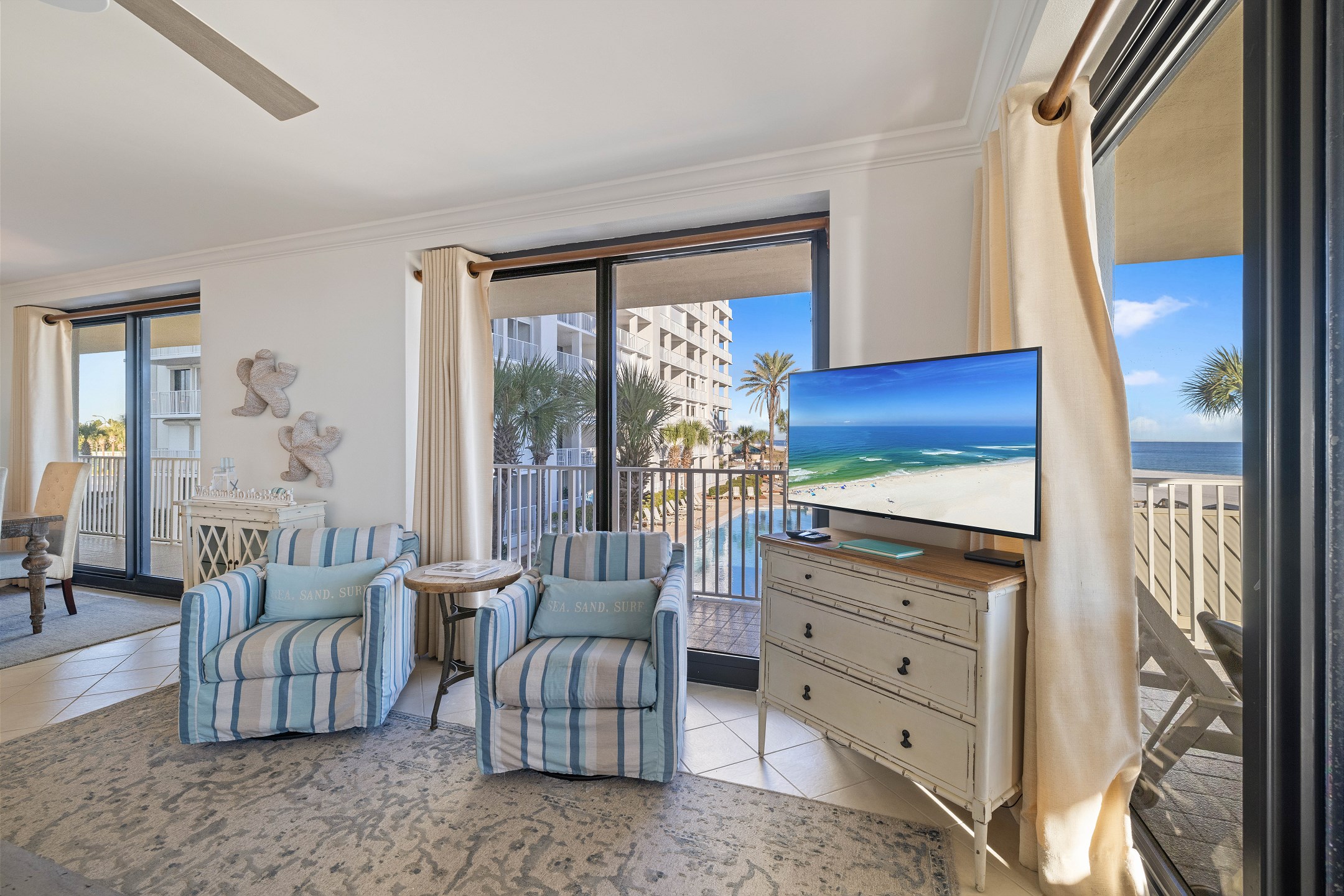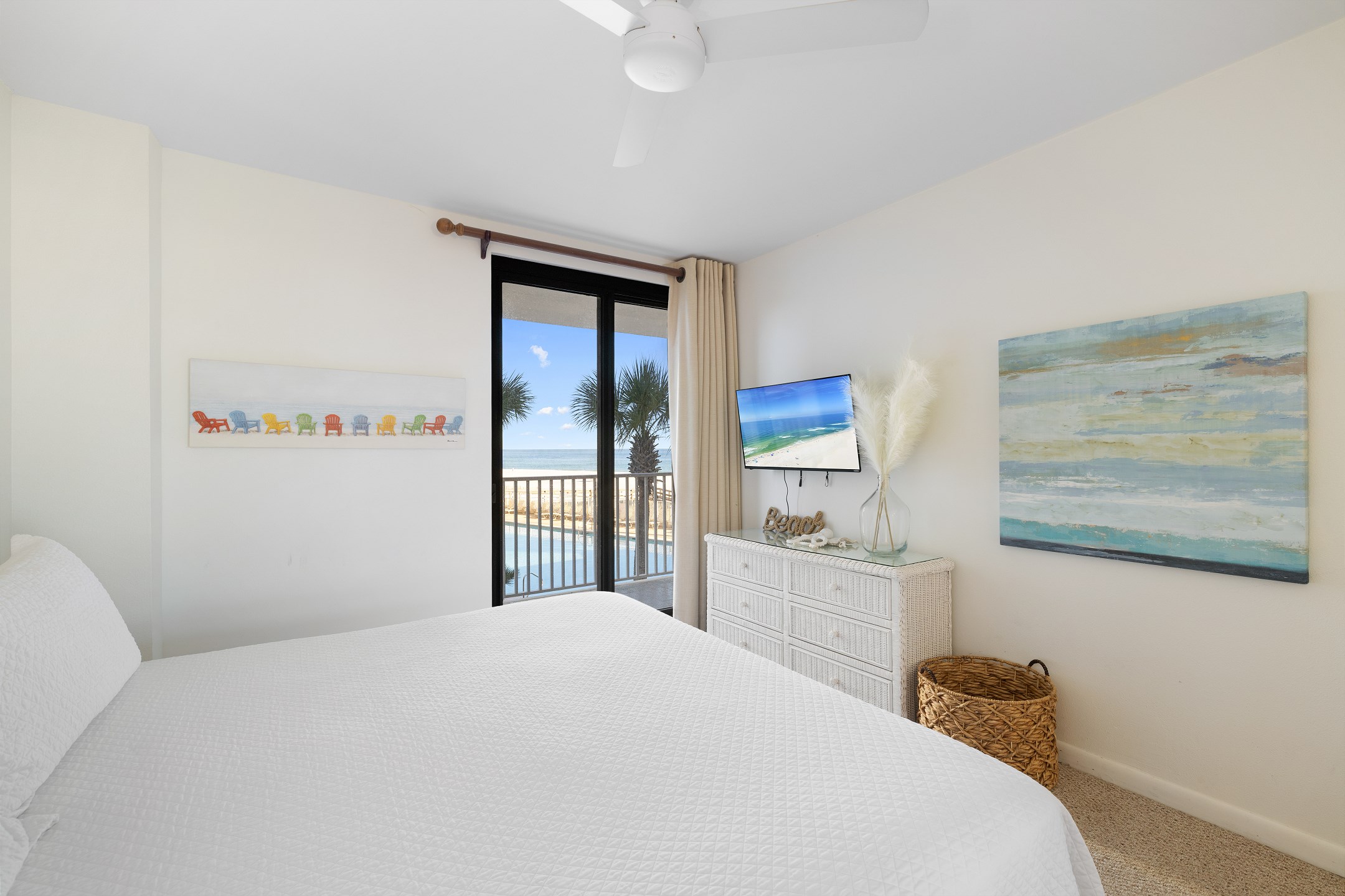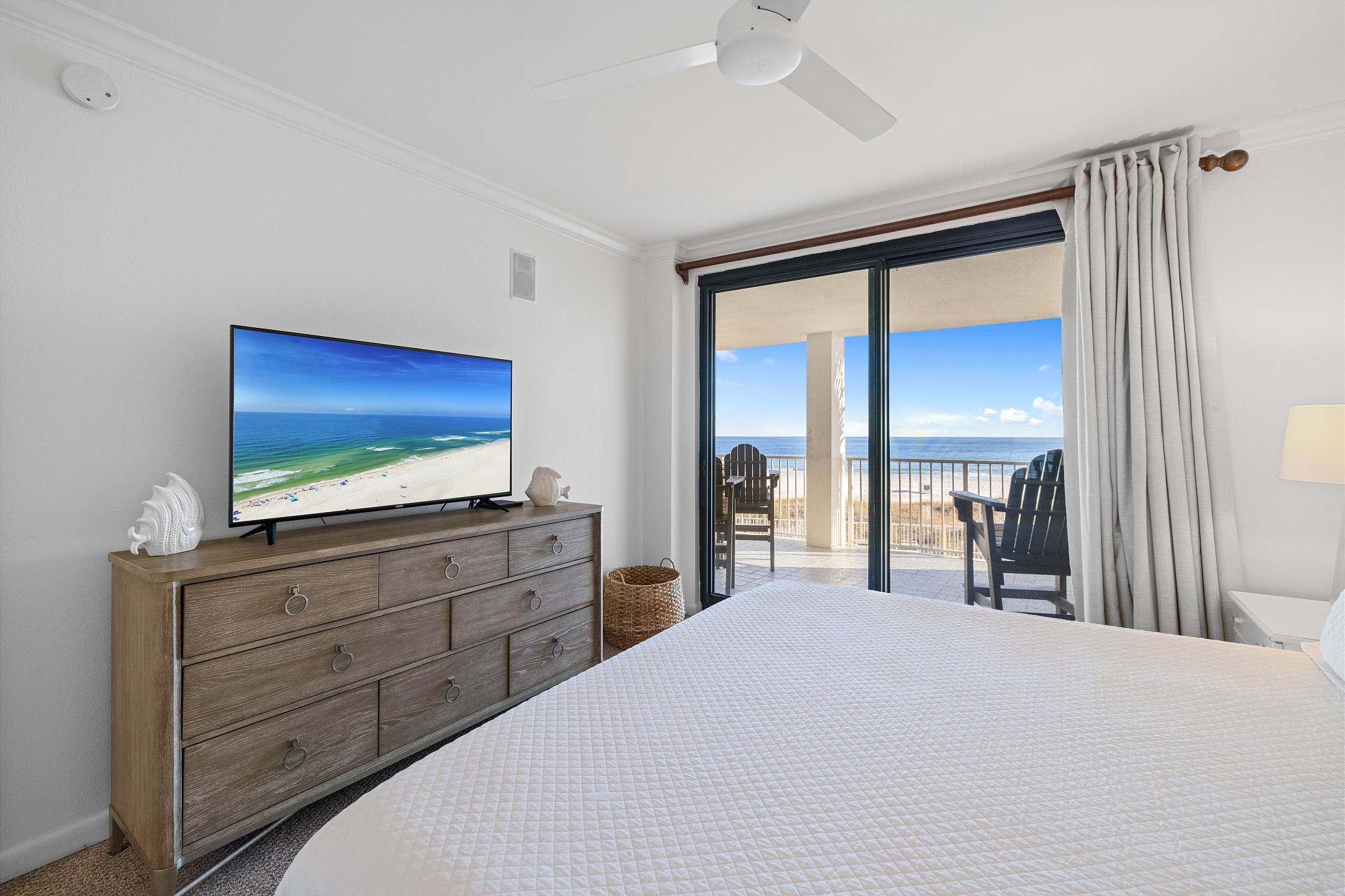 The second bedroom offers another King bed, providing ample space and comfort for guests. The third bedroom features a cozy Queen bed and a 40-inch flat-screen TV, perfect for unwinding after a day at the beach. Private access to the large wrap-around balcony is available from every bedroom and the living area, offering stunning views of the Gulf to the East.