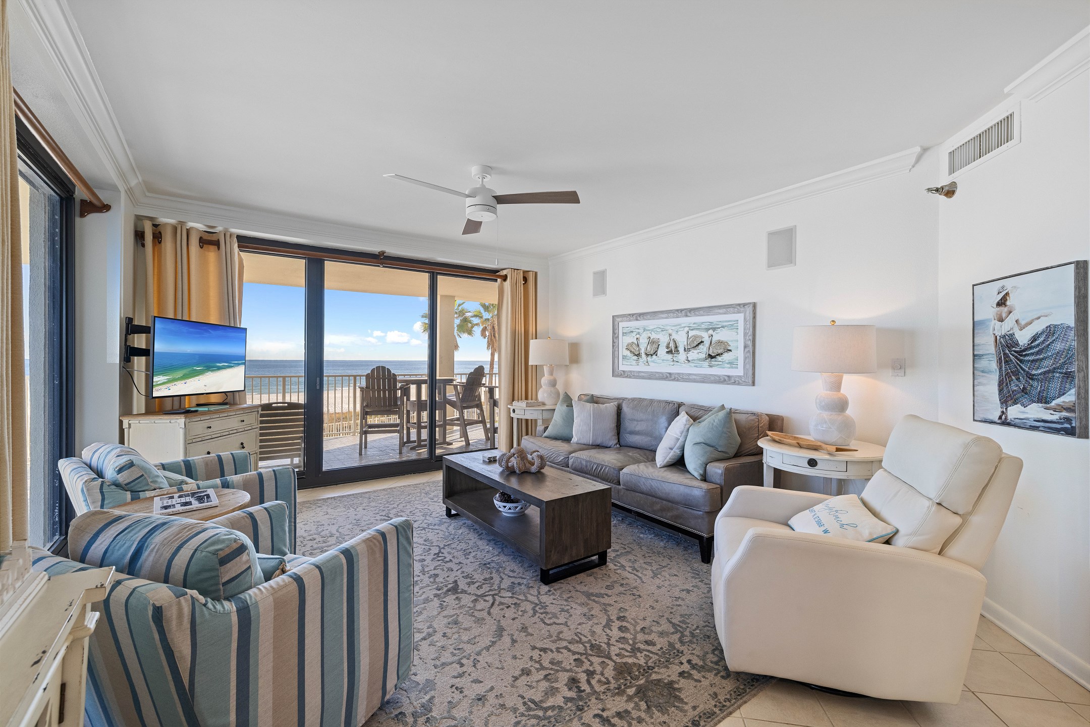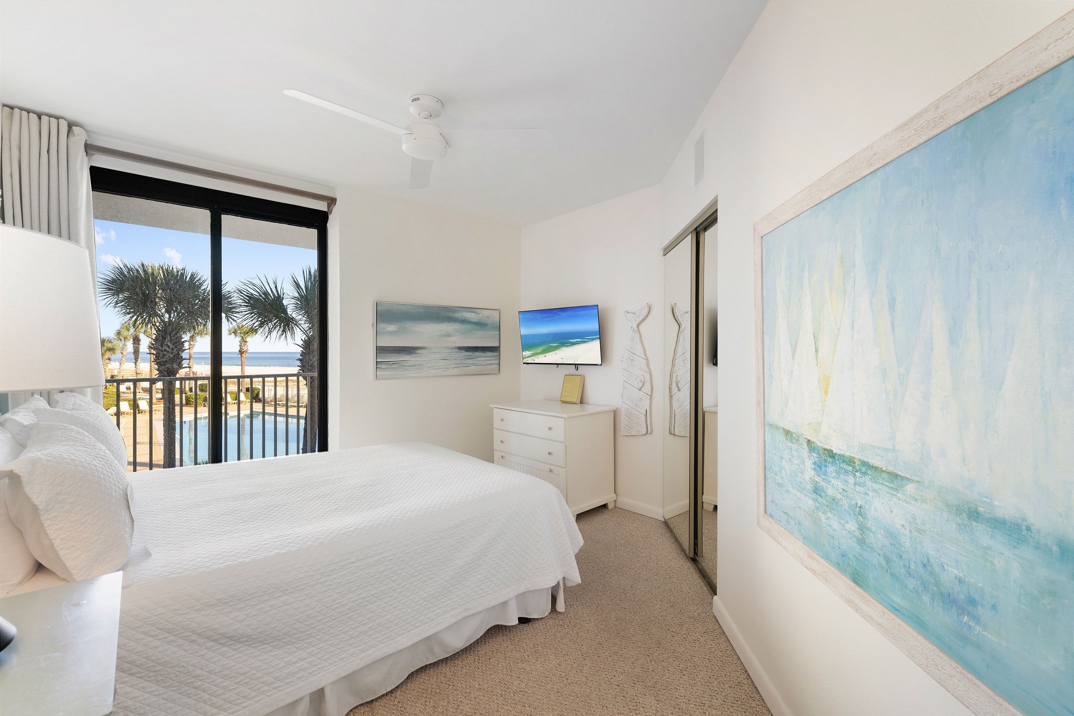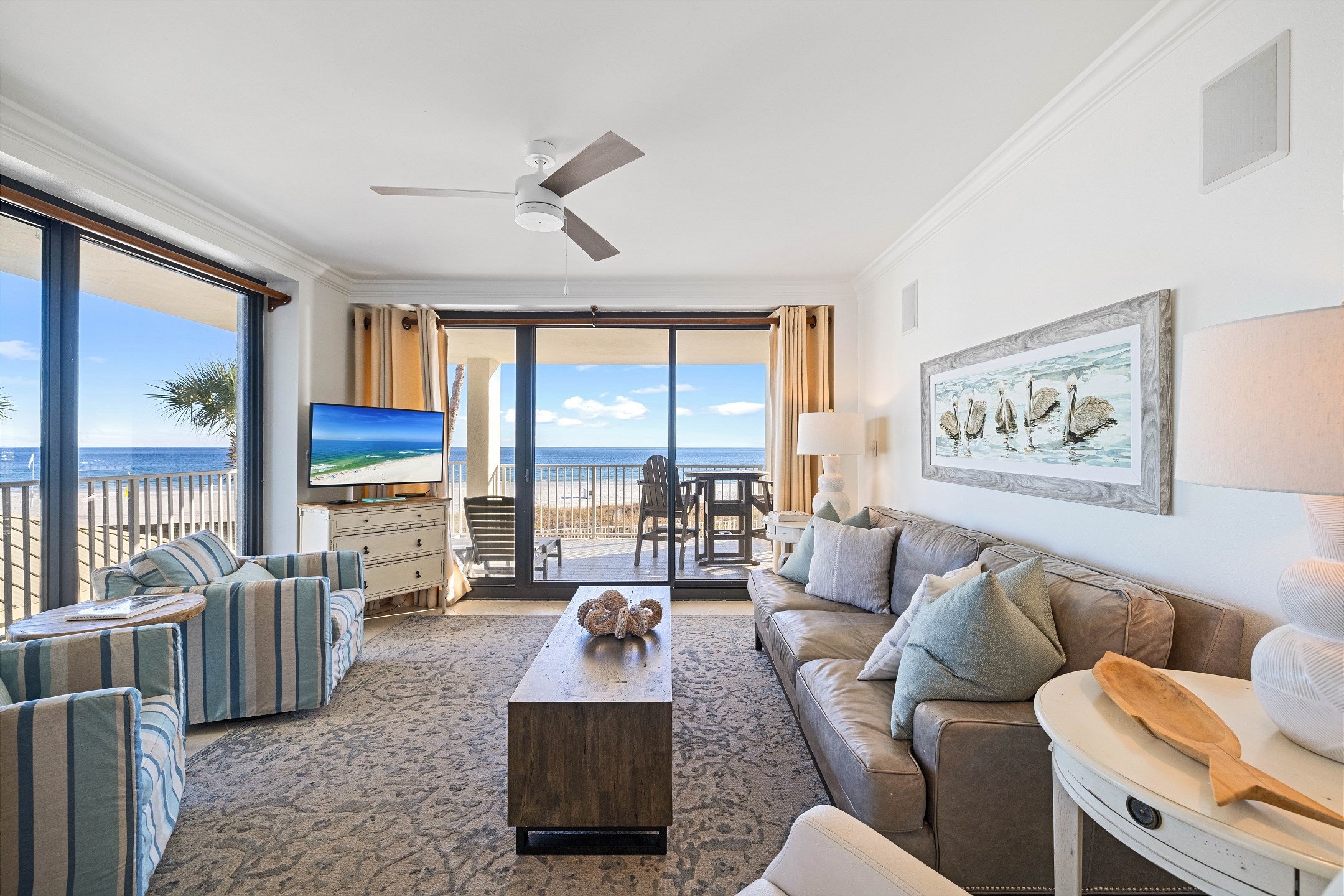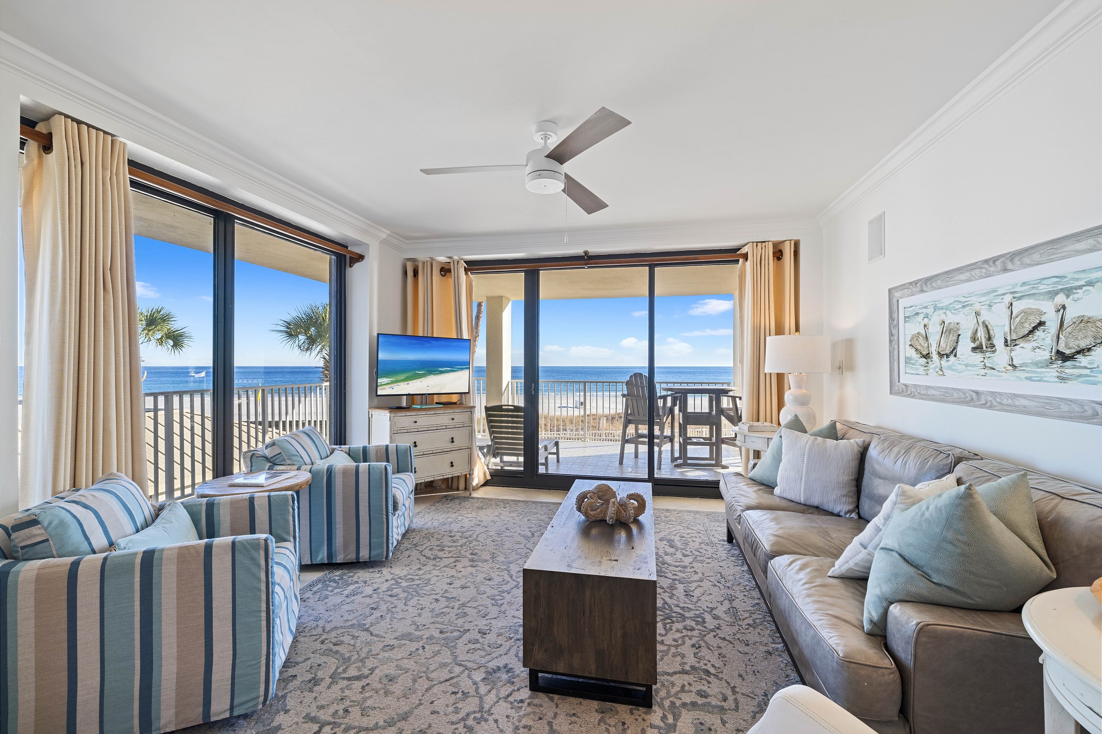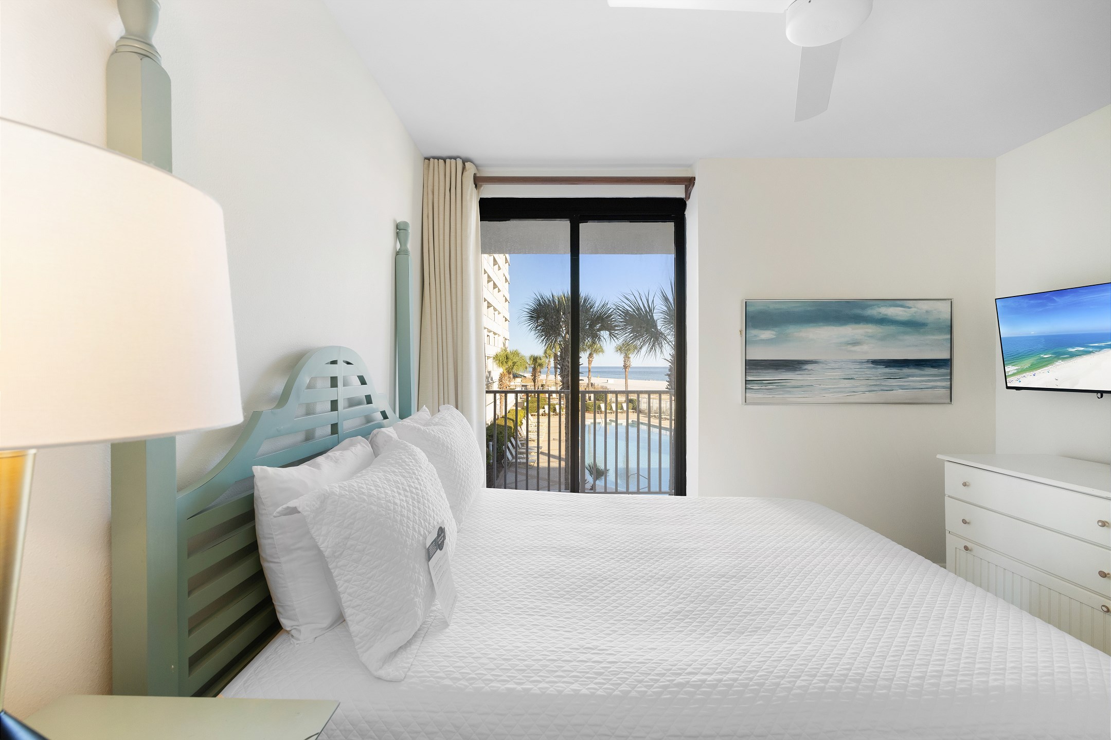 The second bedroom offers another King bed, providing ample space and comfort for guests. The third bedroom features a cozy Queen bed and a 40-inch flat-screen TV, perfect for unwinding after a day at the beach. Private access to the large wrap-around balcony is available from every bedroom and the living area, offering stunning views of the Gulf to the East.