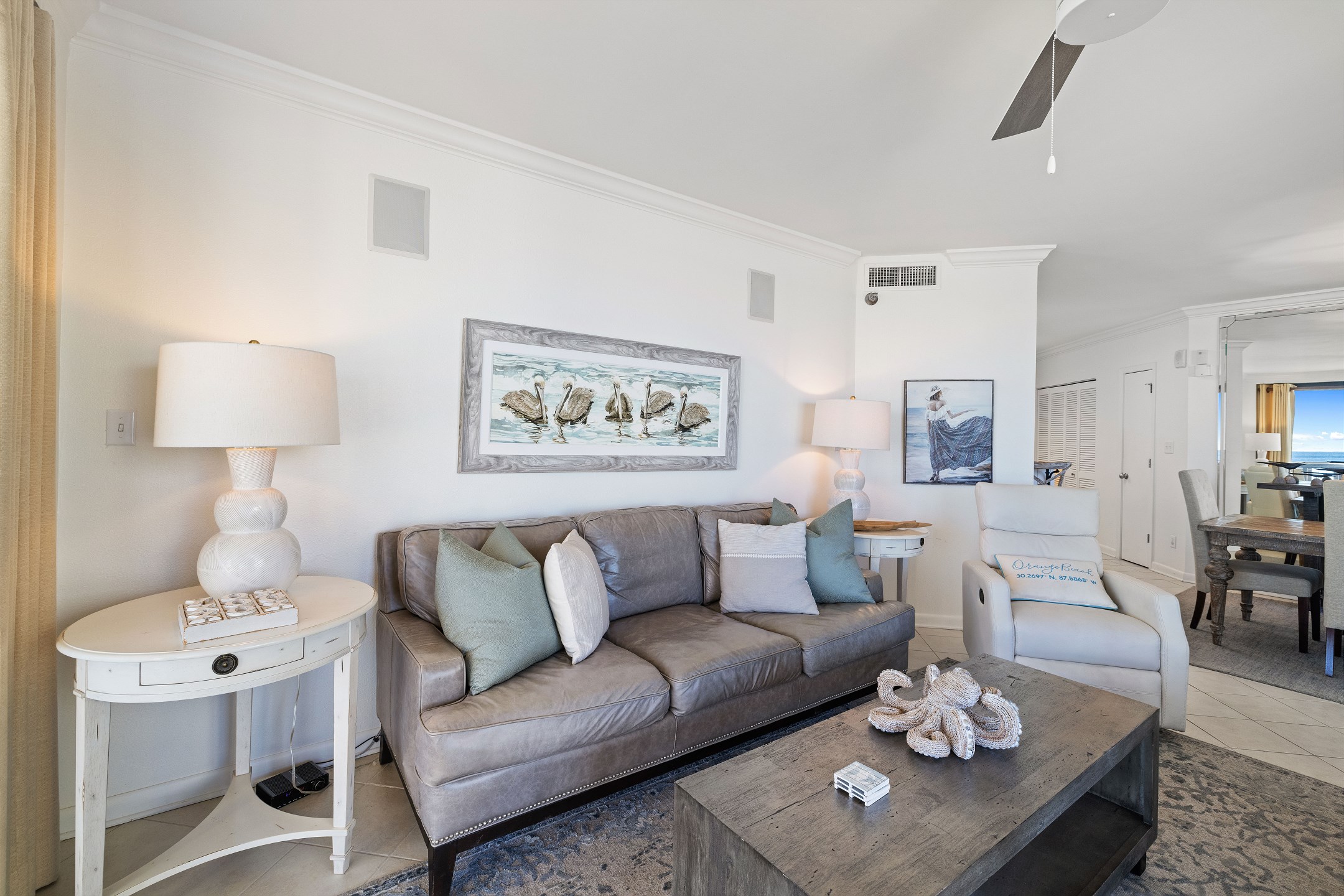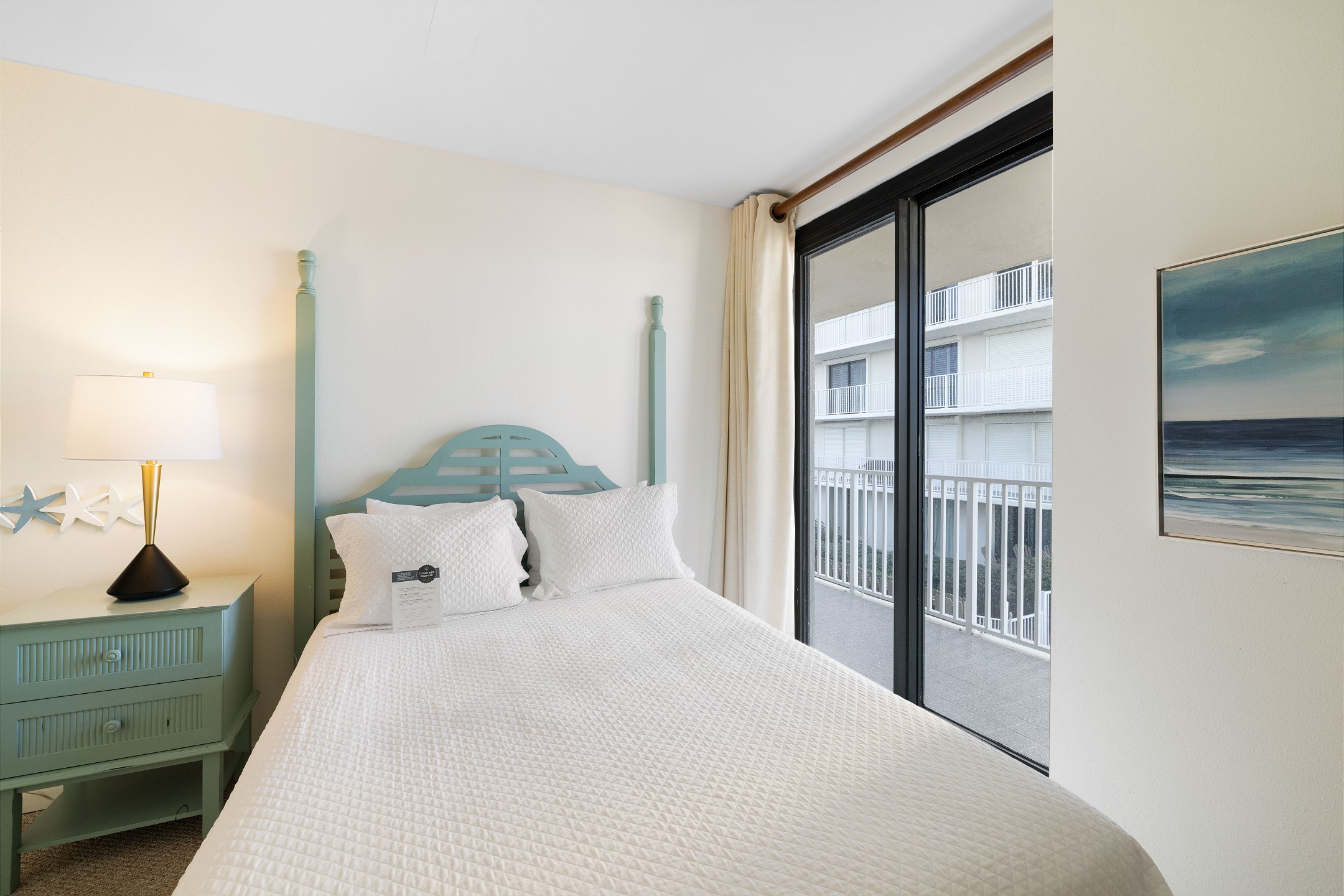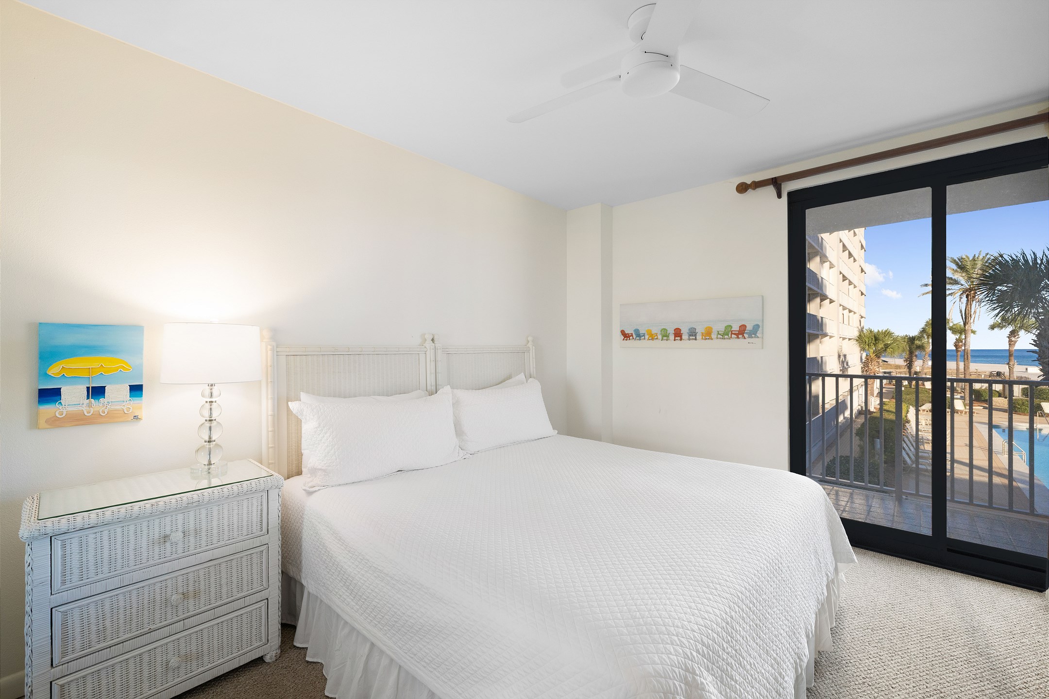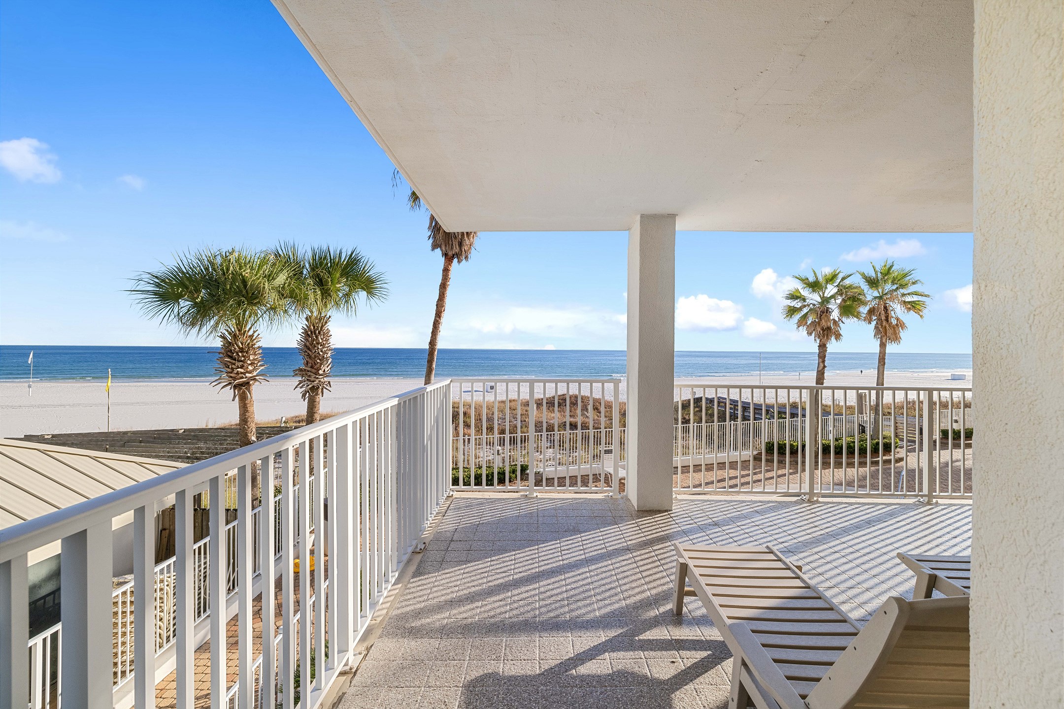 The second bedroom offers another King bed, providing ample space and comfort for guests. The third bedroom features a cozy Queen bed and a 40-inch flat-screen TV, perfect for unwinding after a day at the beach. Private access to the large wrap-around balcony is available from every bedroom and the living area, offering stunning views of the Gulf to the East.