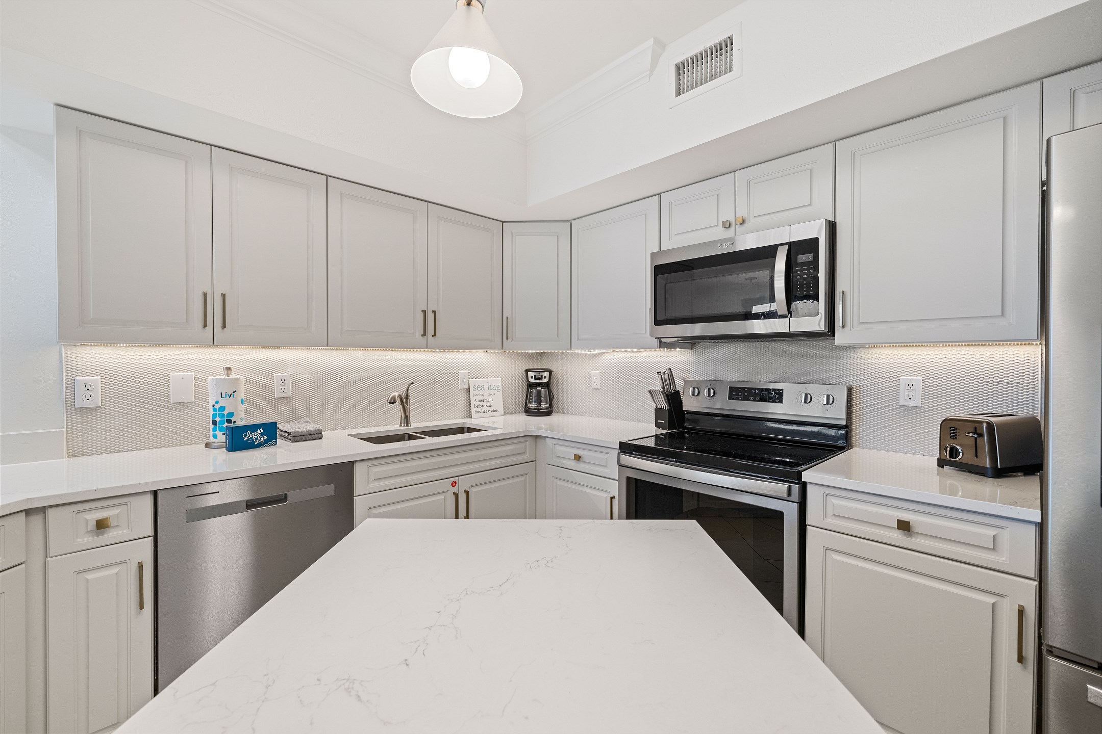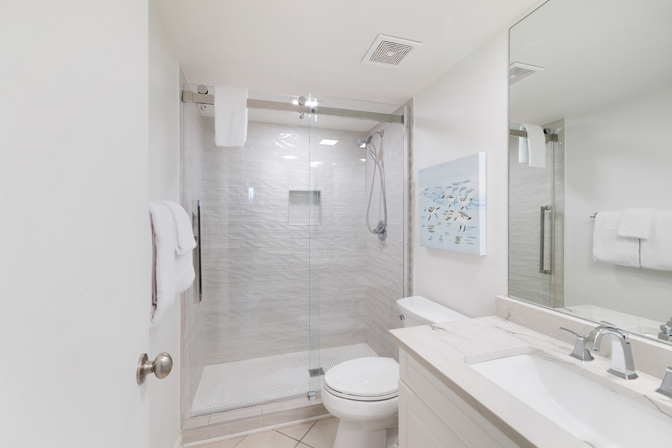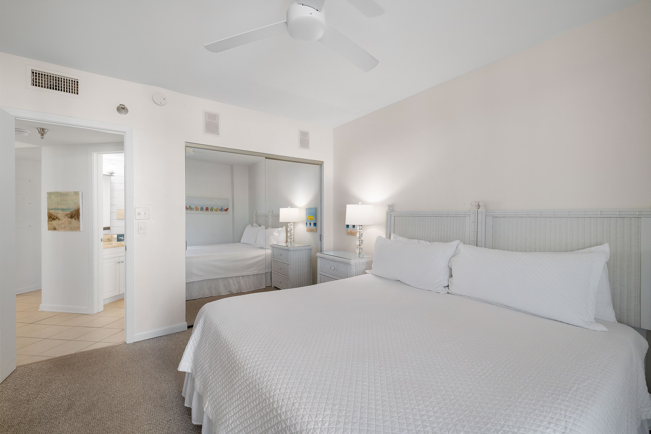 As you step inside, you'll be greeted by a spacious and beautifully appointed living space, designed to be your home away from home. The Primary suite is a luxurious retreat, featuring a comfortable King bed and a private bath with a tiled walk-in shower. Additionally, the Primary suite boasts a 50-inch flat-screen TV, ensuring entertainment and relaxation during your stay.