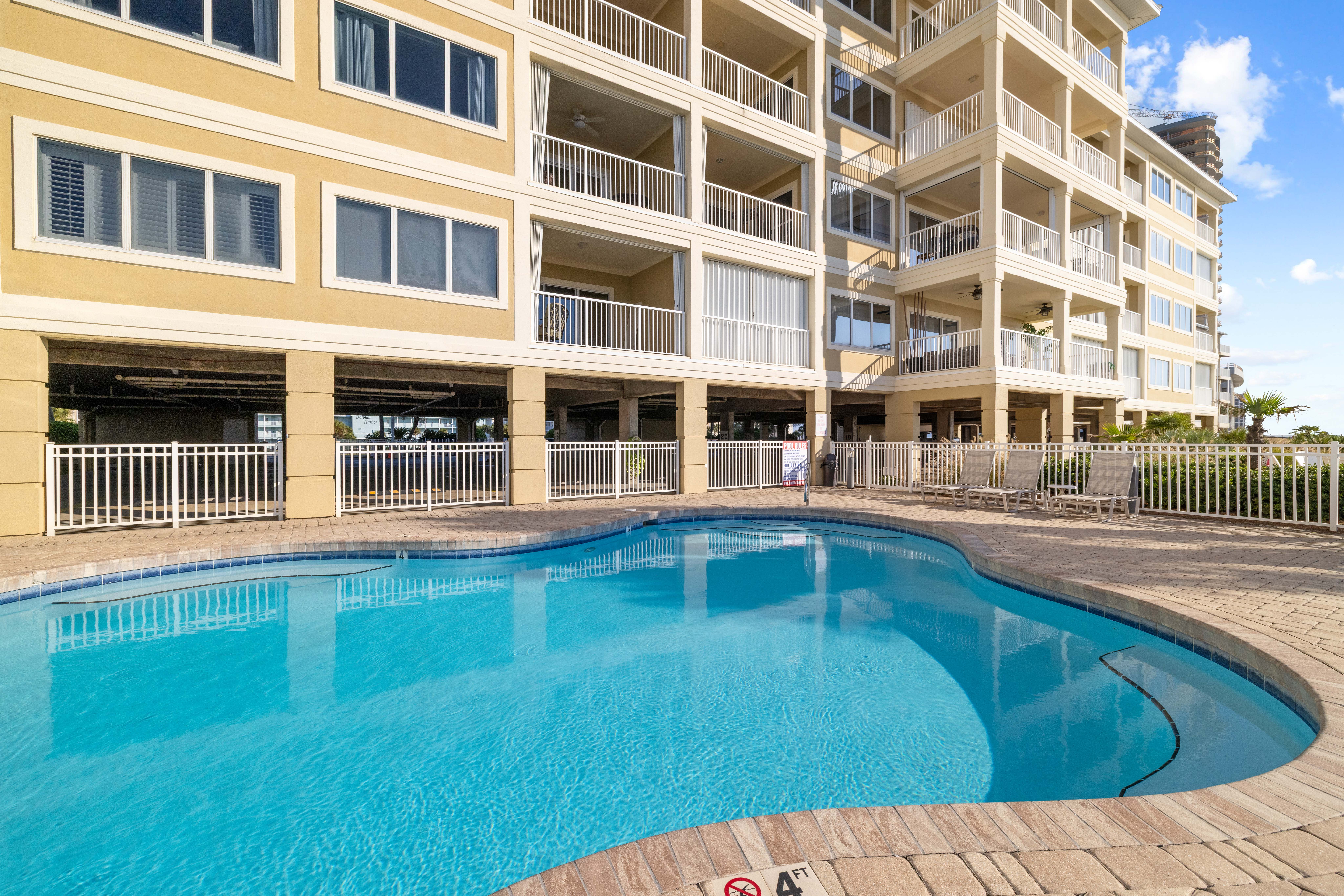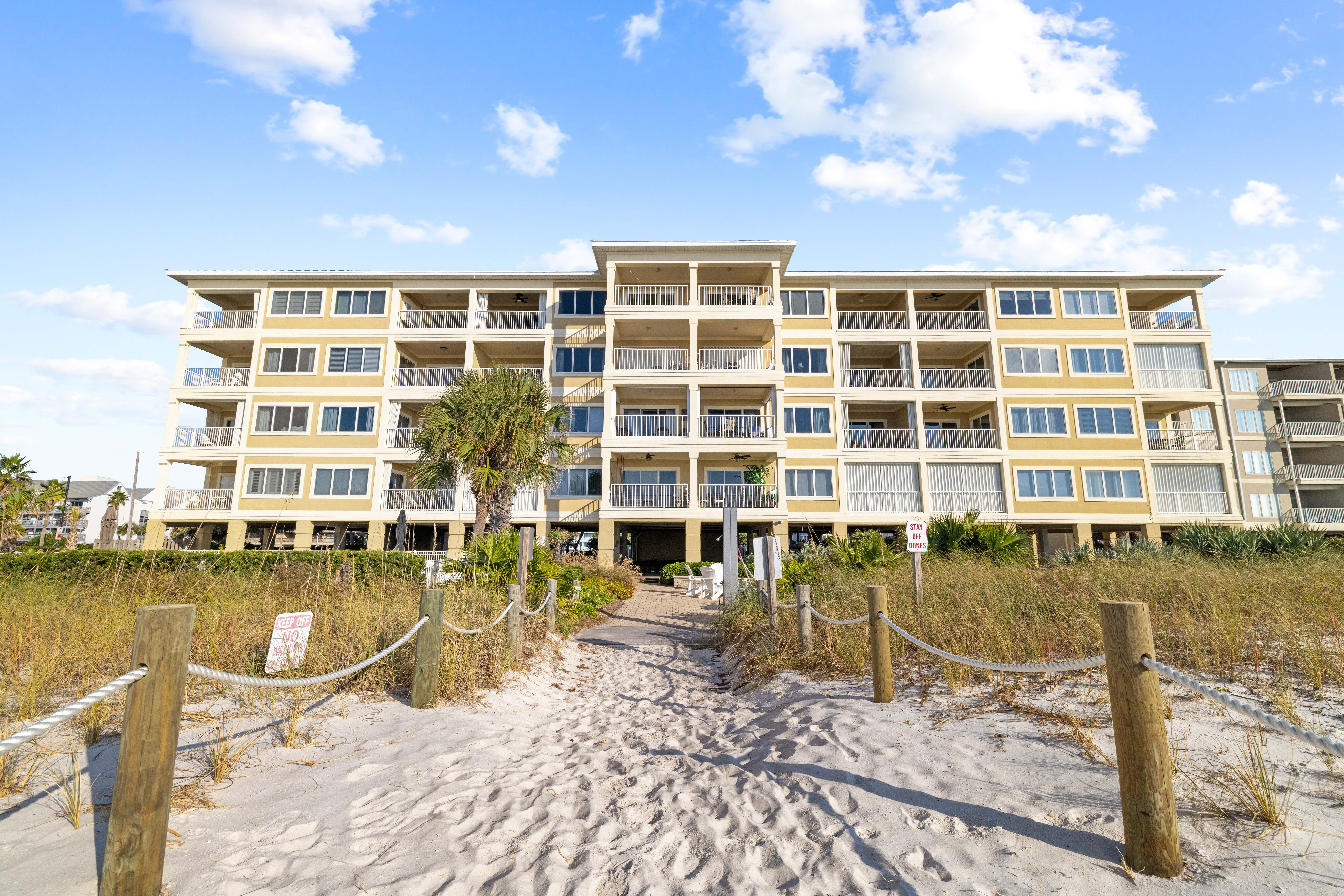 Each condo features a private balcony with stunning Gulf views, while shared amenities include an outdoor pool, boardwalk to the beach, and a BBQ area for outdoor dining.